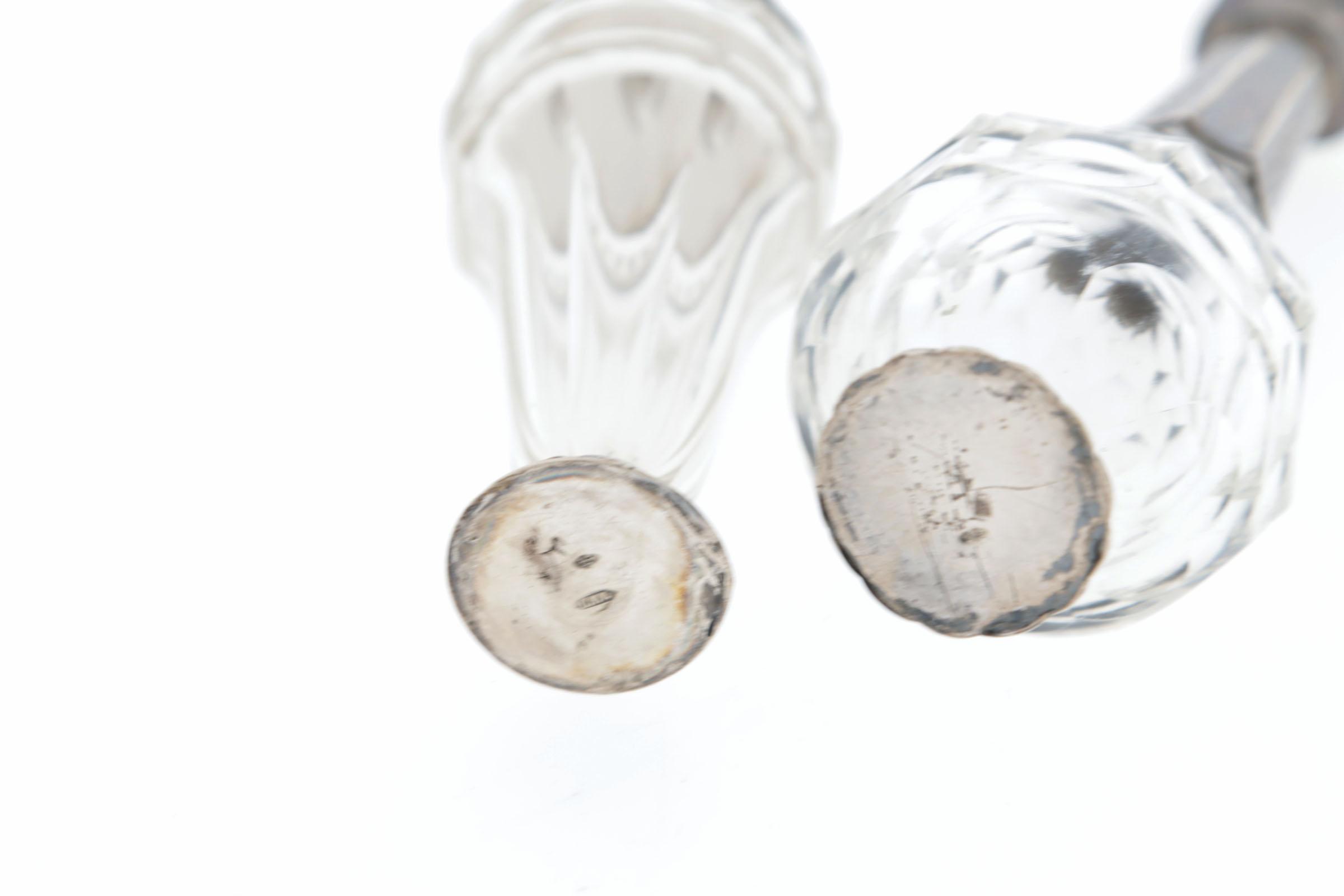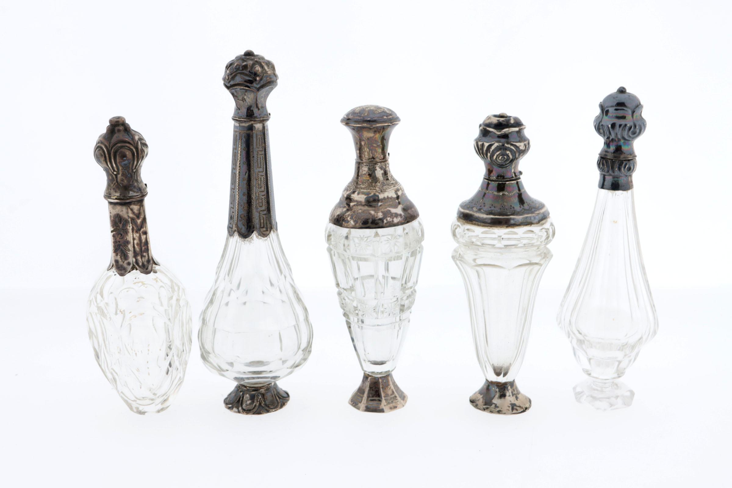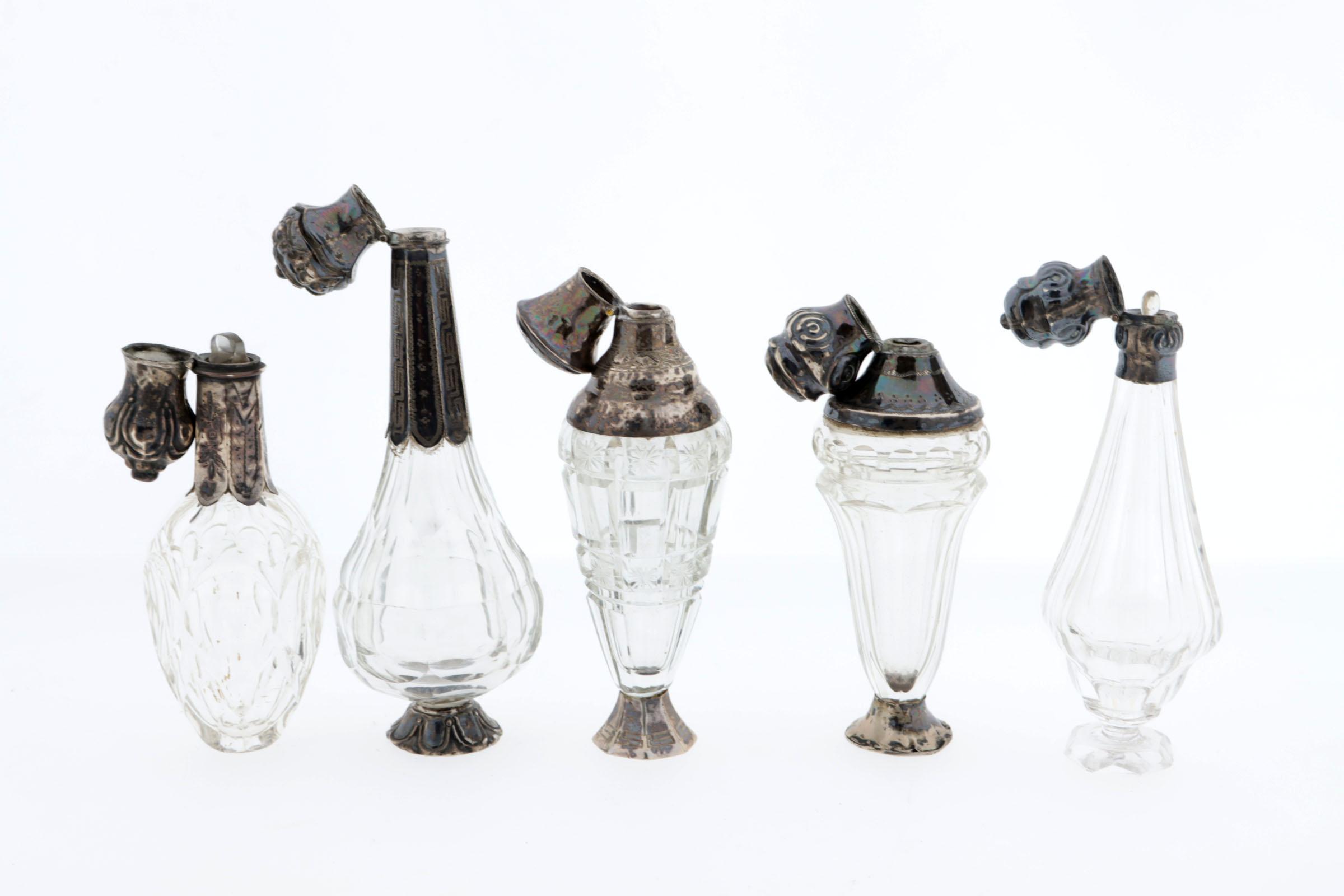 5 kristallen parfumflesjes, waarvan 3 met zilveren voetjes en -doppen, waaronder een staand ei-vormig model, 6-kantig geslepen, scharnierende dop, Nederlands gekeurd, rond 1850, hoogte 11 cm, één 6-kantige flacon op voetje, Nederlands gekeurd, zwaardje, merkmaker "JVS", rond 1850, hoogte 12 cm