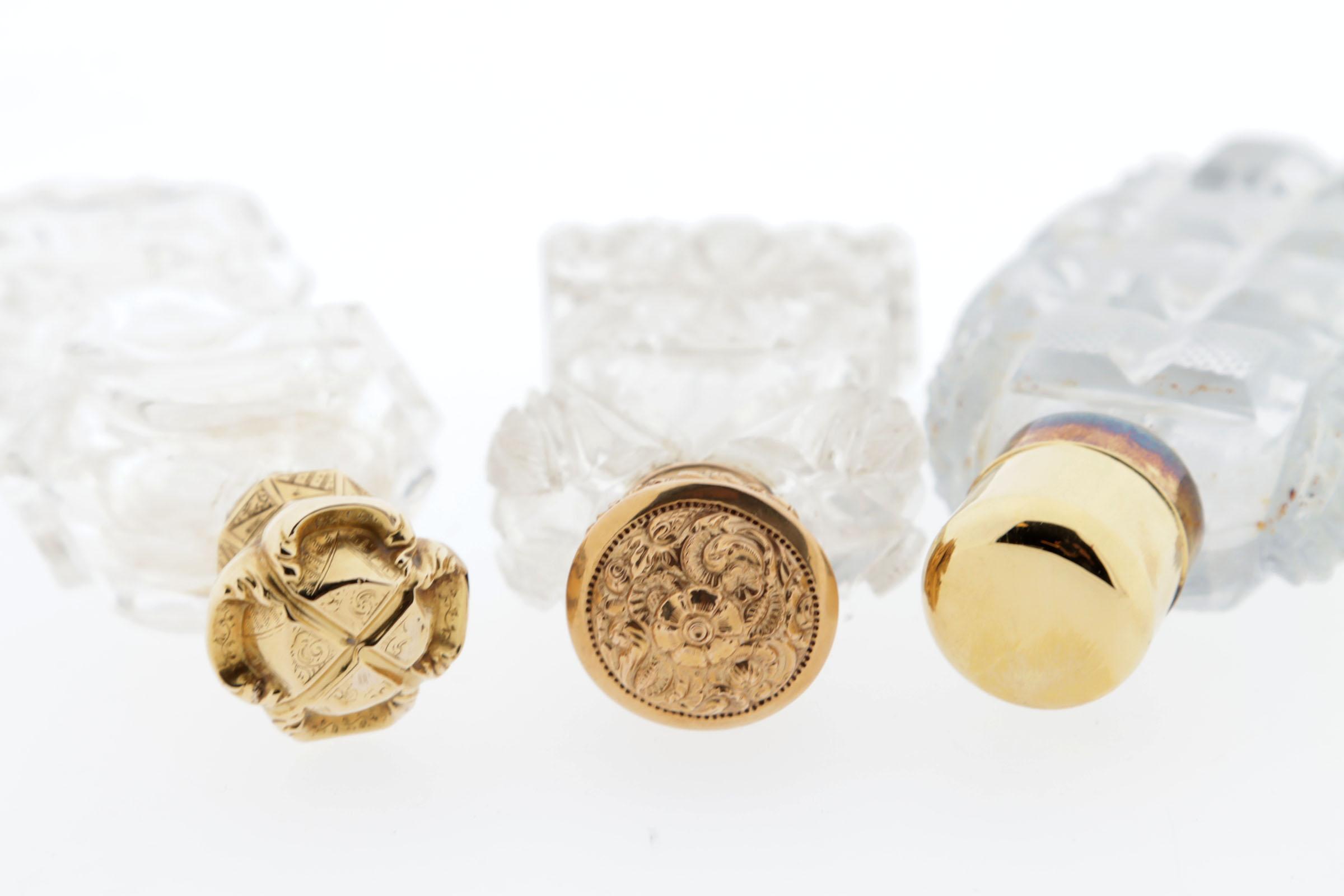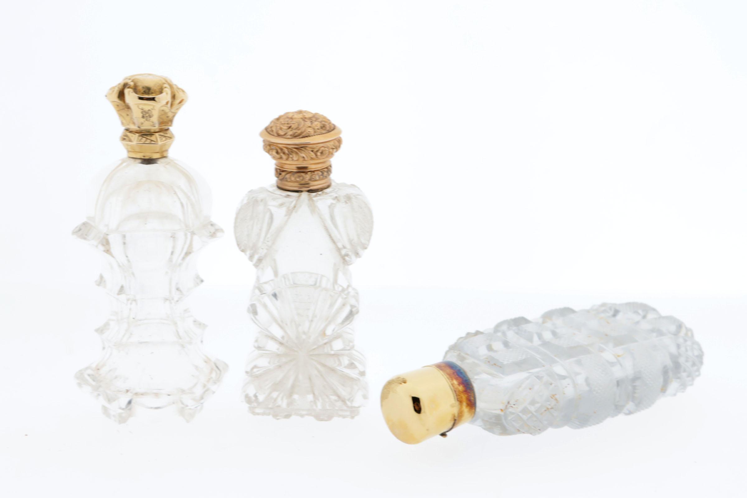 3 kristallen parfumflacons, waaronder 1 forse kristallen flacon, geslepen in een geruit motief, gouden scharnierende dop, Nederlands keur, eikenblad, kristal binnendop, rond 1850, 12x5,4 cm, 1 barok geslepen flacon, staand, scharnierende gouden dop met bloem- en bladmotieven, Nederlands keur ( leeuwenkop), rond 1850, hoogte 9,8 cm, 1 fraai geslepen flacon, met 750/000 gouden montuur, binnenstopje met goud, Nederlands gekeurd, omstreeks 1870, hoogte 10,8 cm