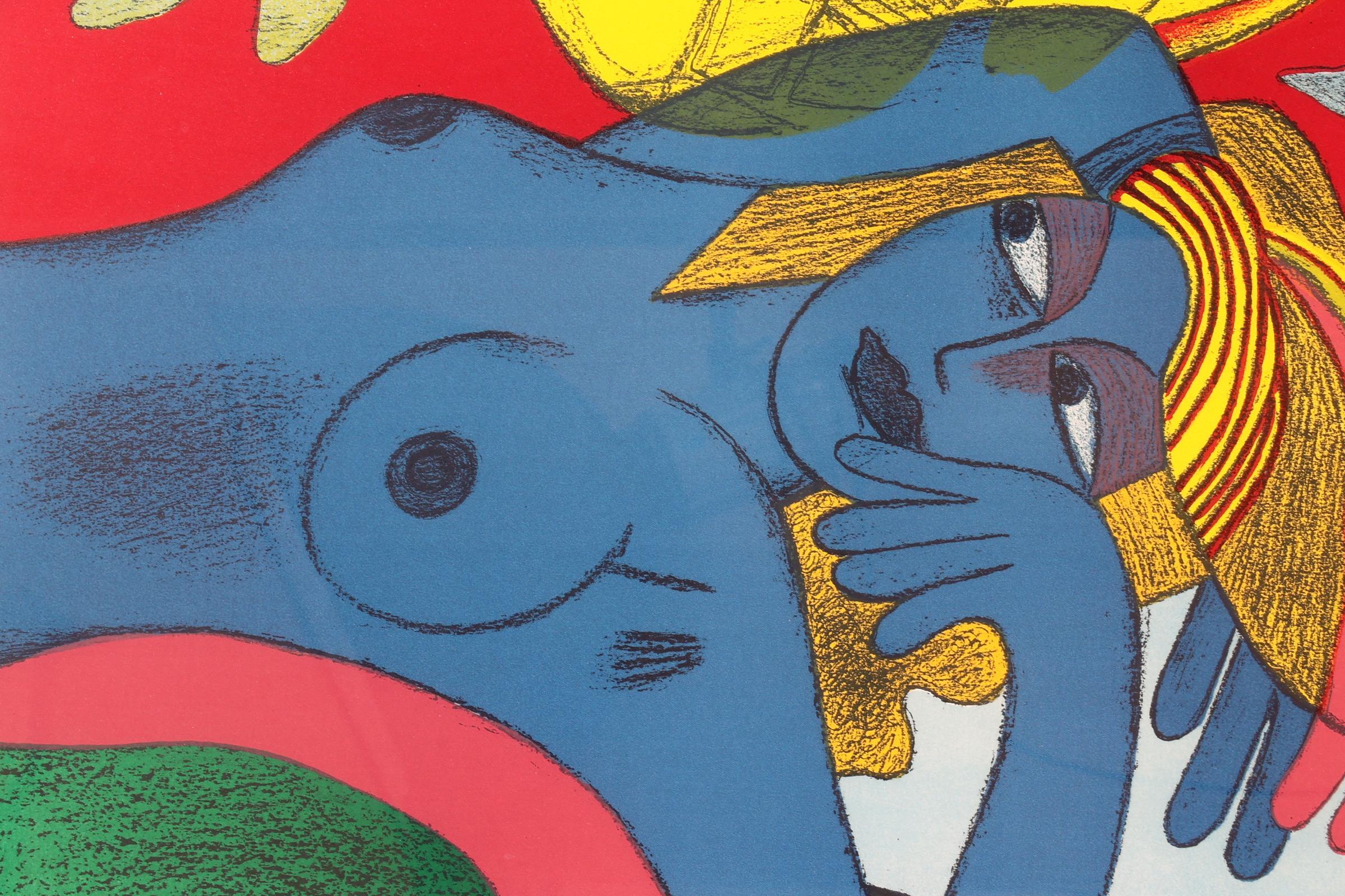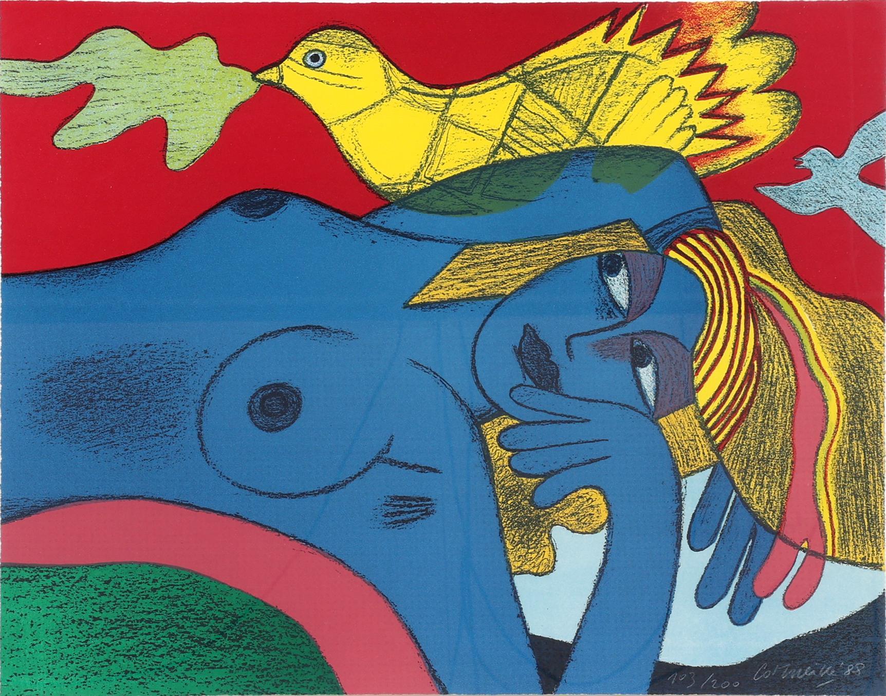 'Corneille', alias van Cornelis Guillaume van Beverloo, (1922- 2010), Blauw vrouw met gele vogel, handgesigneerde lithorafie, nr.103/200, gedateerd 1988, 65 x 52 cm.