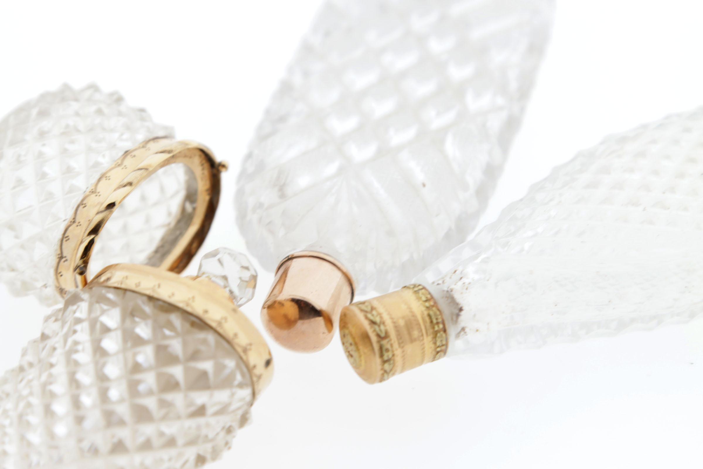 3 geslepen kristallen flessen,waaronder: 1 Georgean fles, gouden dop, hoogte 10 cm, 1 elypsvormige fles, rondom geslepen, tweekleurige gouden schroefdop met bladmotieven, Frans, 1800, hoogte 11 cm, 1 staande flacon, rondom geslepen, gouden montuur en kristallen binnendop, Nederlands goudkeurmerk, hoogte 9,4 cm