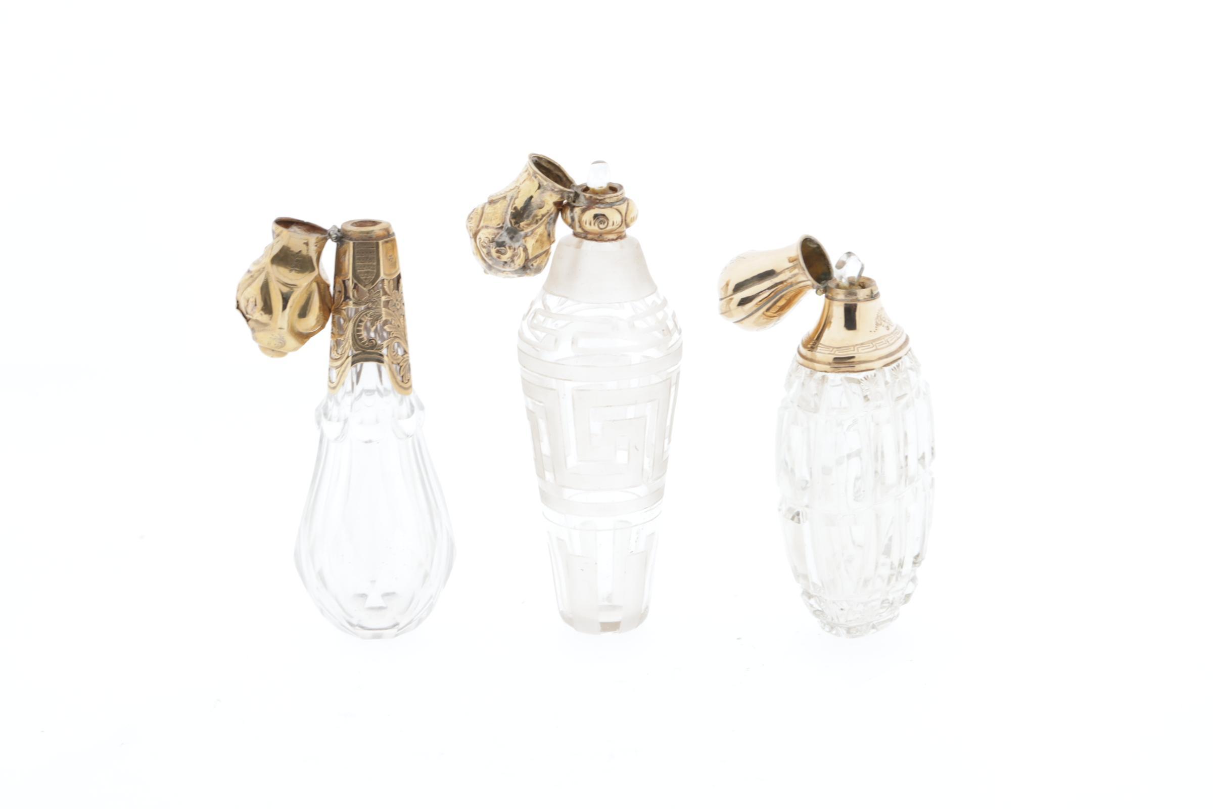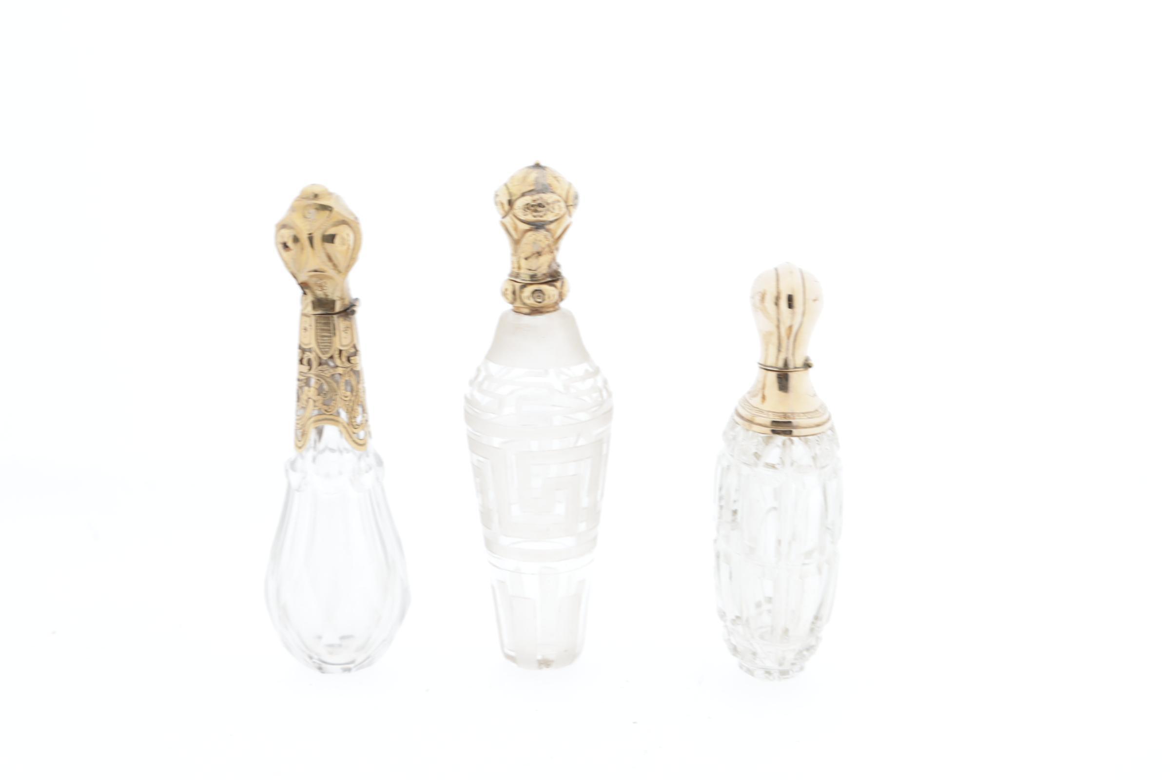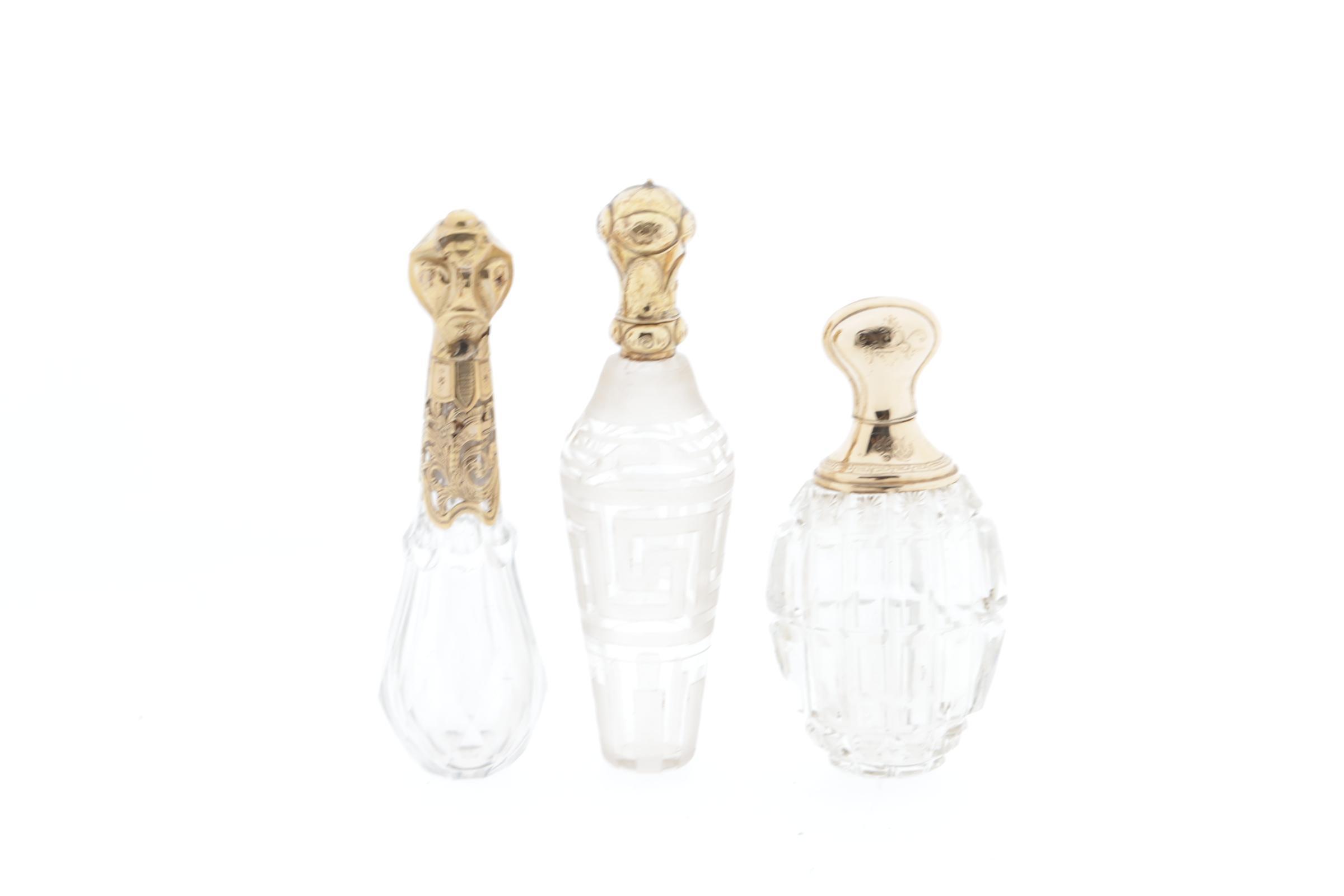 3 kristallen parfumflesjes, allen met gouden scharnierende dop, 2 met kristallen binnendop, 1 fles met meander-achtige graveringen rand, eikenkeur, Nederlands, 19e eeuw, hoogte 11,2 cm, 1 flacon met horizontale en verticale lijnen geslepen, dop met Griekse rand, Nederlands keur (eikenblad), hoogte 8,9 cm
