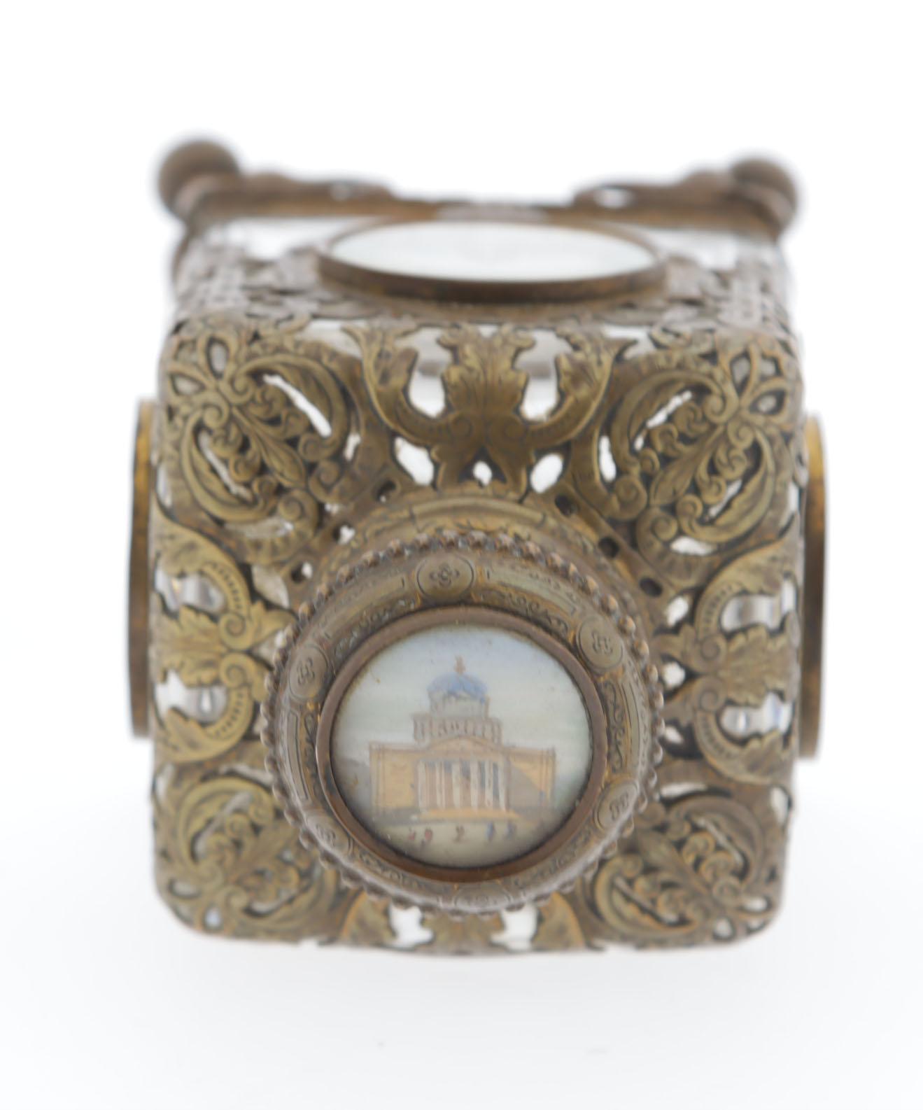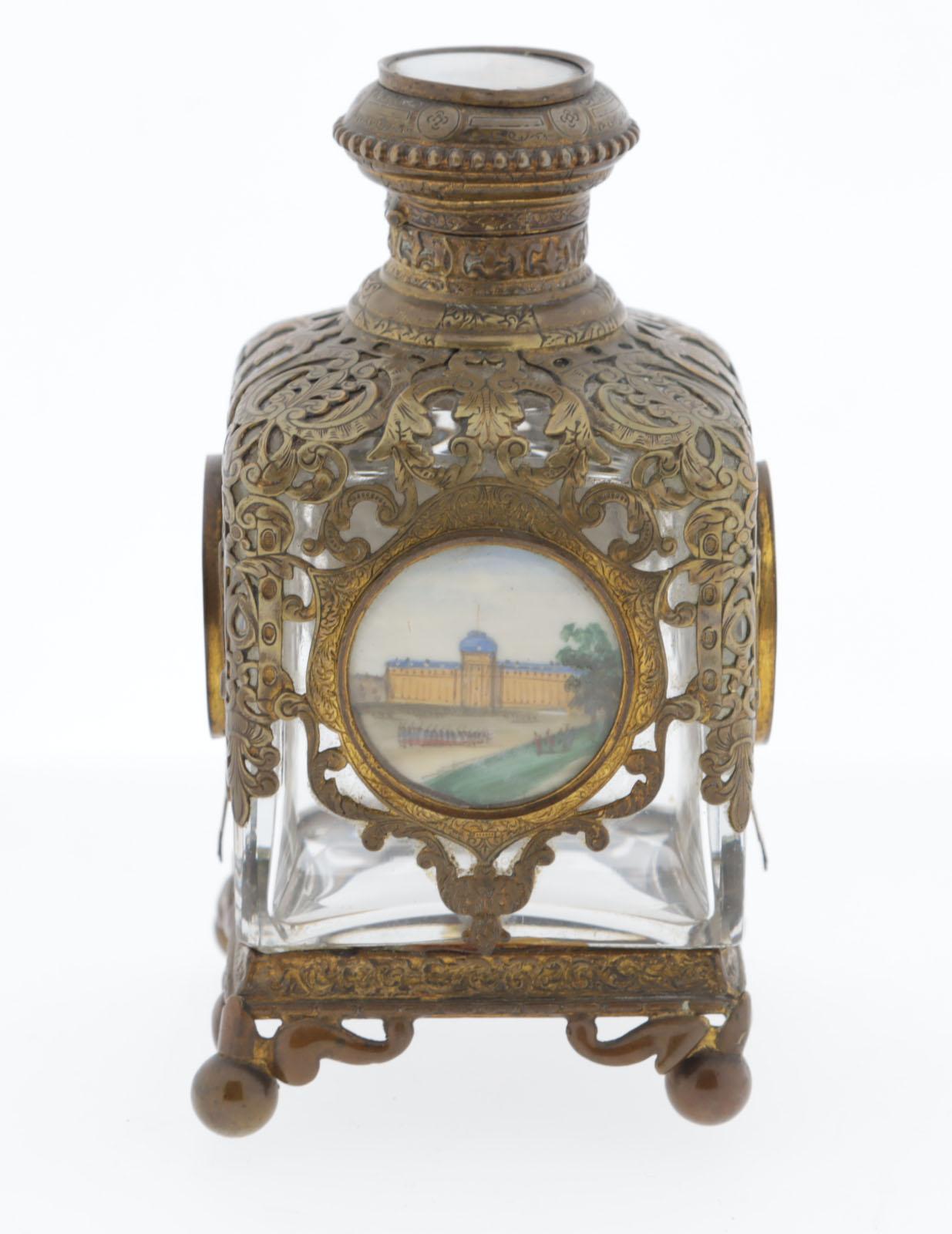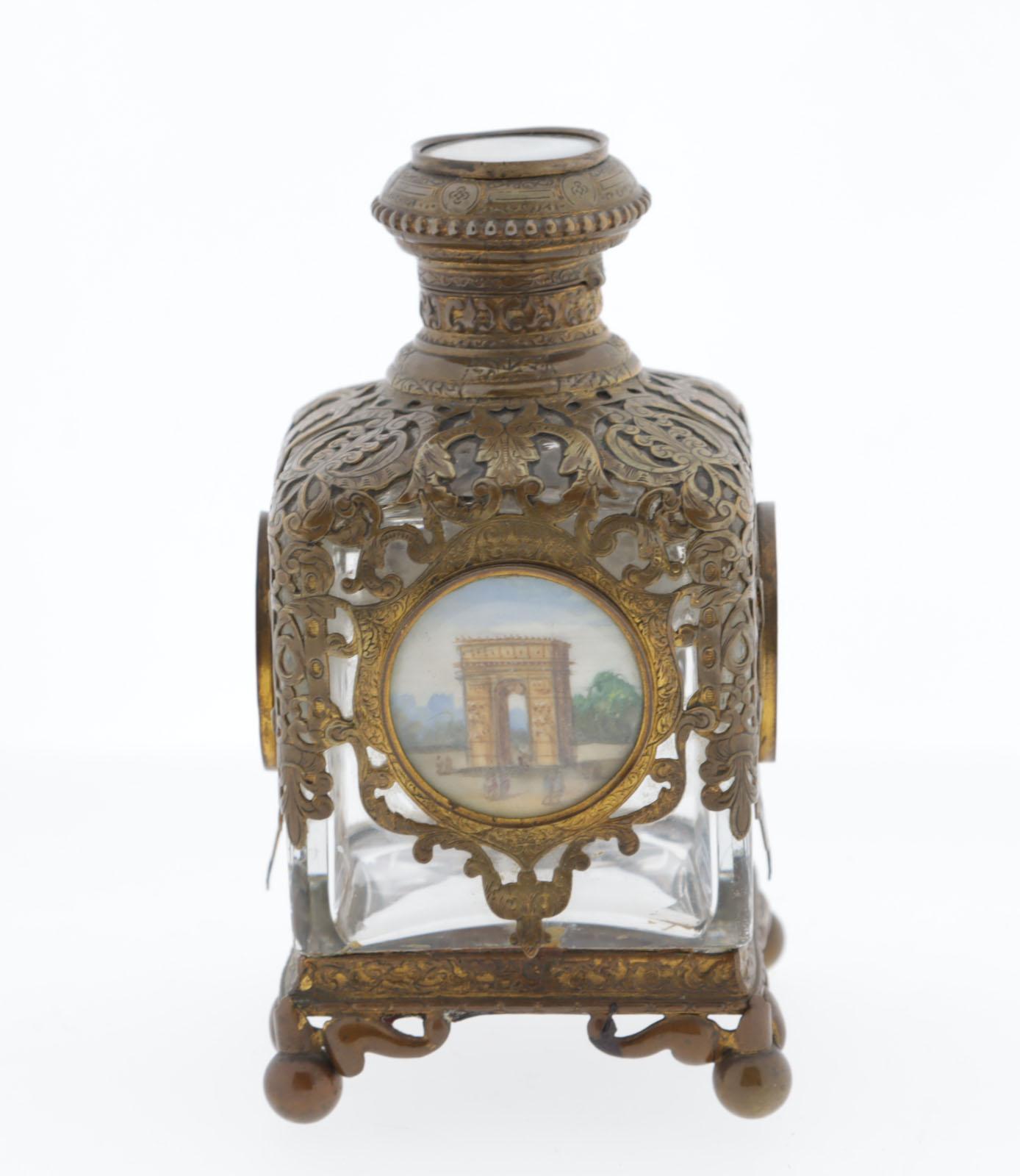 Antieke kristallen parfumfles, le Grand Tour, vuurverguld krullerig messing met daarin verwerkt schilderijtjes van bekende Parijse gebouwen, scharnierende dop met kristallen stopje, 60 x 60 x 12 cm, rond 1880