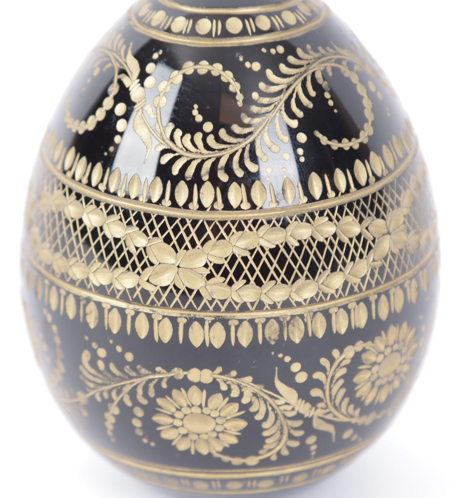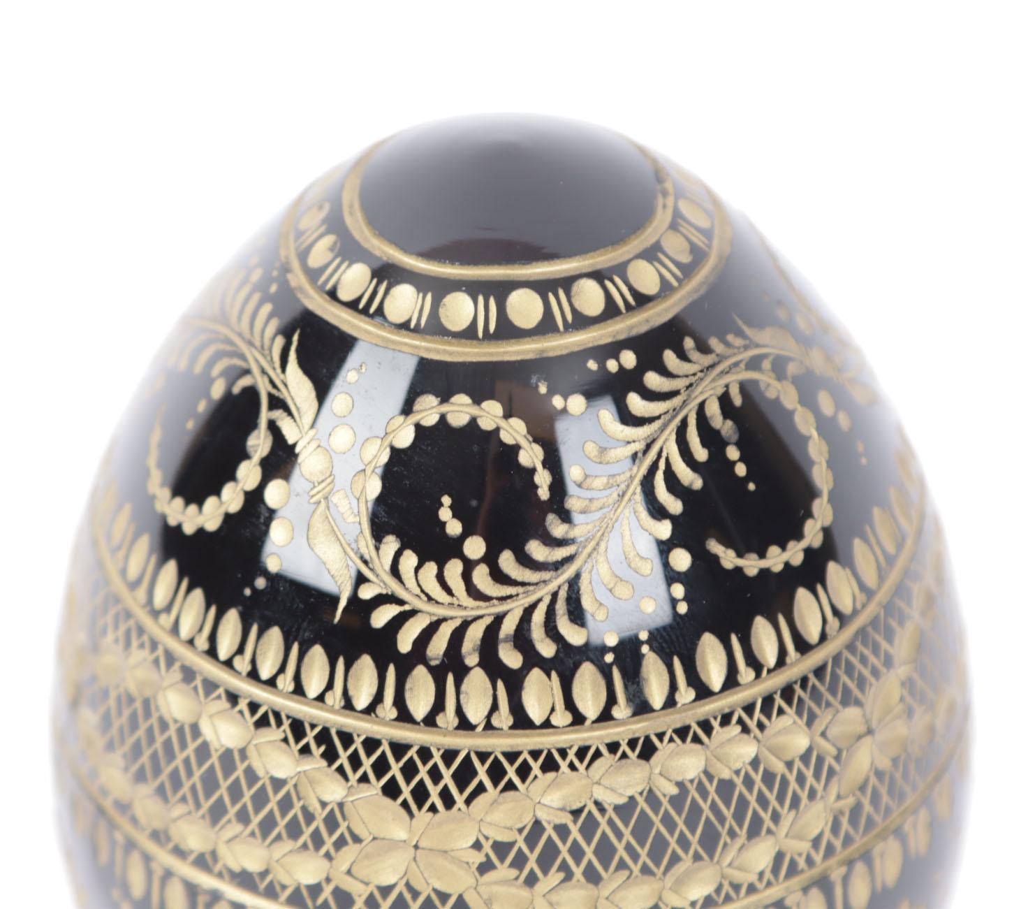 Zwart met goudkleurig glazen Fabergé ei, h.9 cm.