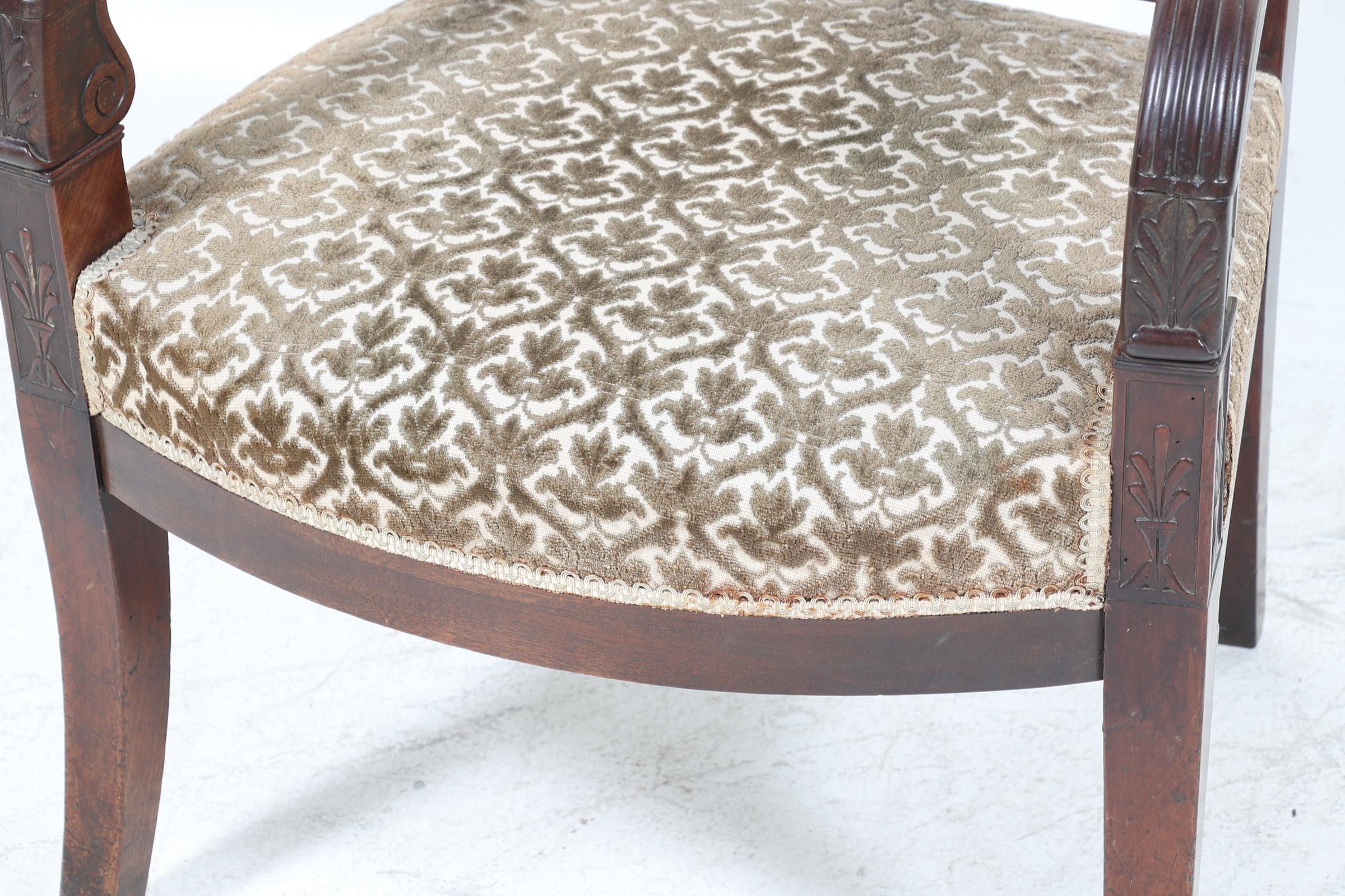 Antieke mahoniehouten empire armfauteuil met bruine stof bekleed