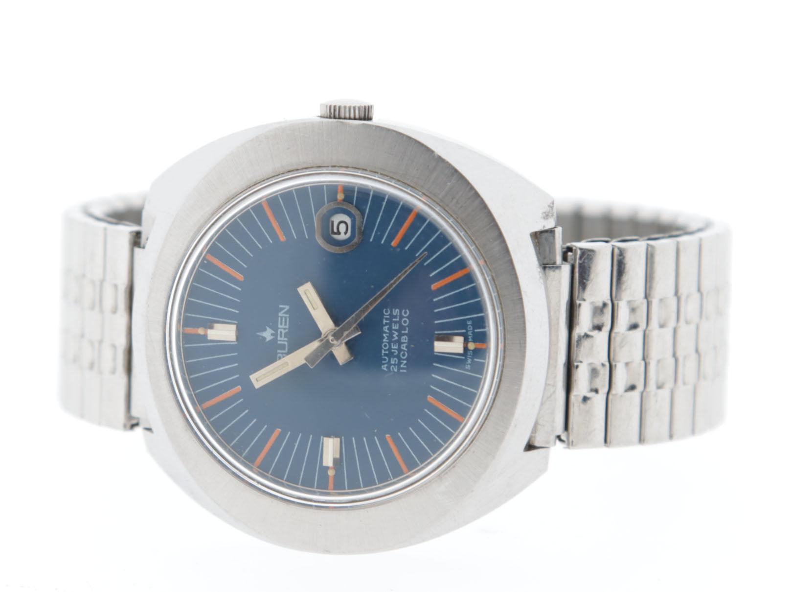 Vintage Buren, Zwitsers automatisch herenpolshorloge, 25 jewels, met zeer fraaie blauw kleurige wijzerplaat met oranje uurwijzers en dag aanduiding