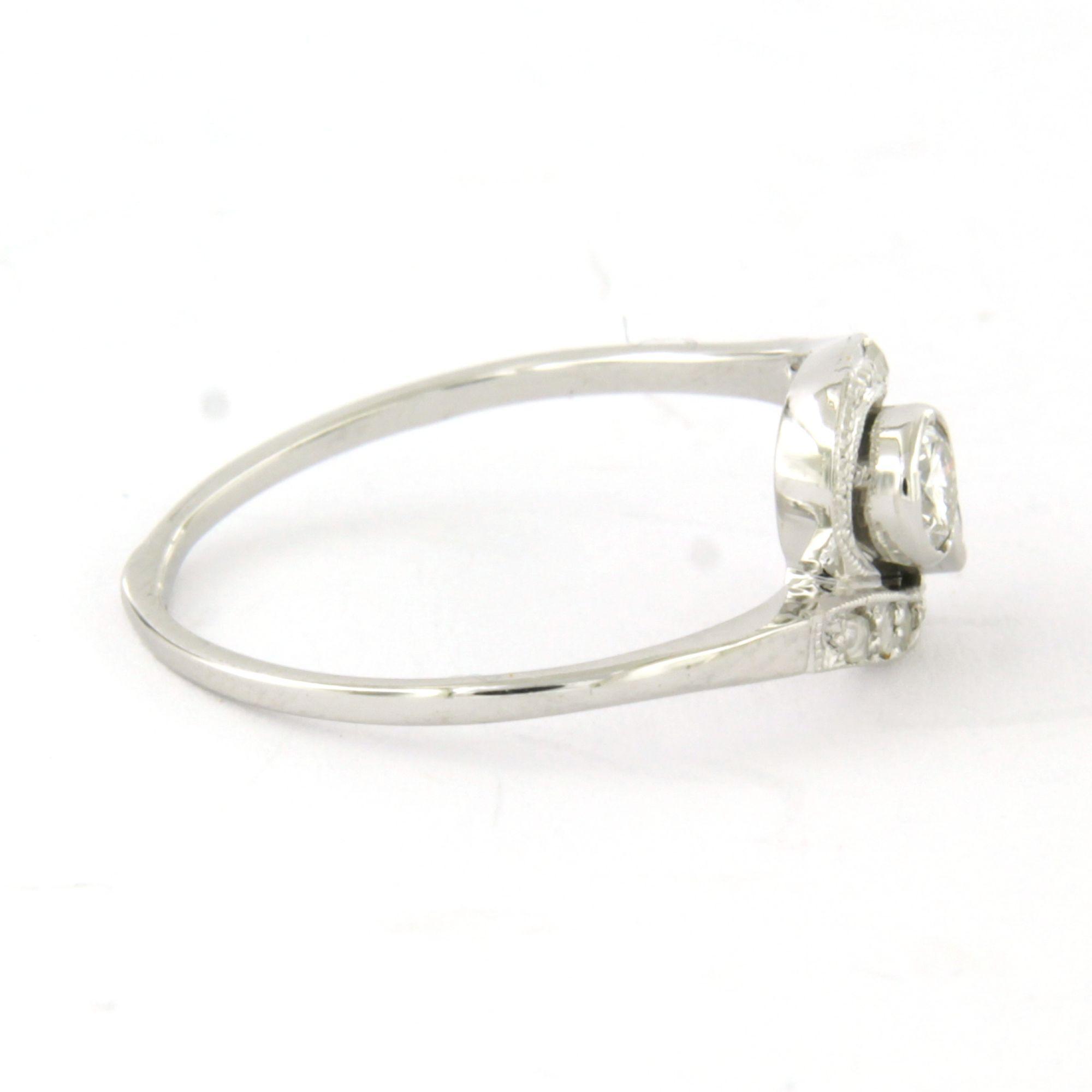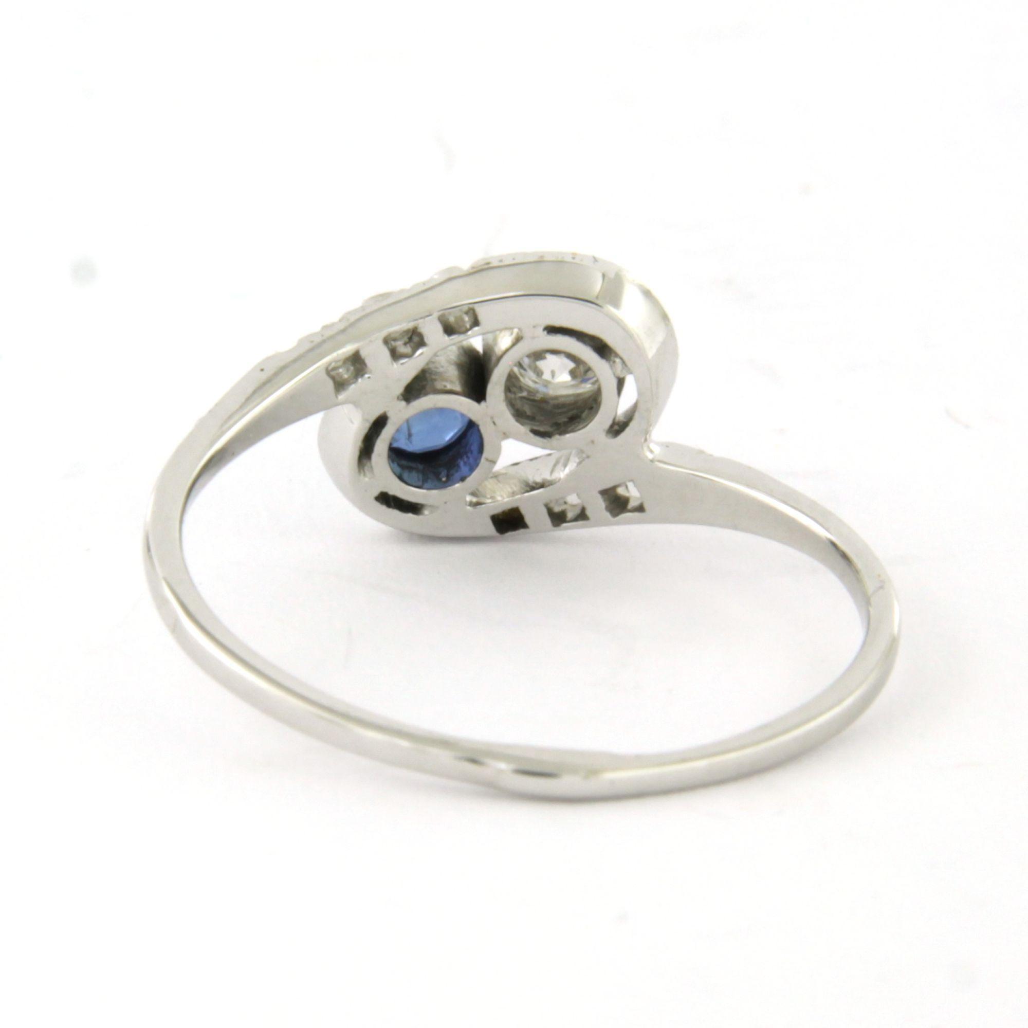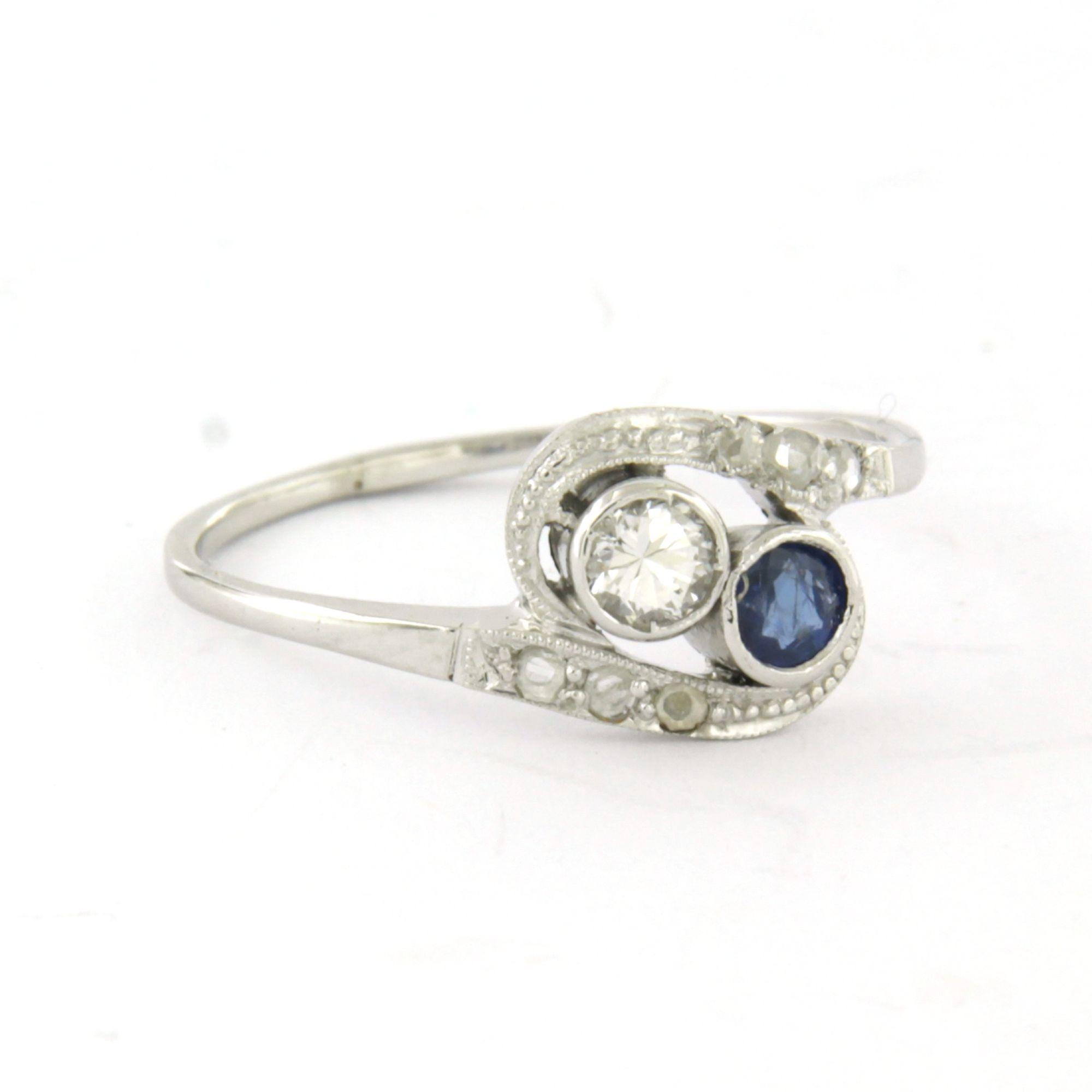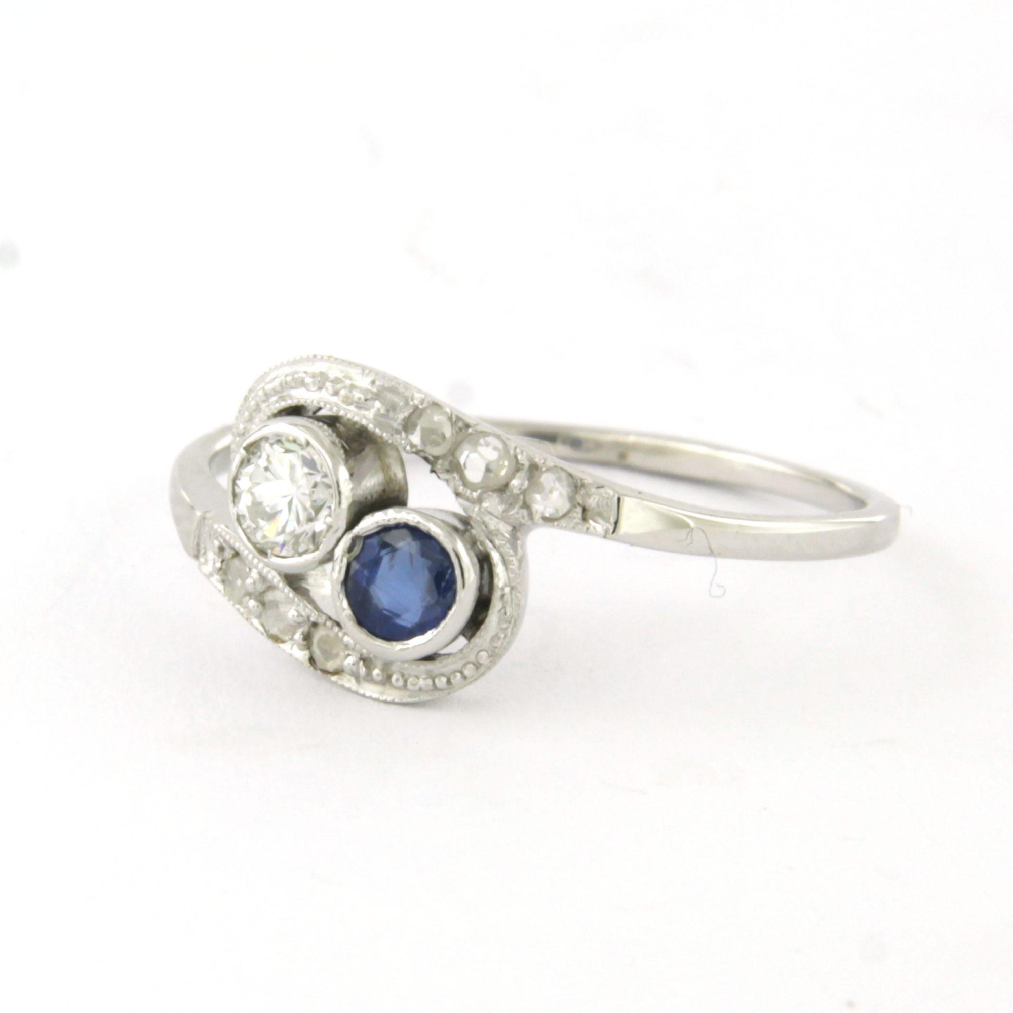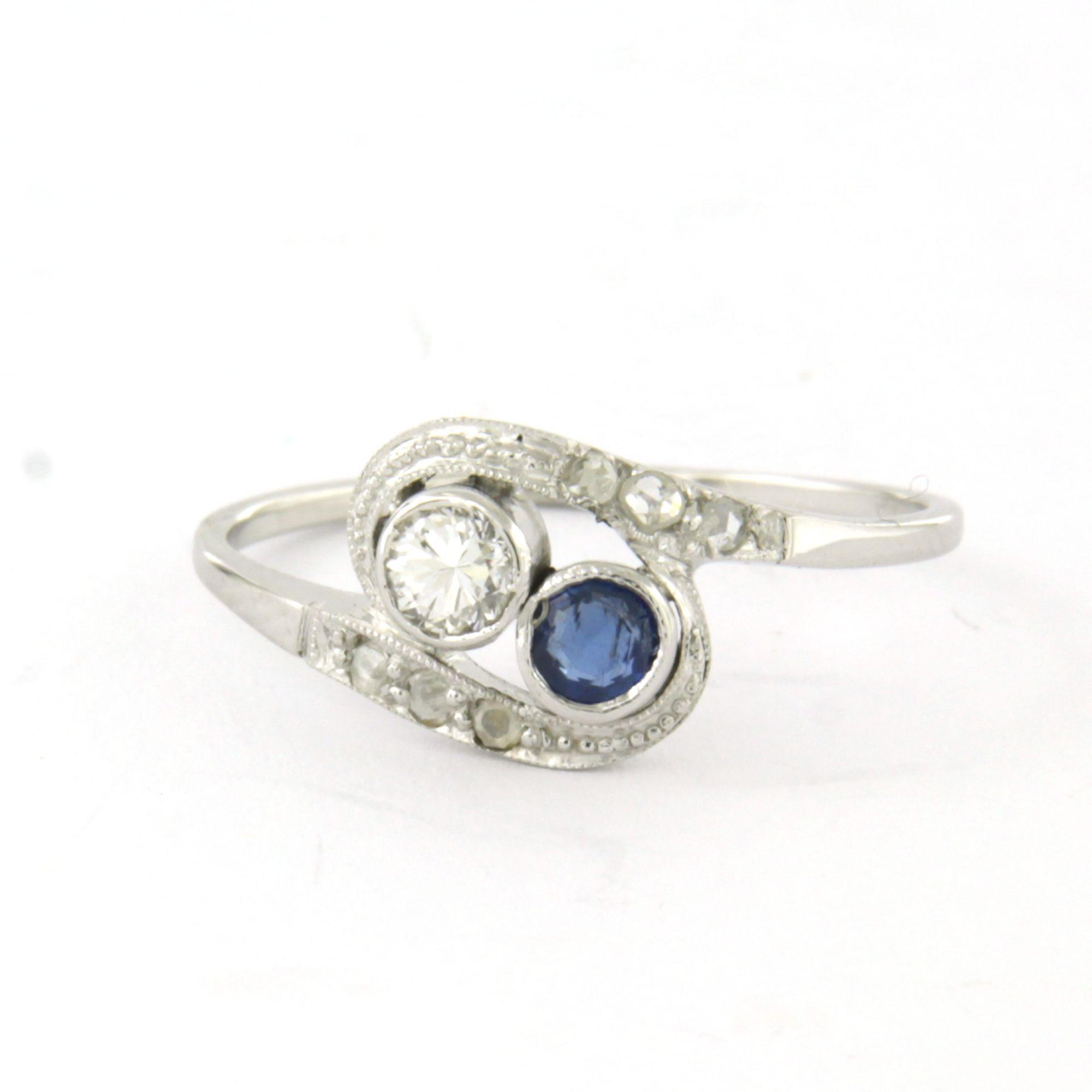 18 Kt. witgouden ring bezet met saffier en briljant geslepen en roosgeslepen diamanten totaal 0.10 ct - ringmaat 16(50)