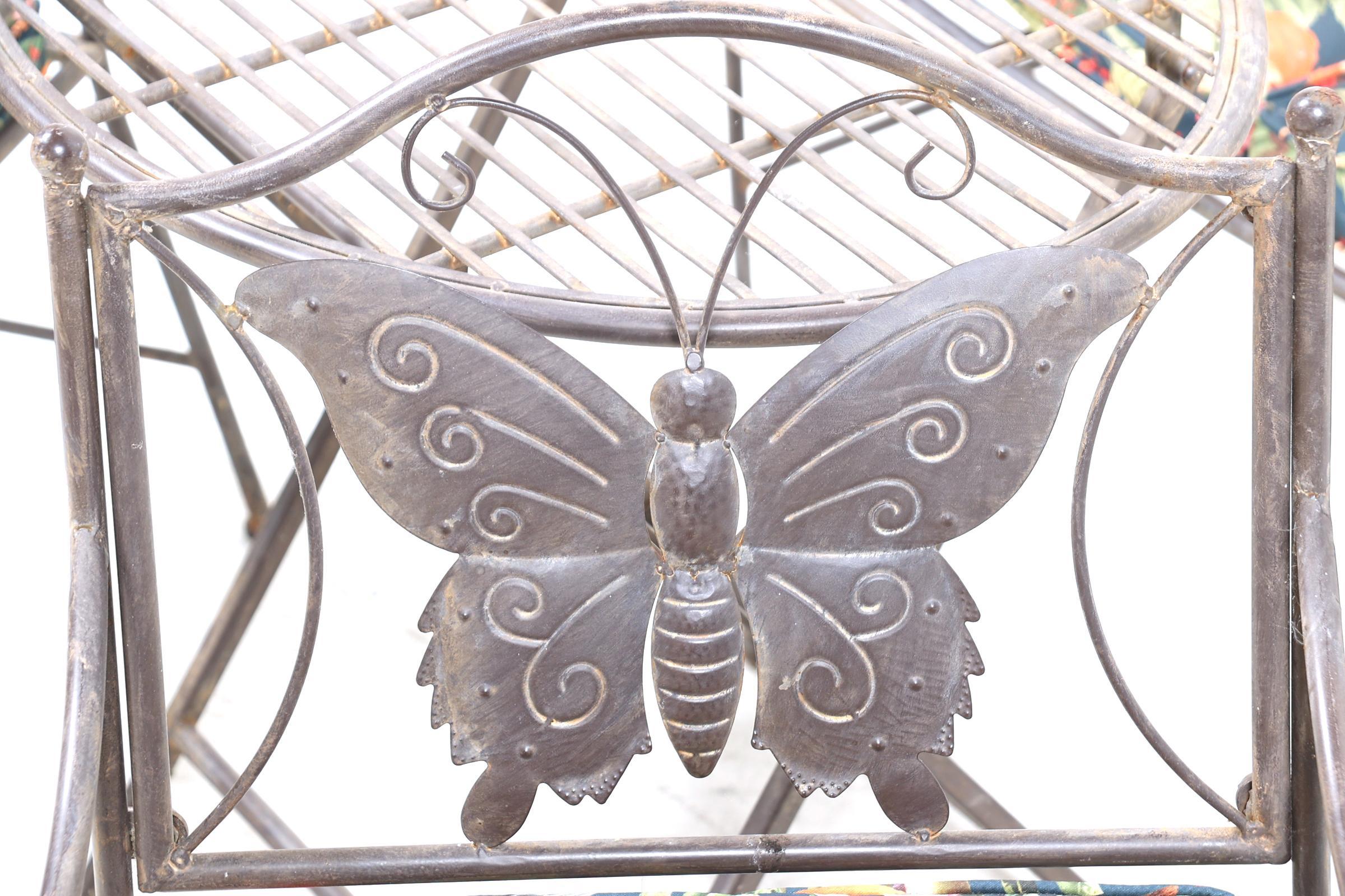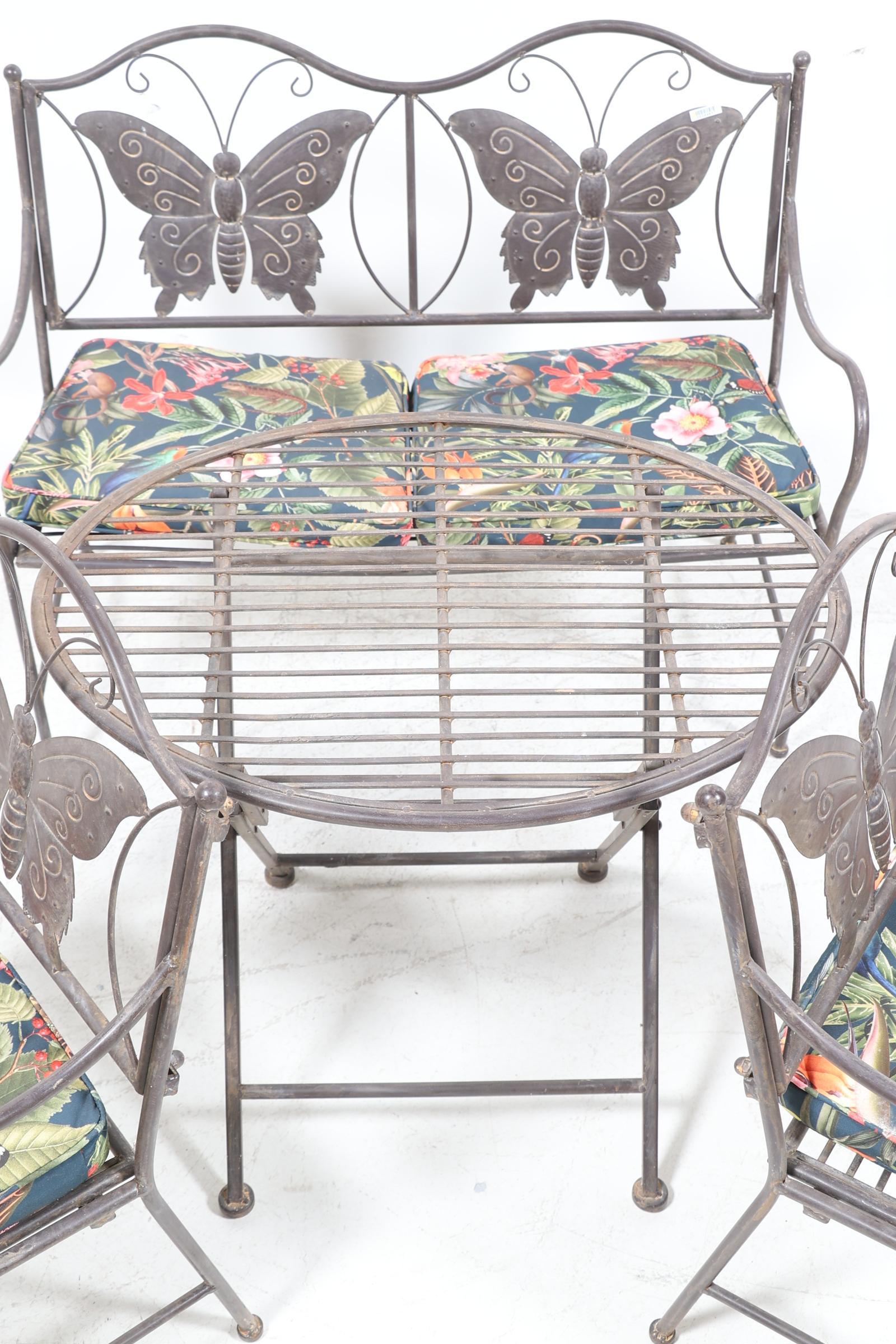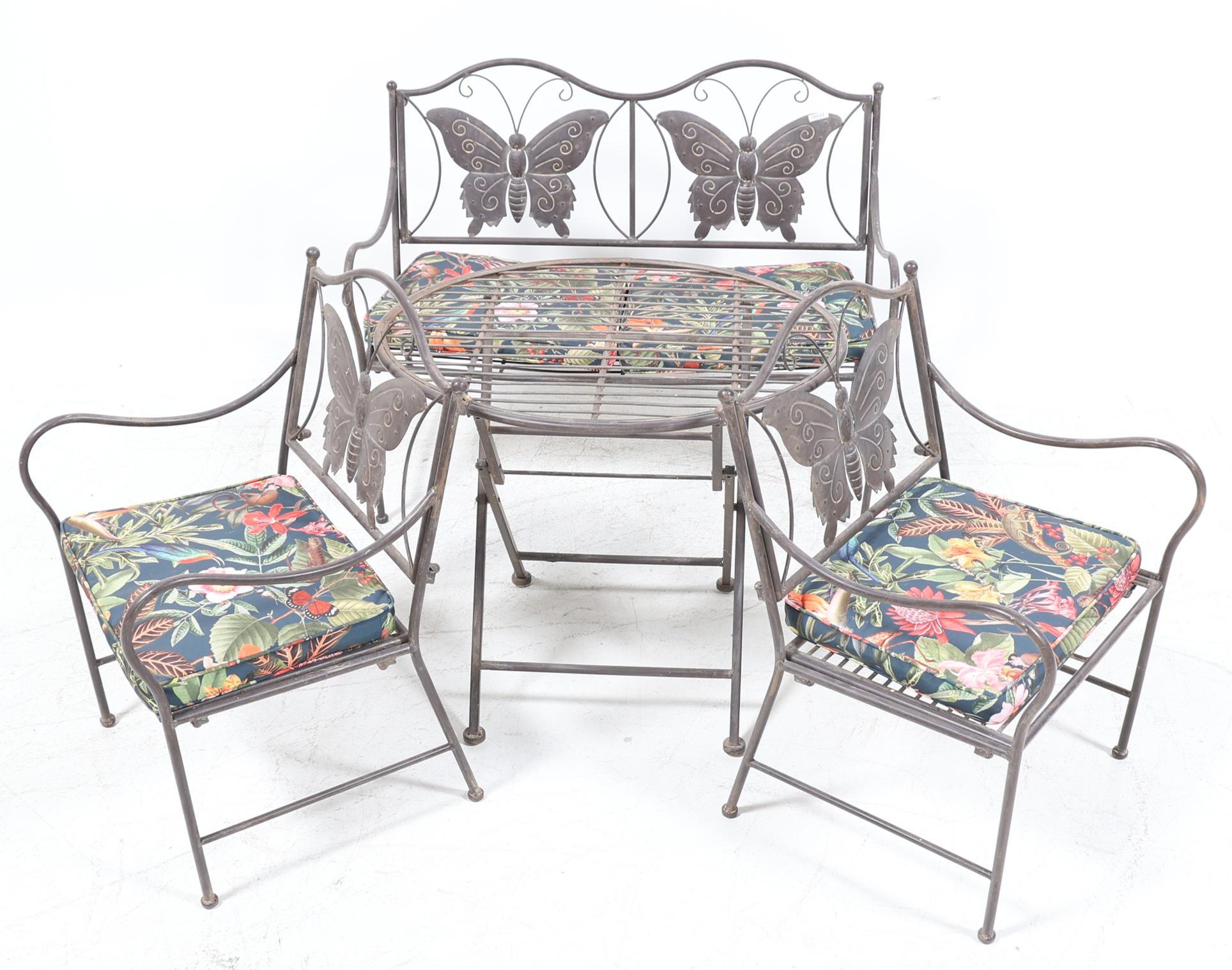 4-delige metalen kinder tuinset bestaande uit een bankje, 2 stoelen en tafel, en met kussen met daarop vogels en bloemen