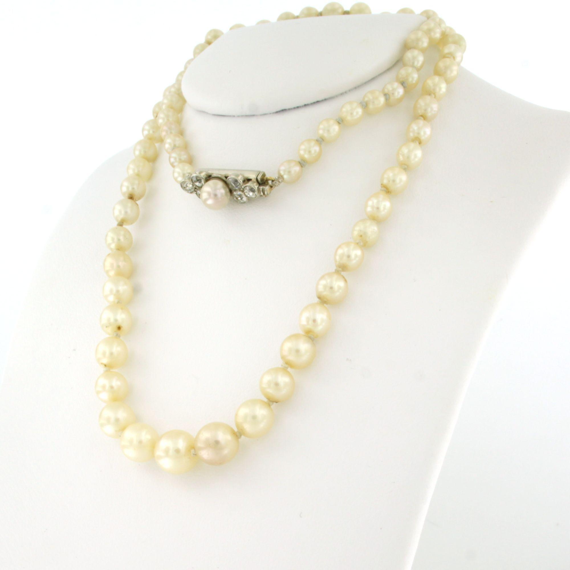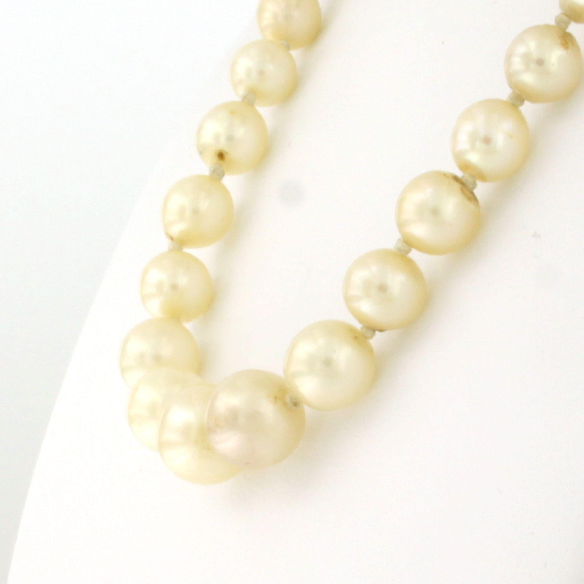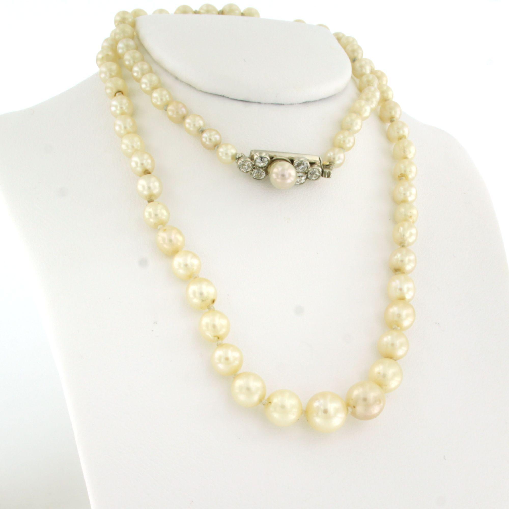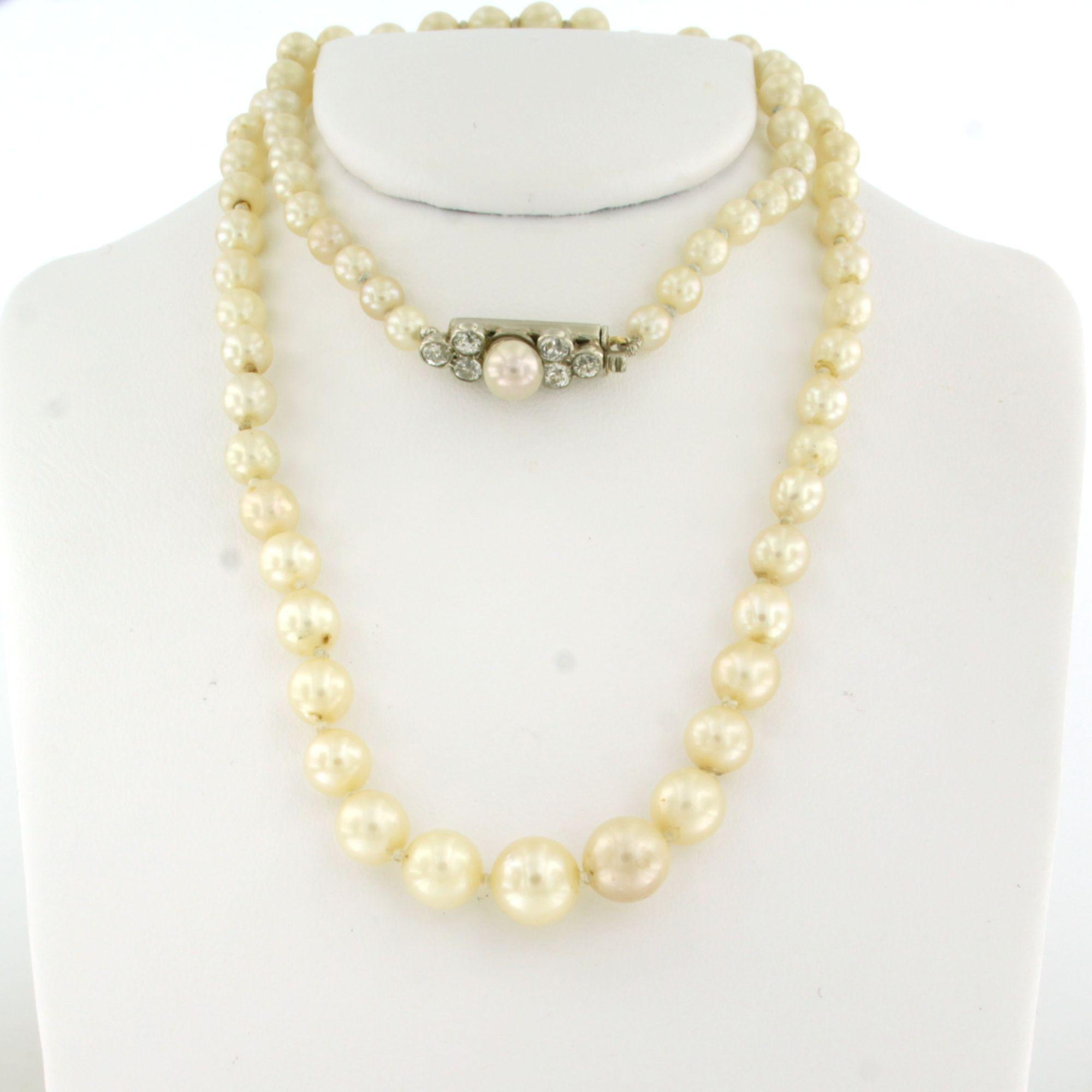 14 Kt. gouden met zilveren slot bezet met parel en diamant totaal 0.50ct, aan een parelcollier - 45 cm