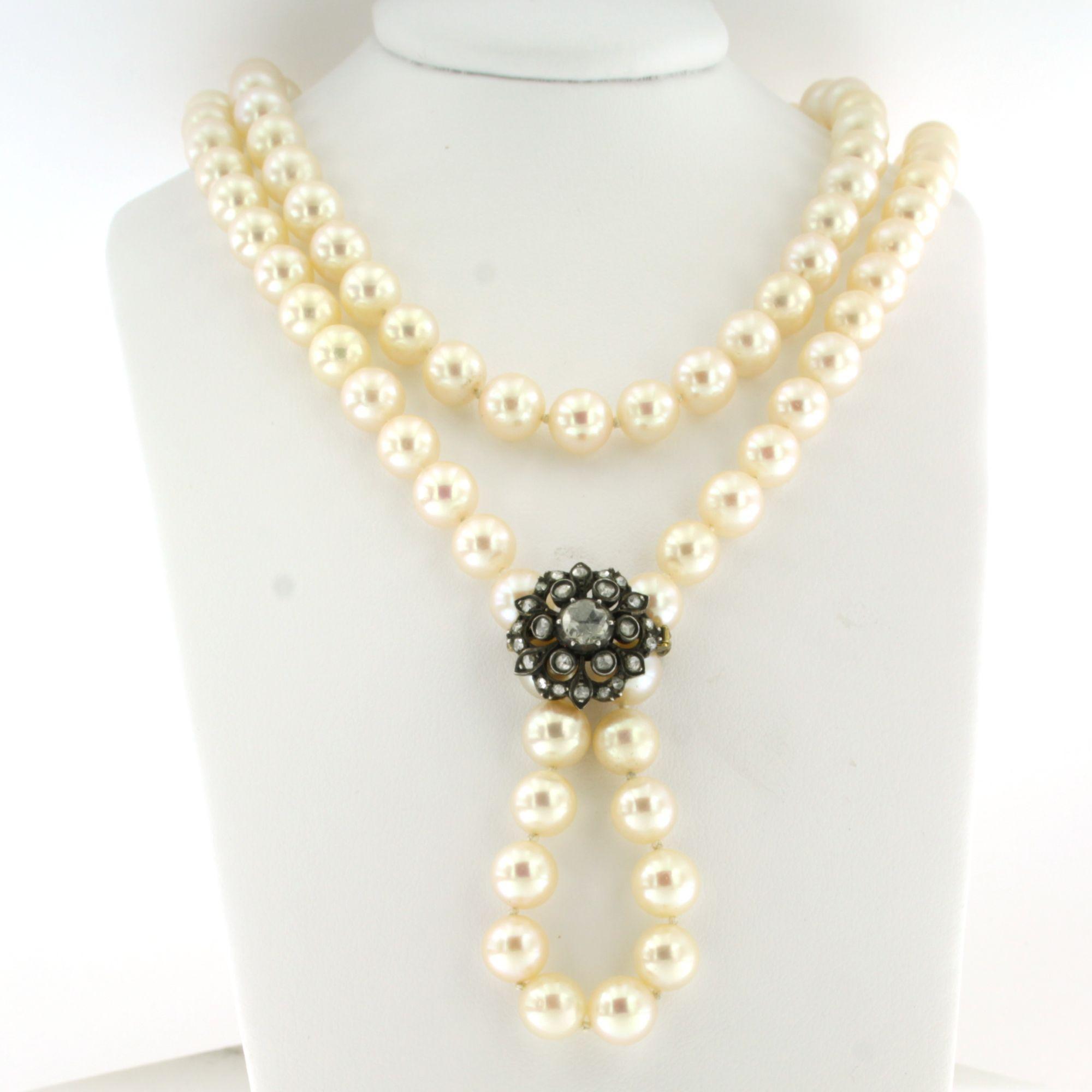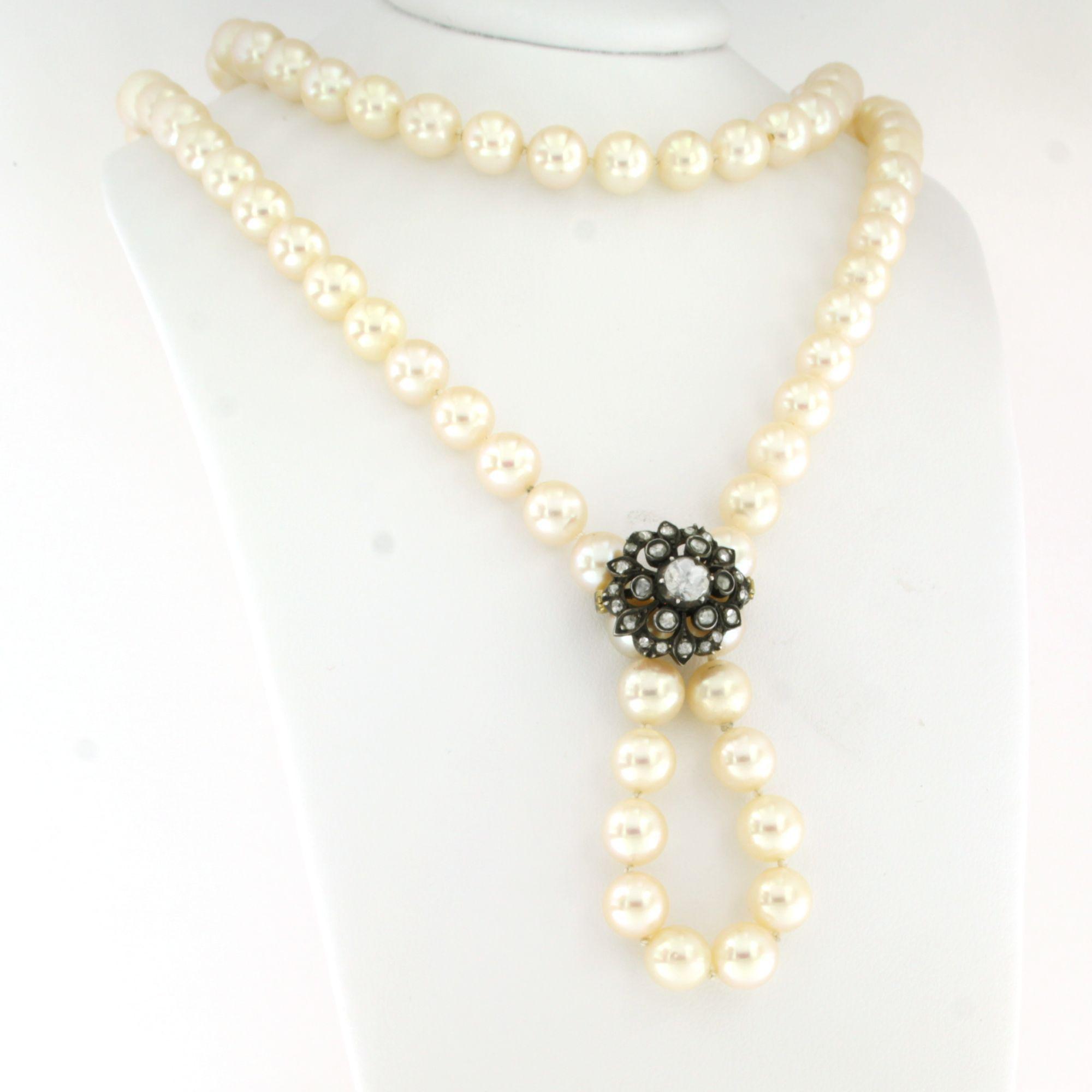 14 Kt. gouden met zilveren slot bezet met roos geslepen diamanten totaal 0.30ct, aan een parel collier - 75 cm