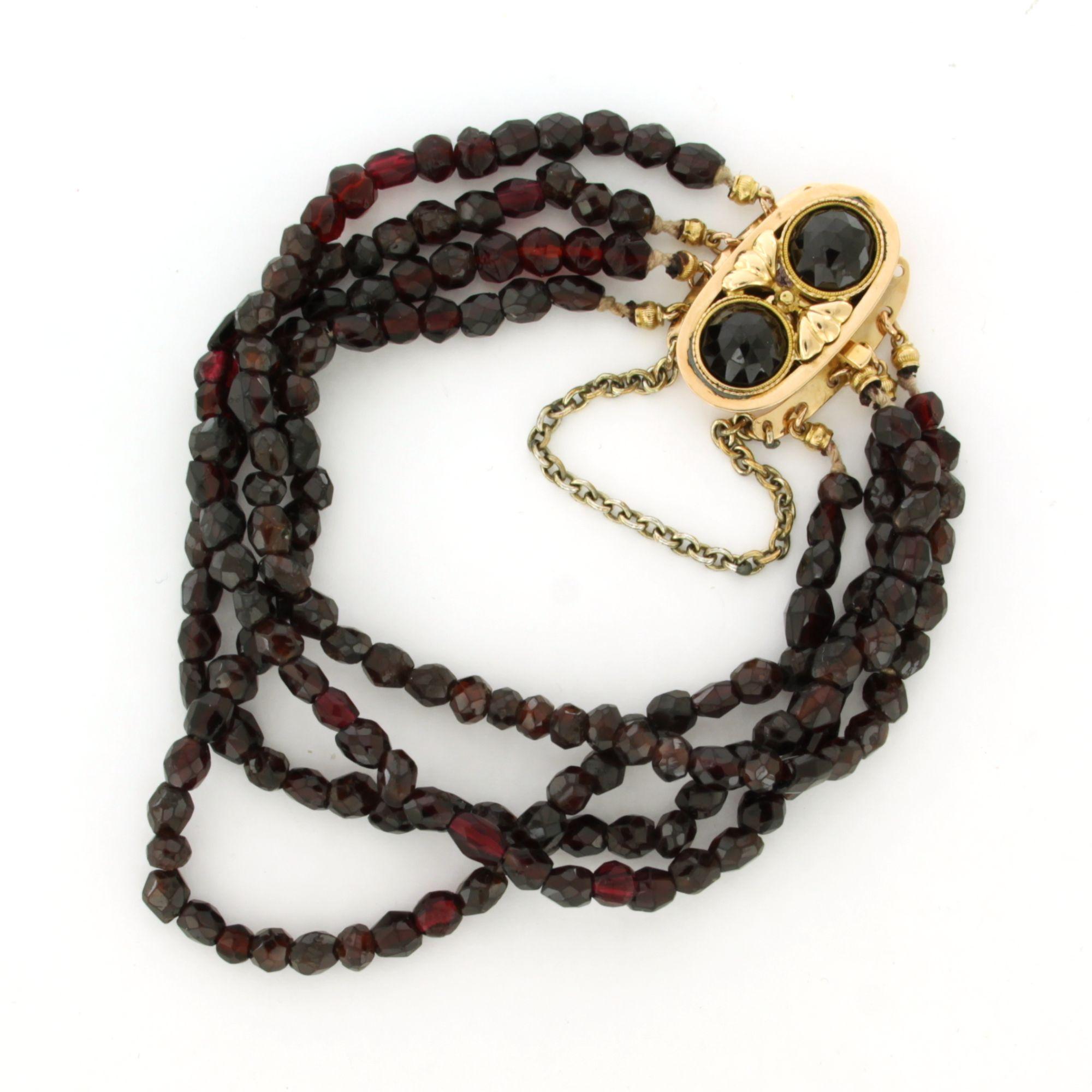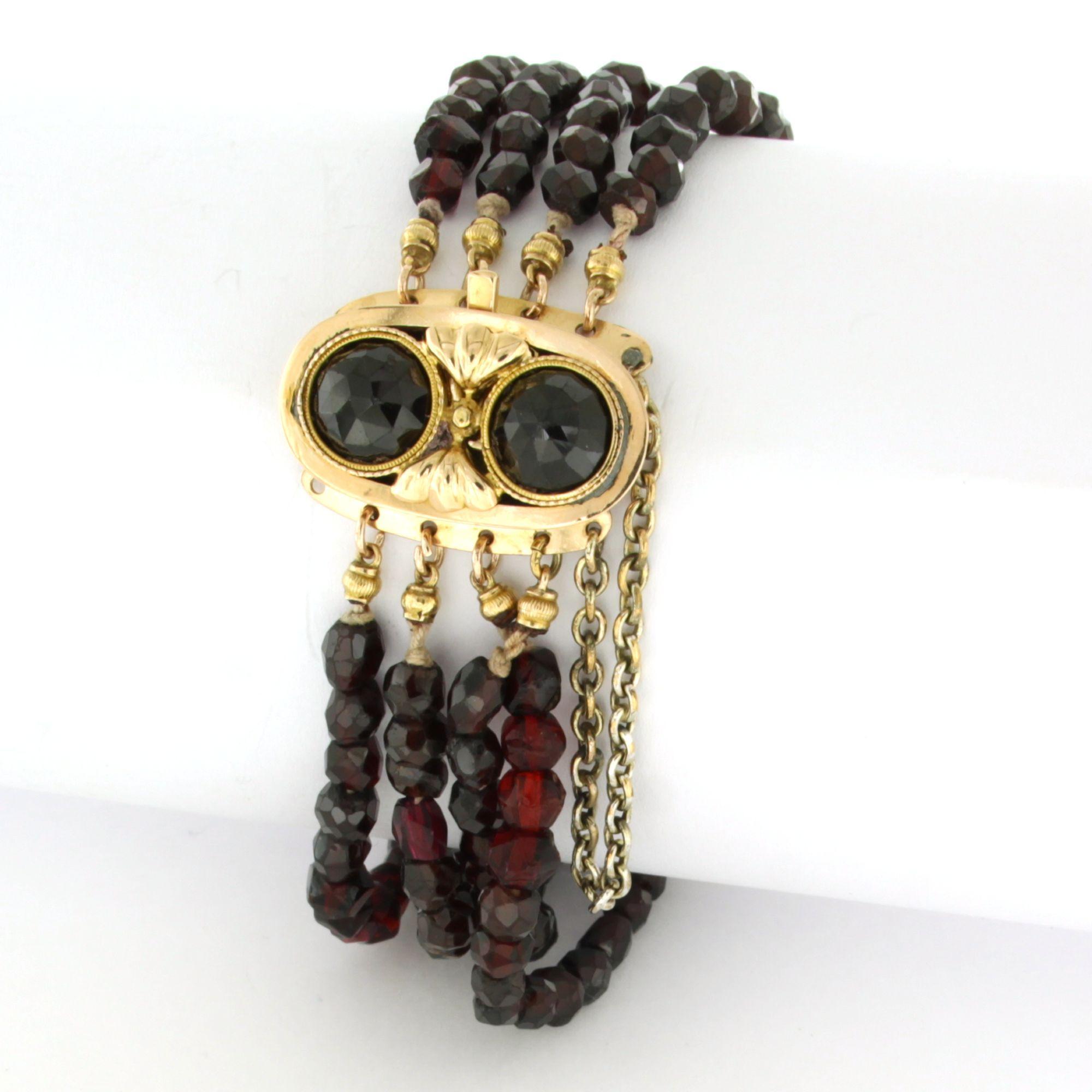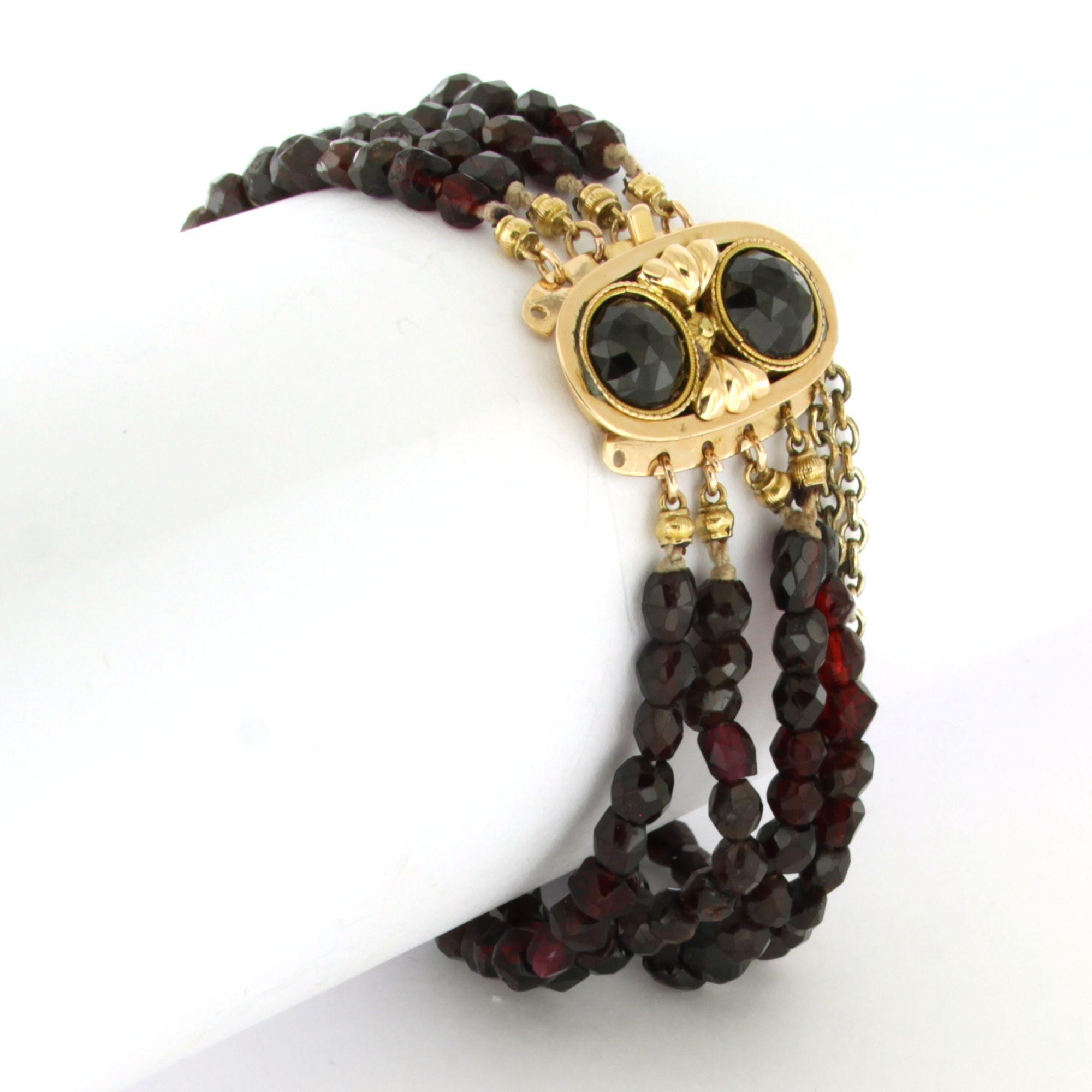 14 Kt. gouden slot aan een vierrijen granaatcollier - lengte circa 20 cm, met veiligheidskettinkje