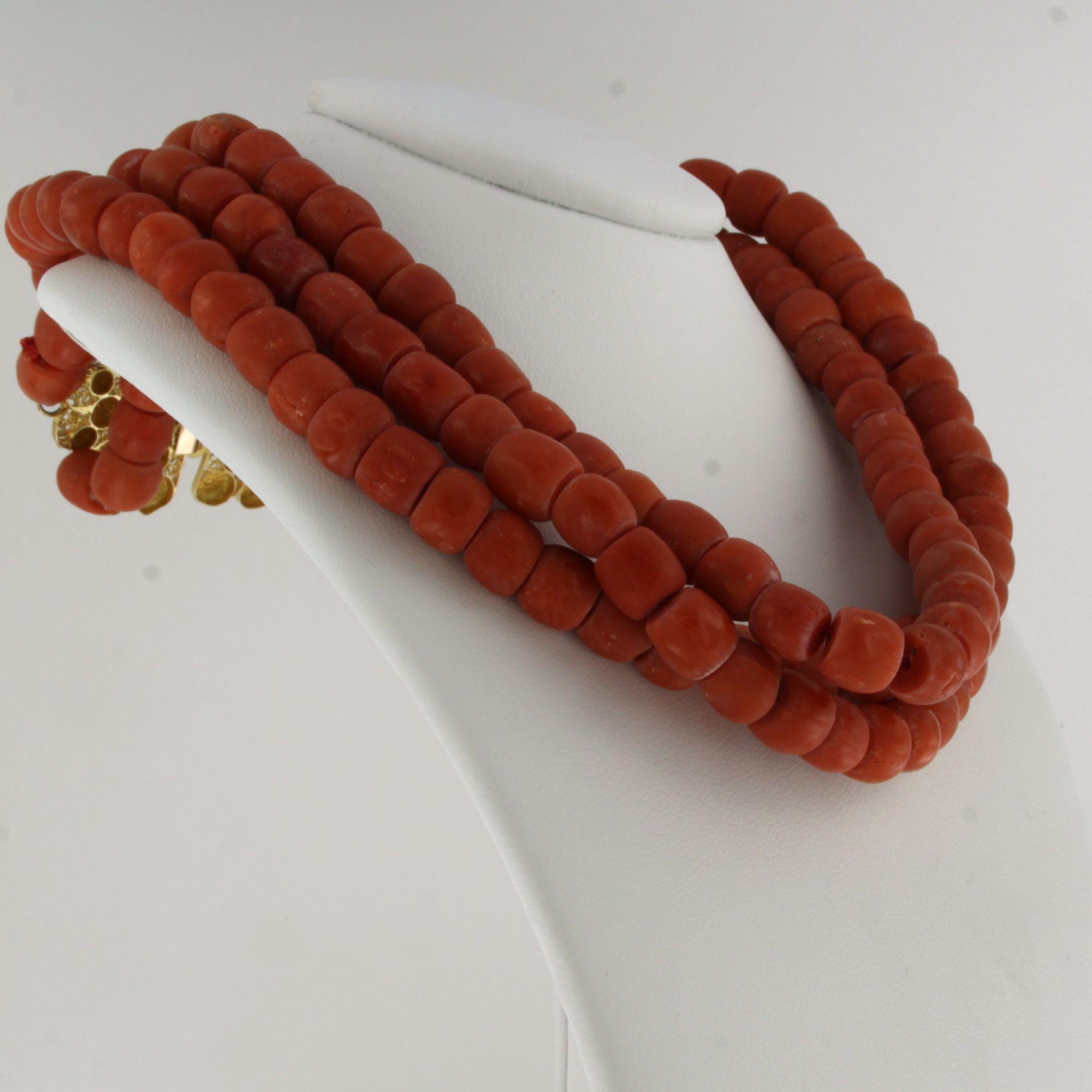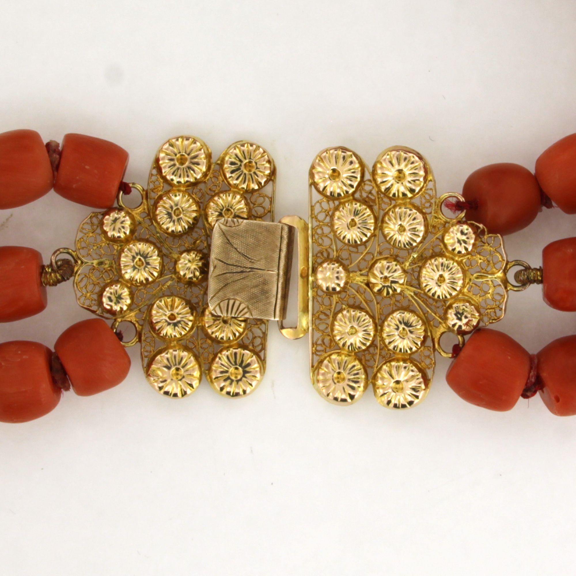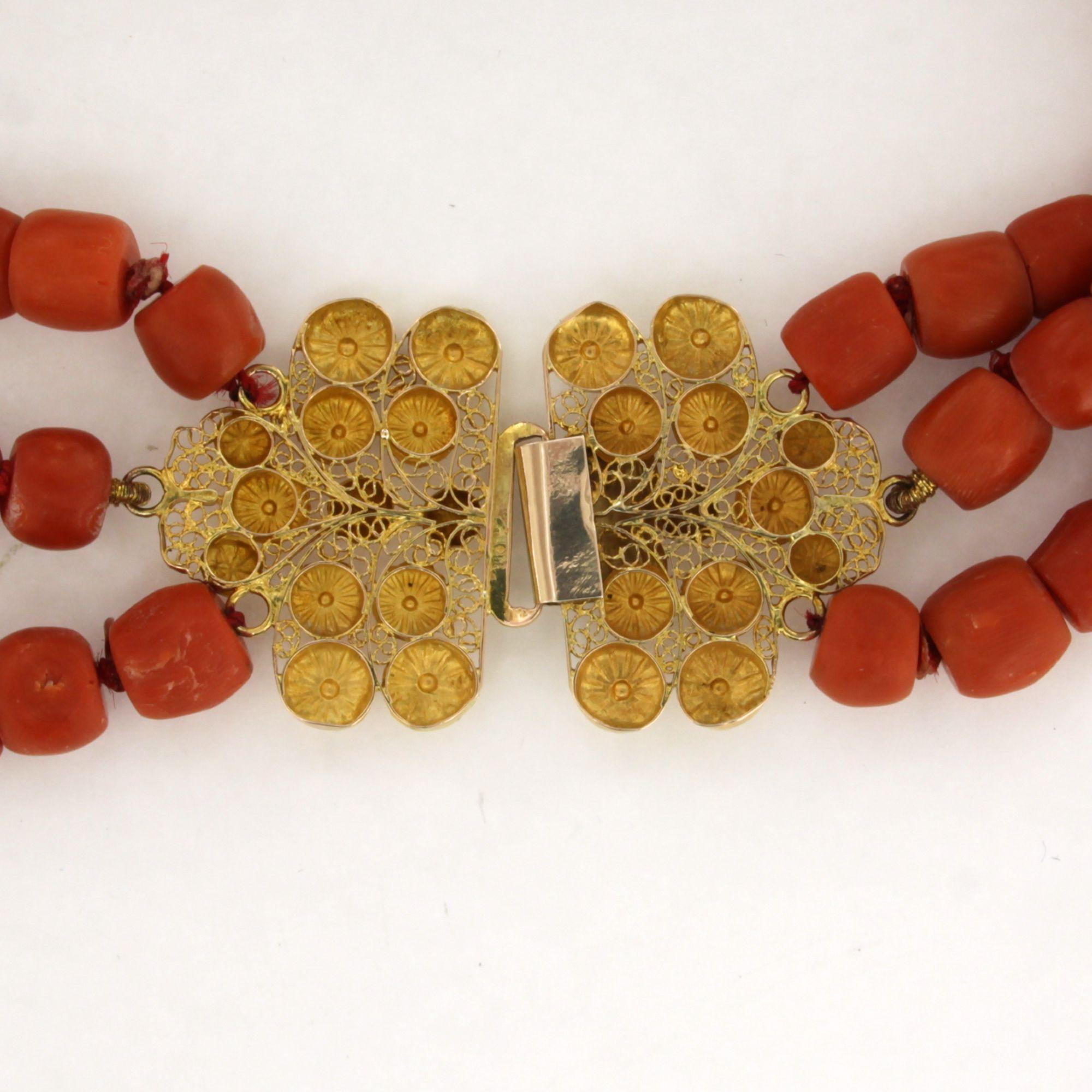 14 Kt. gouden slot aan een drie rijïge koraal collier - 36 cm