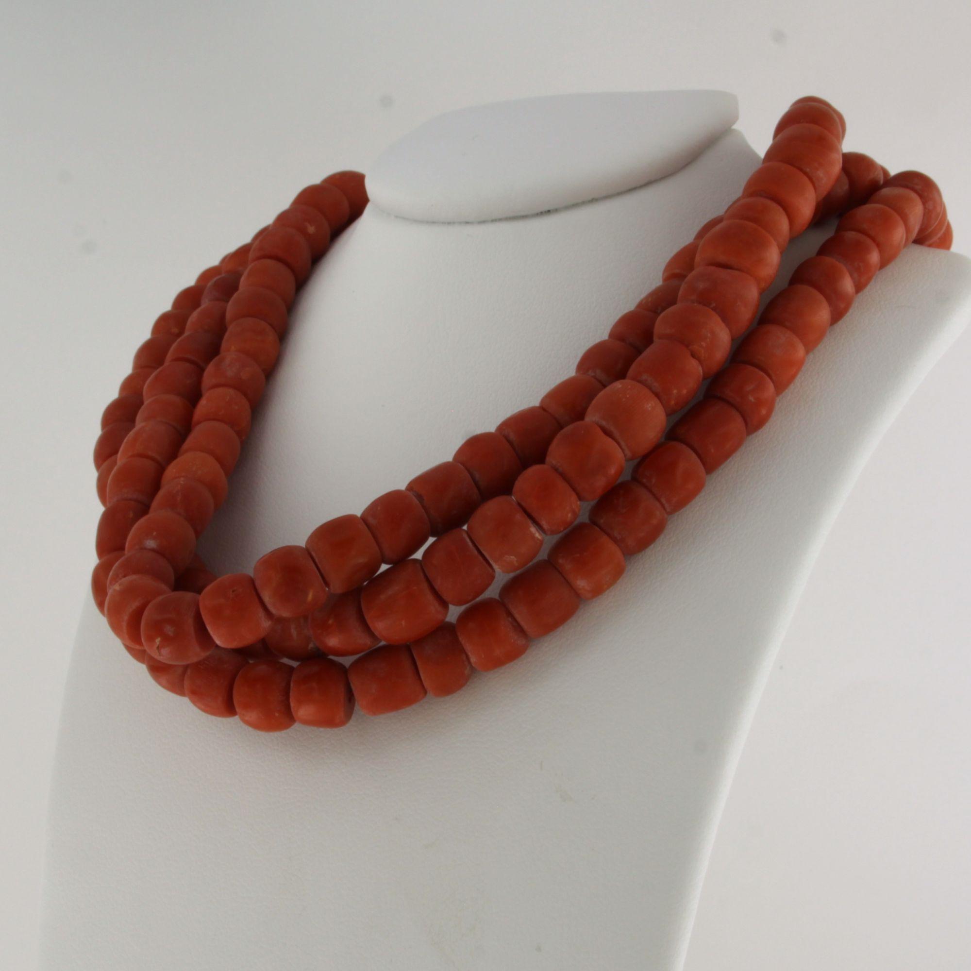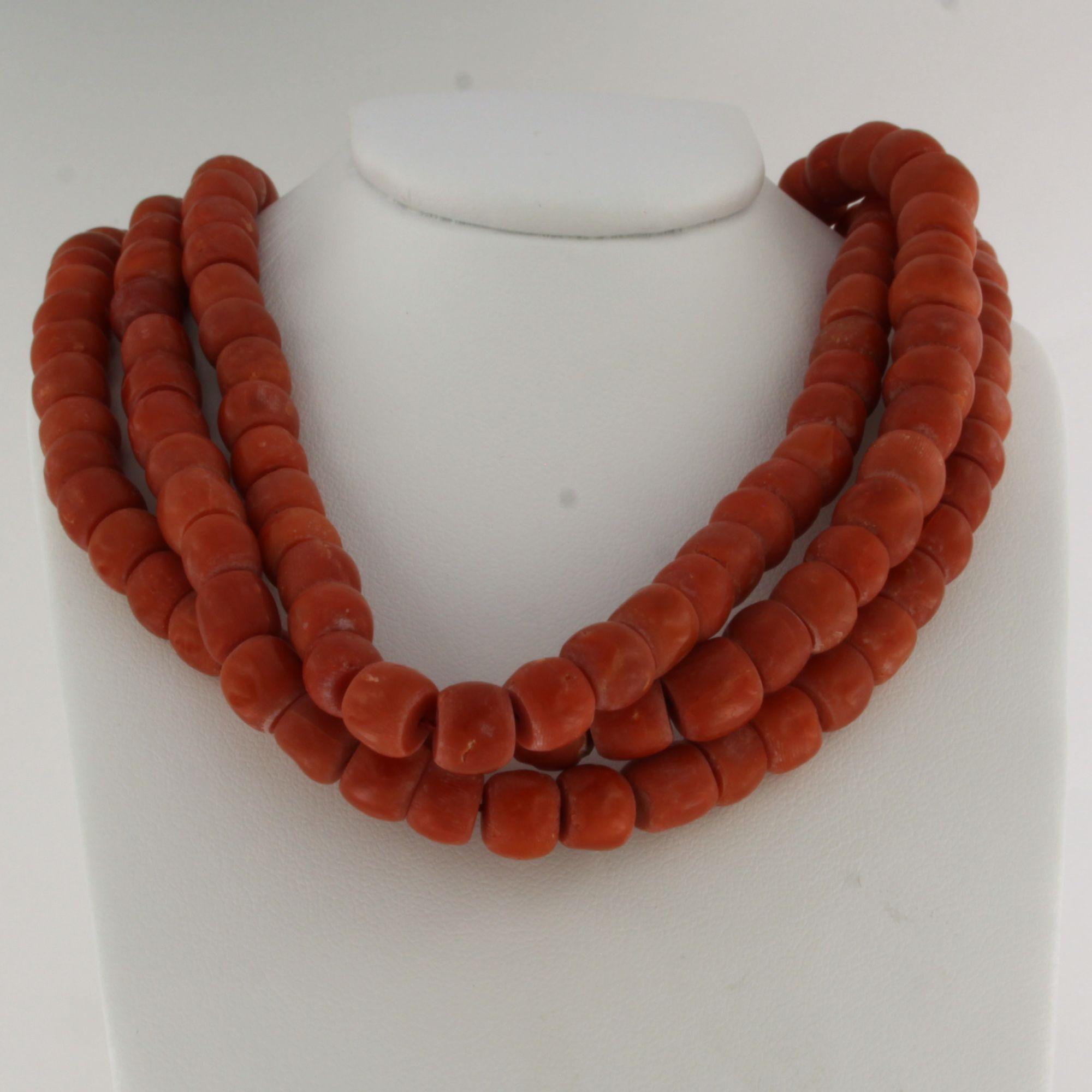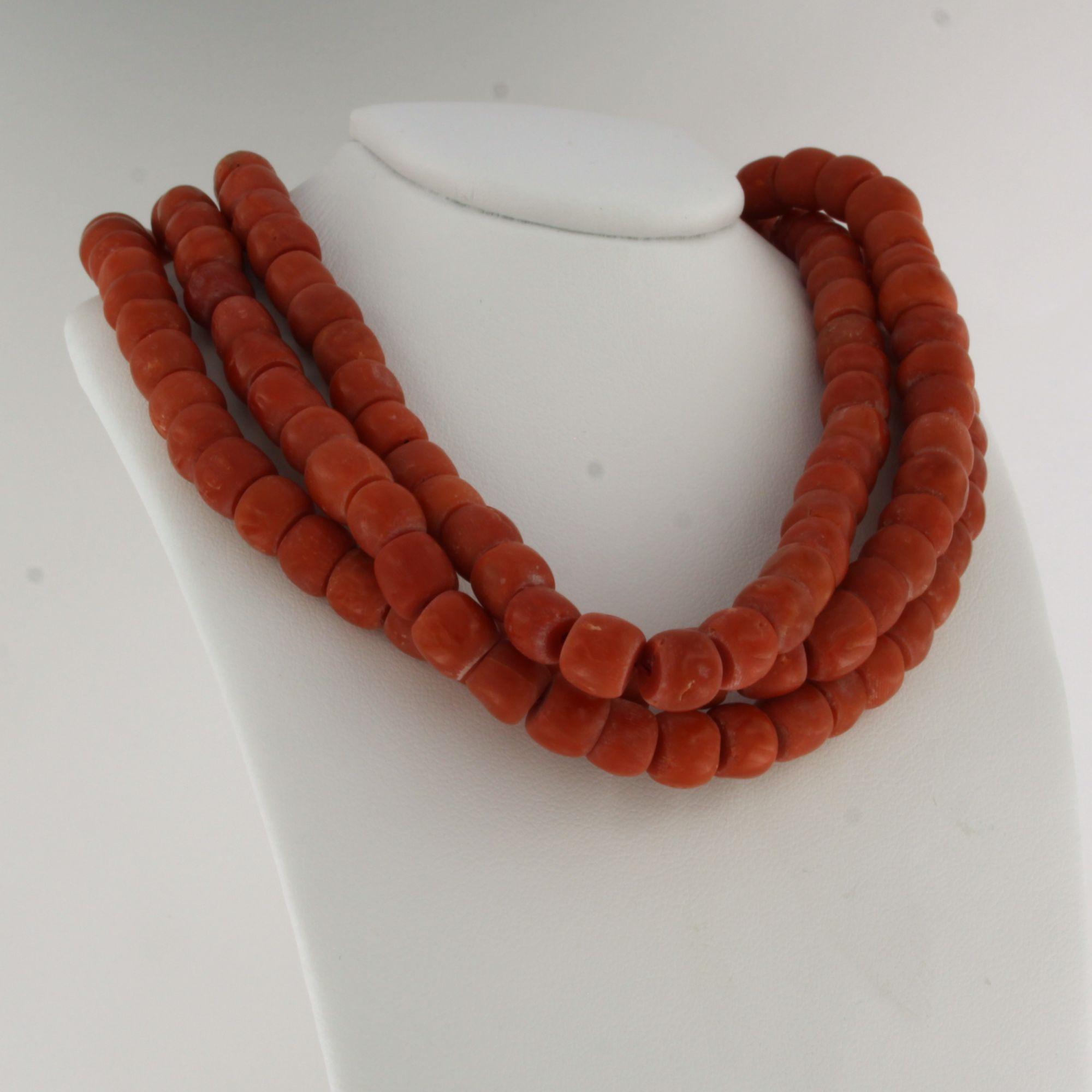 14 Kt. gouden slot aan een drie rijïge koraal collier - 36 cm