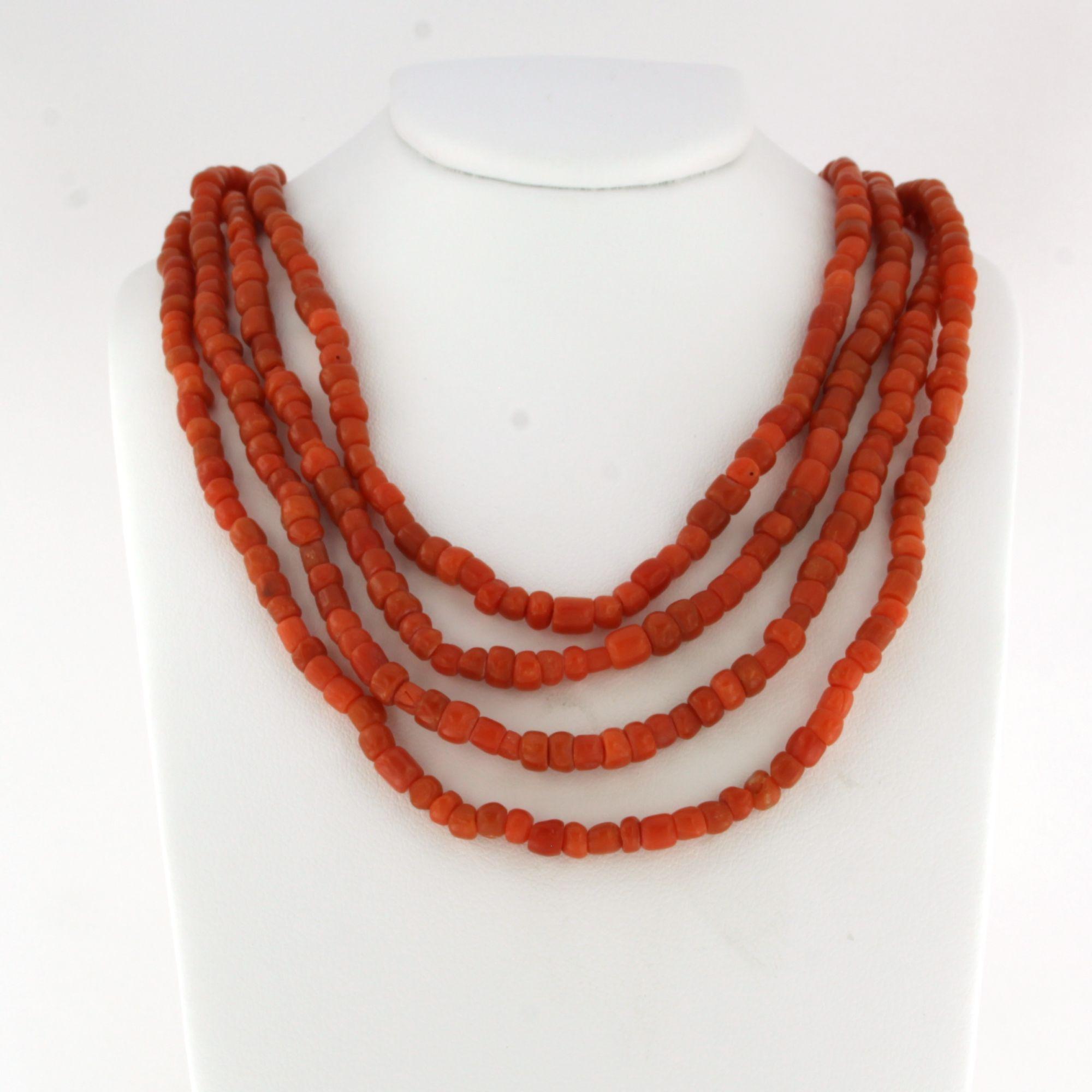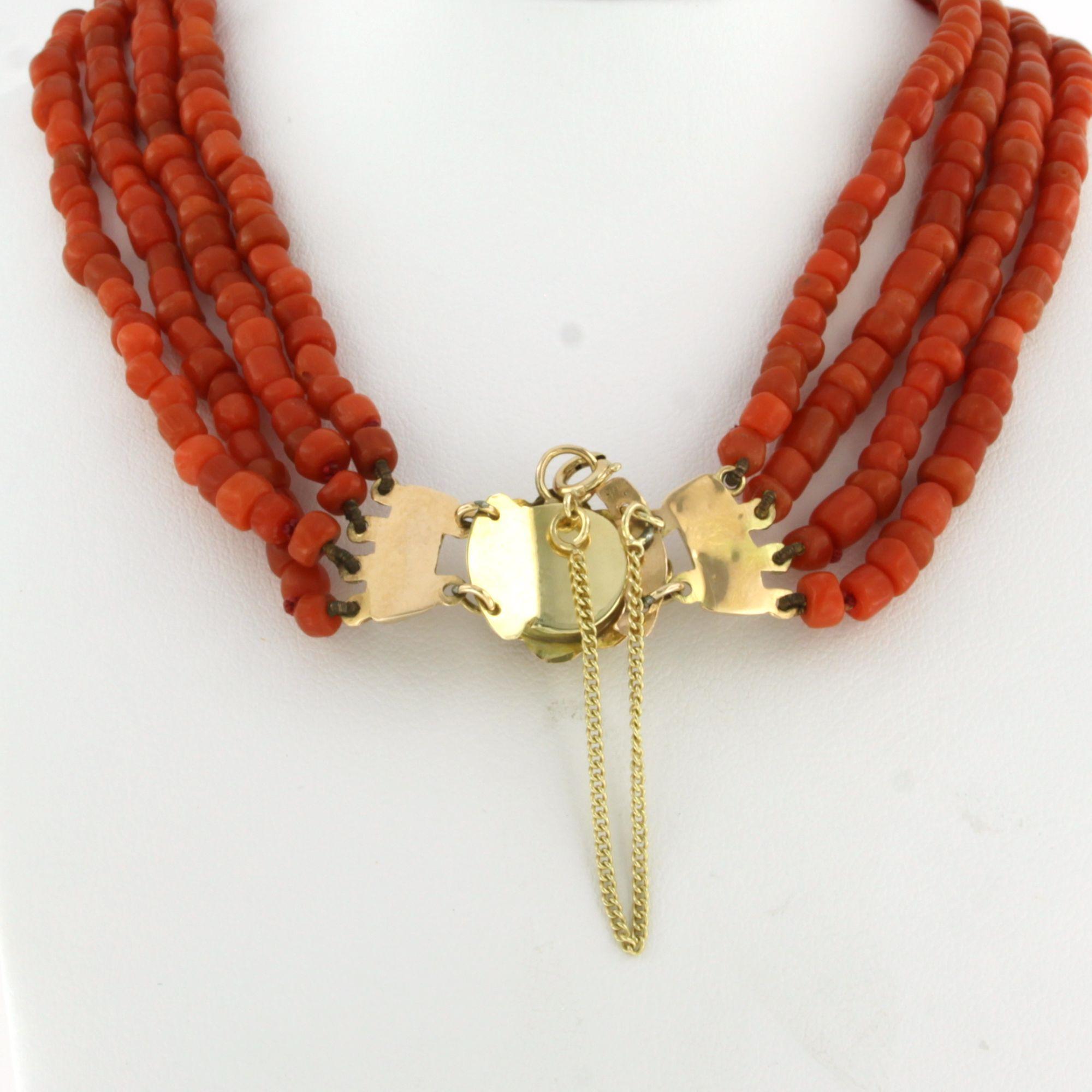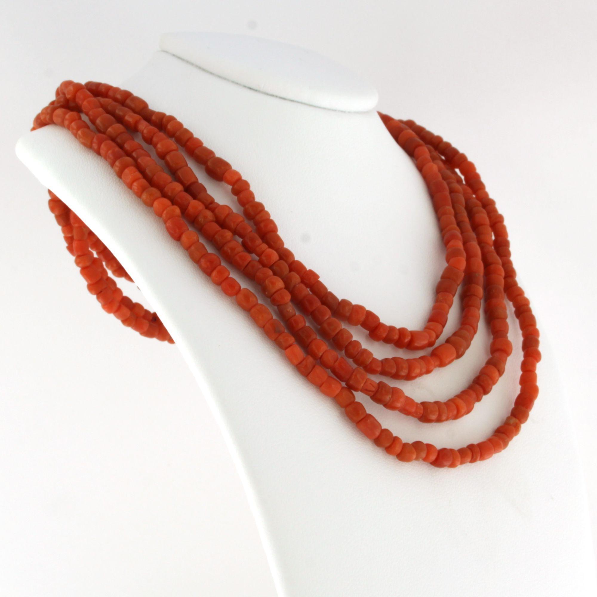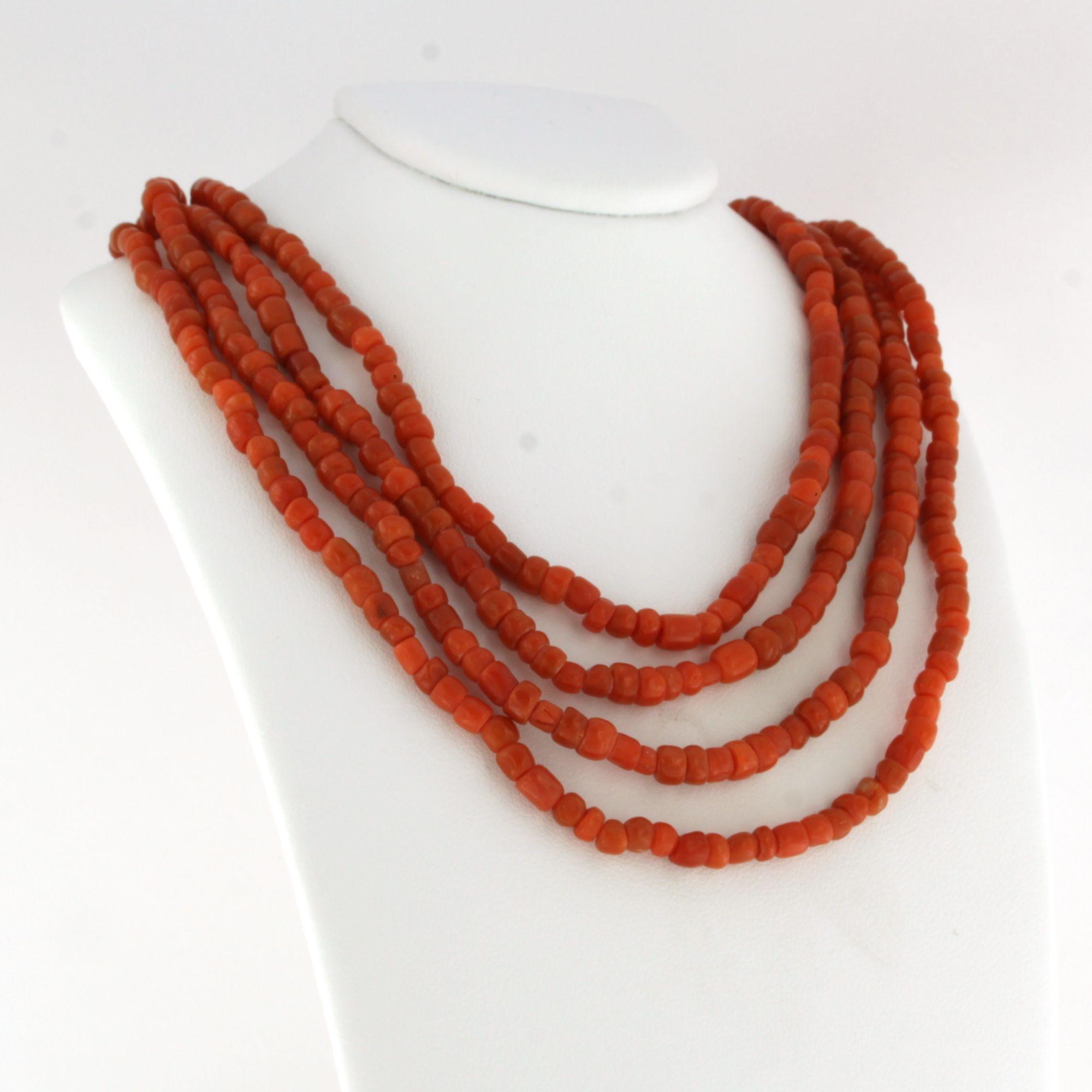14 Kt. gouden slot aan een vierrijen koralencollier - lengte circa 35 cm