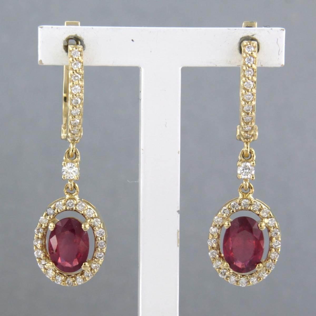 14 Kt. geelgouden oorhangers bezet met robijn tot. 1,70ct en briljant geslepen diamanten tot. 0,41 ct - F/G - VS/SI