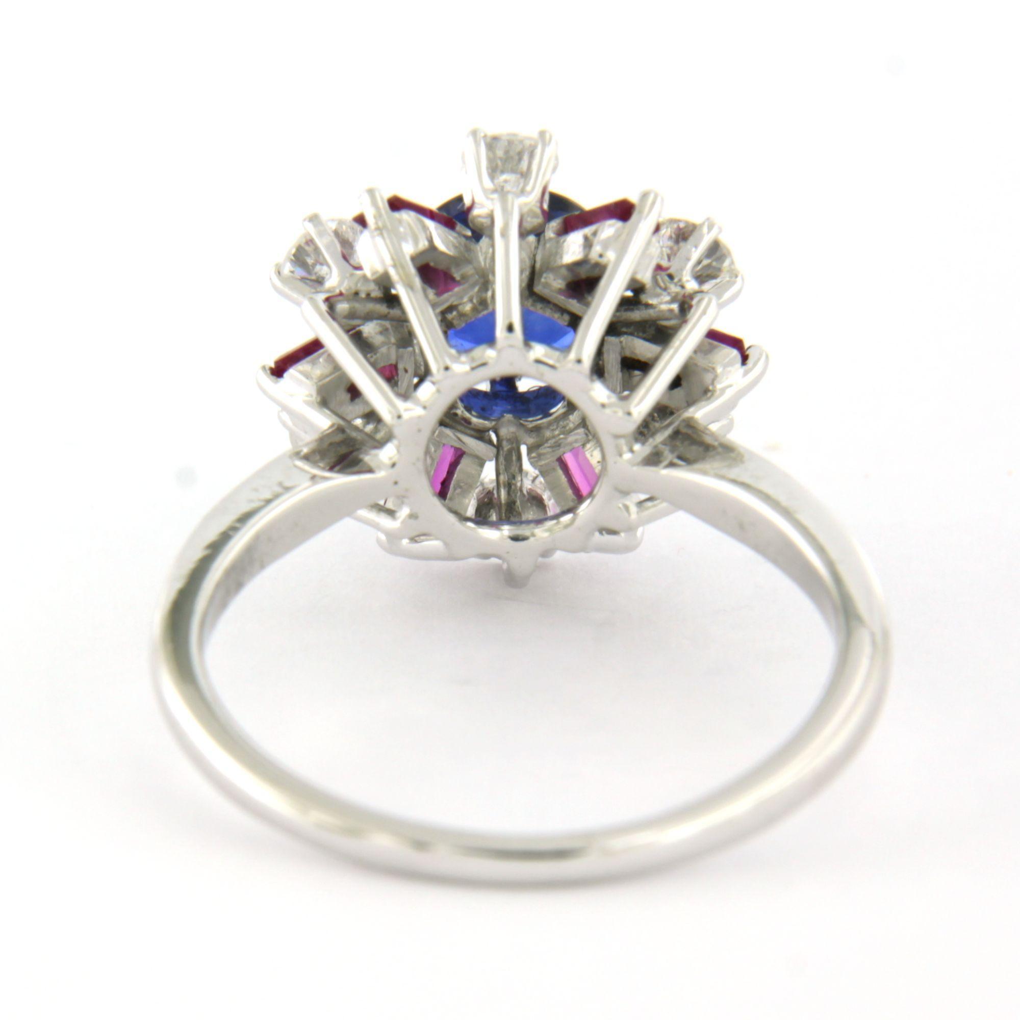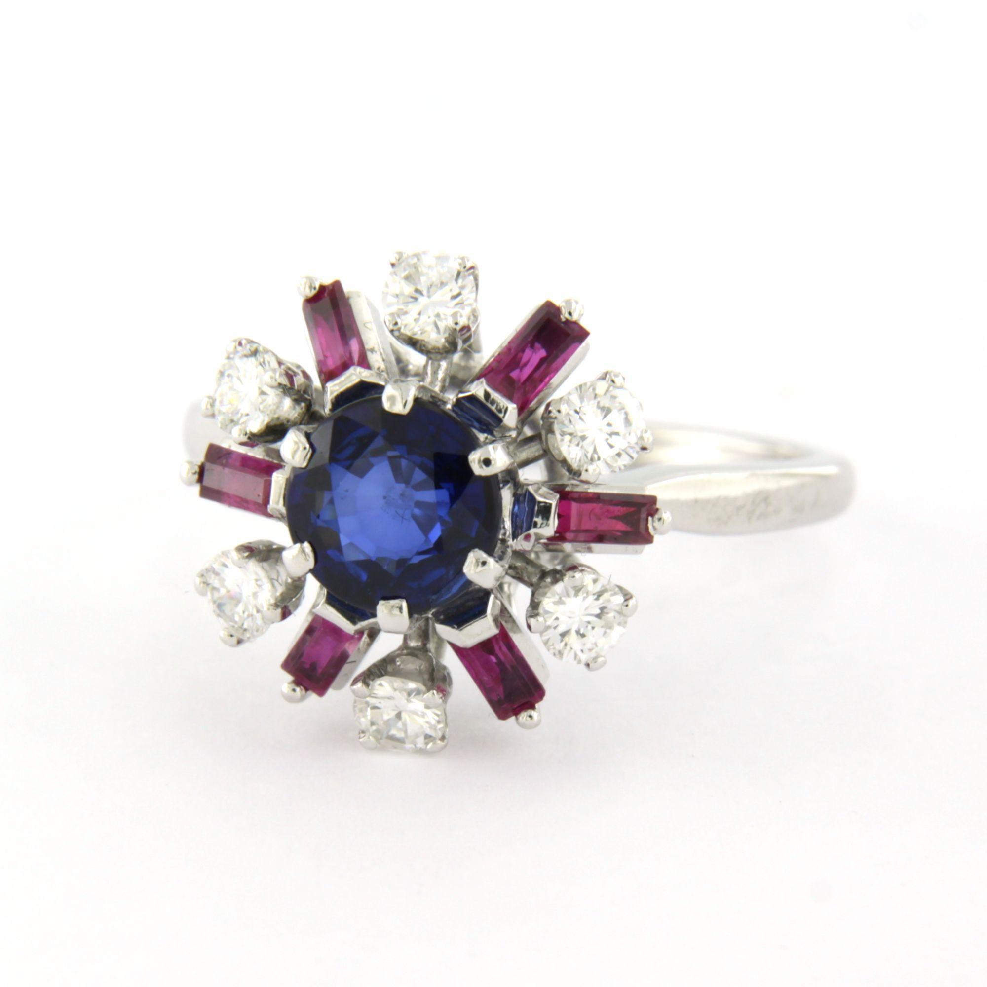 14 Kt. witgouden ring bezet met saffier, robijn en briljant geslepen diamanten totaal 0.56ct - ringmaat 17.25(54)