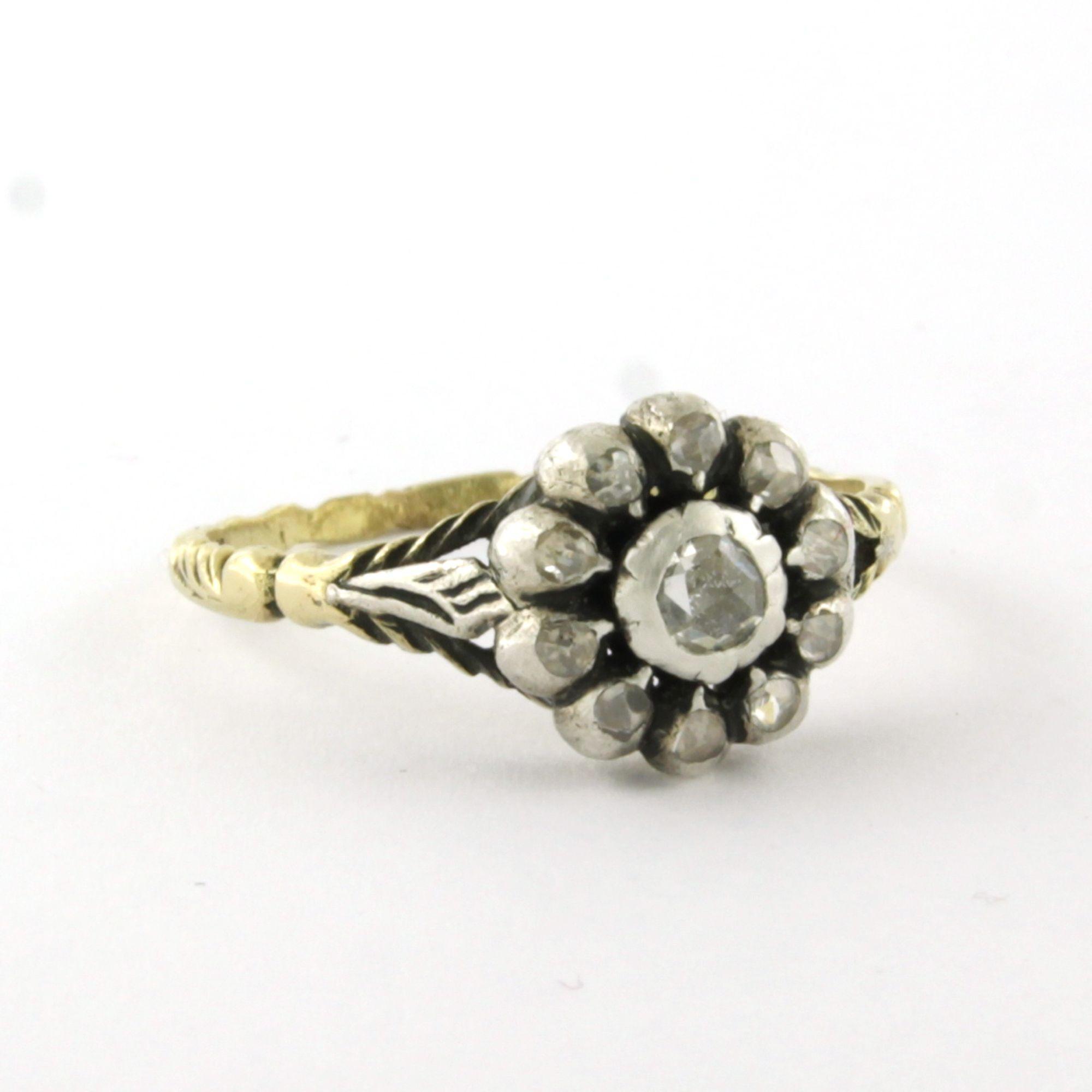 14 Kt. gouden met zilveren ring bezet met roos geslepen diamanten totaal 0.20ct - ringmaat 18.25(58)