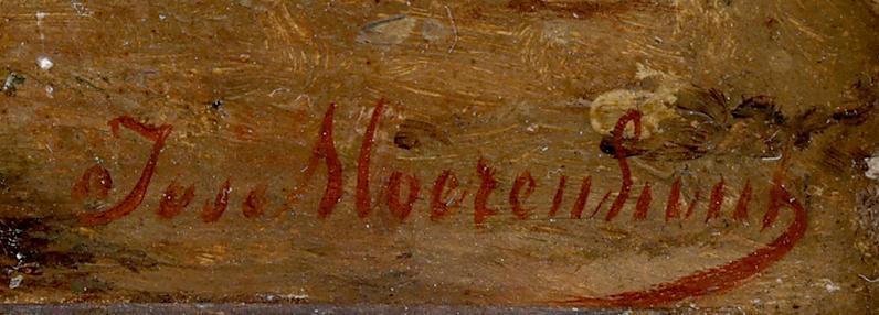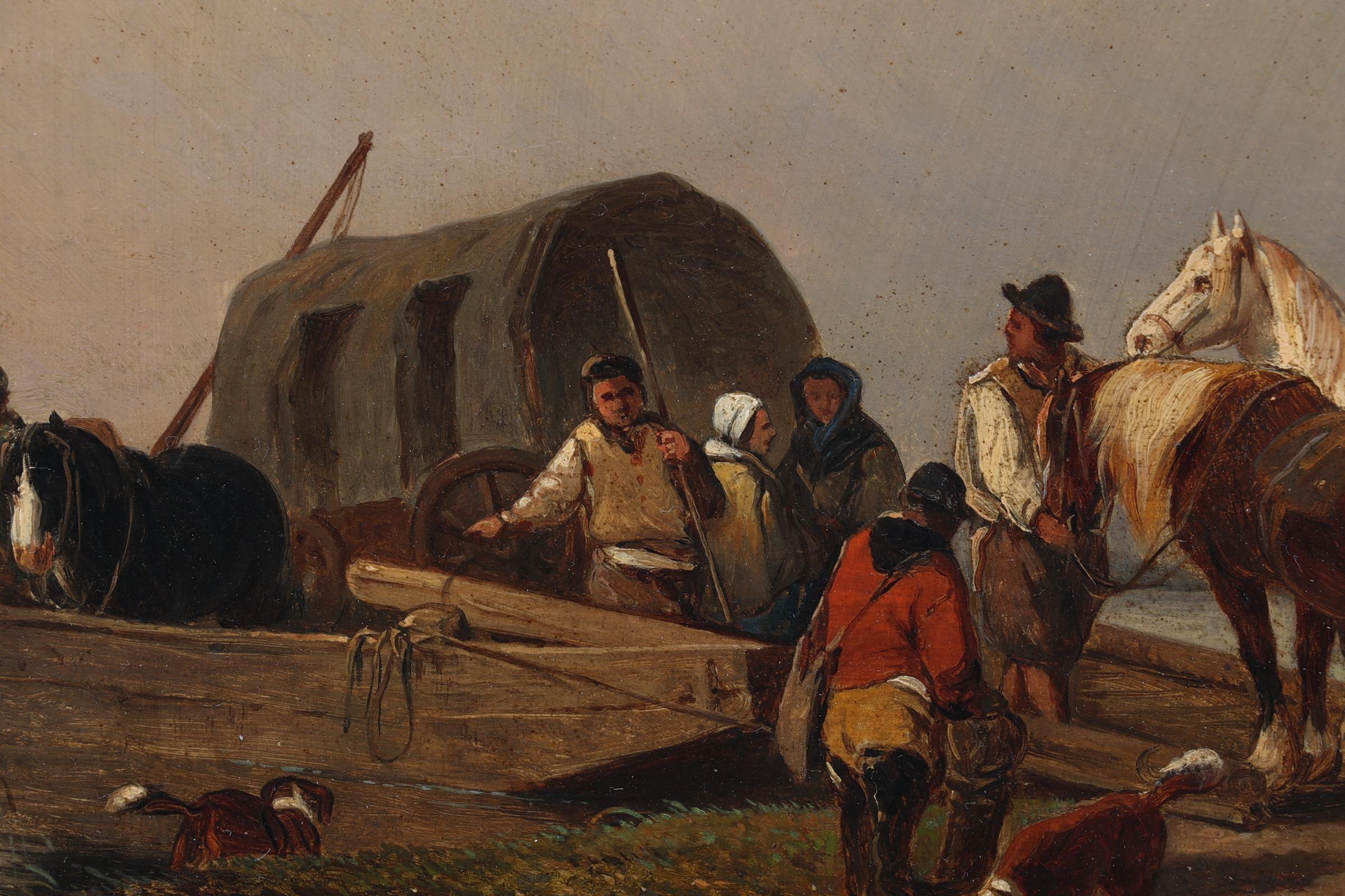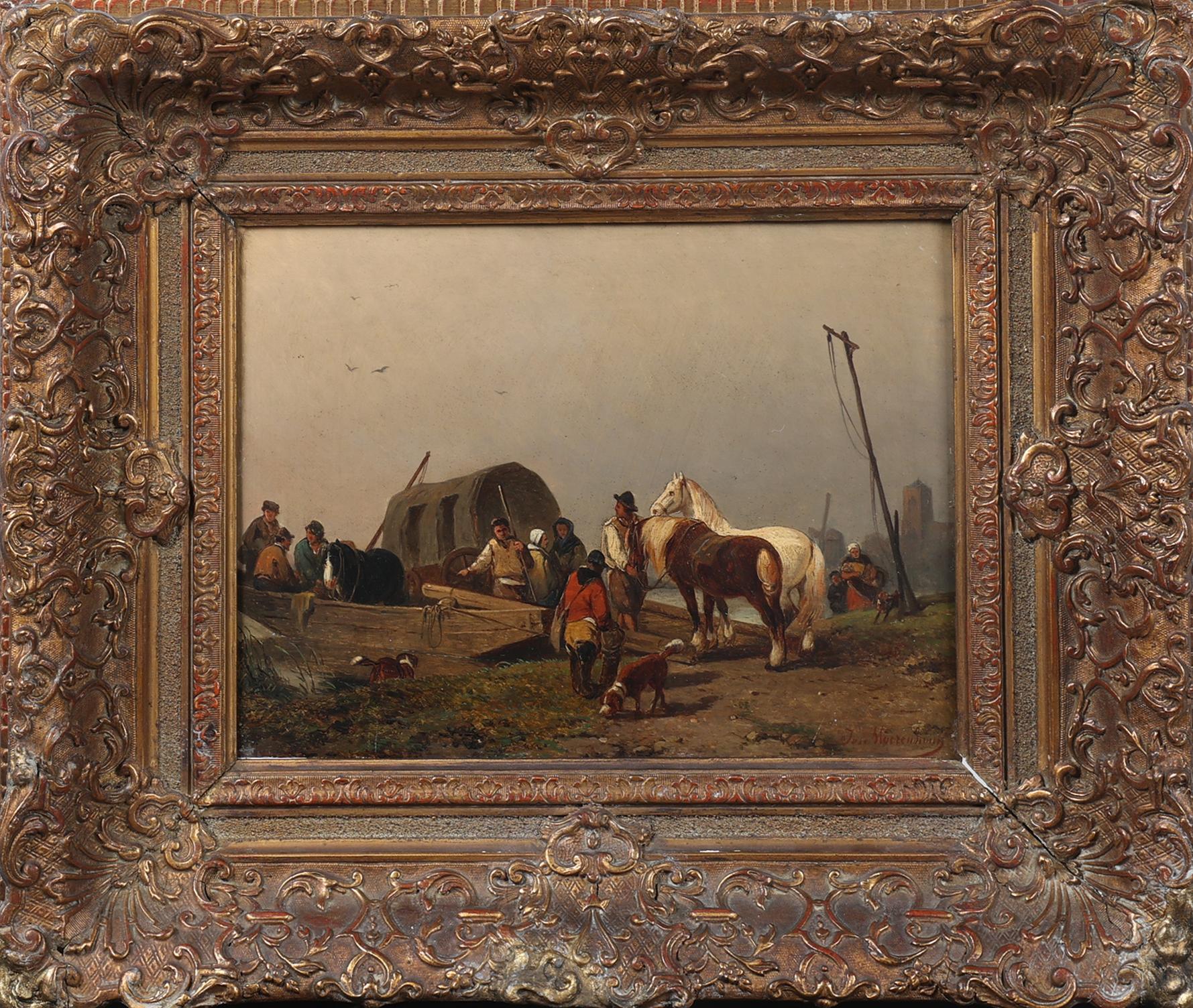Jozef Jodocus Moerenhout (1801-1875), Personen met paarden langs het water, olieverf op paneel, 23 x 30 cm.