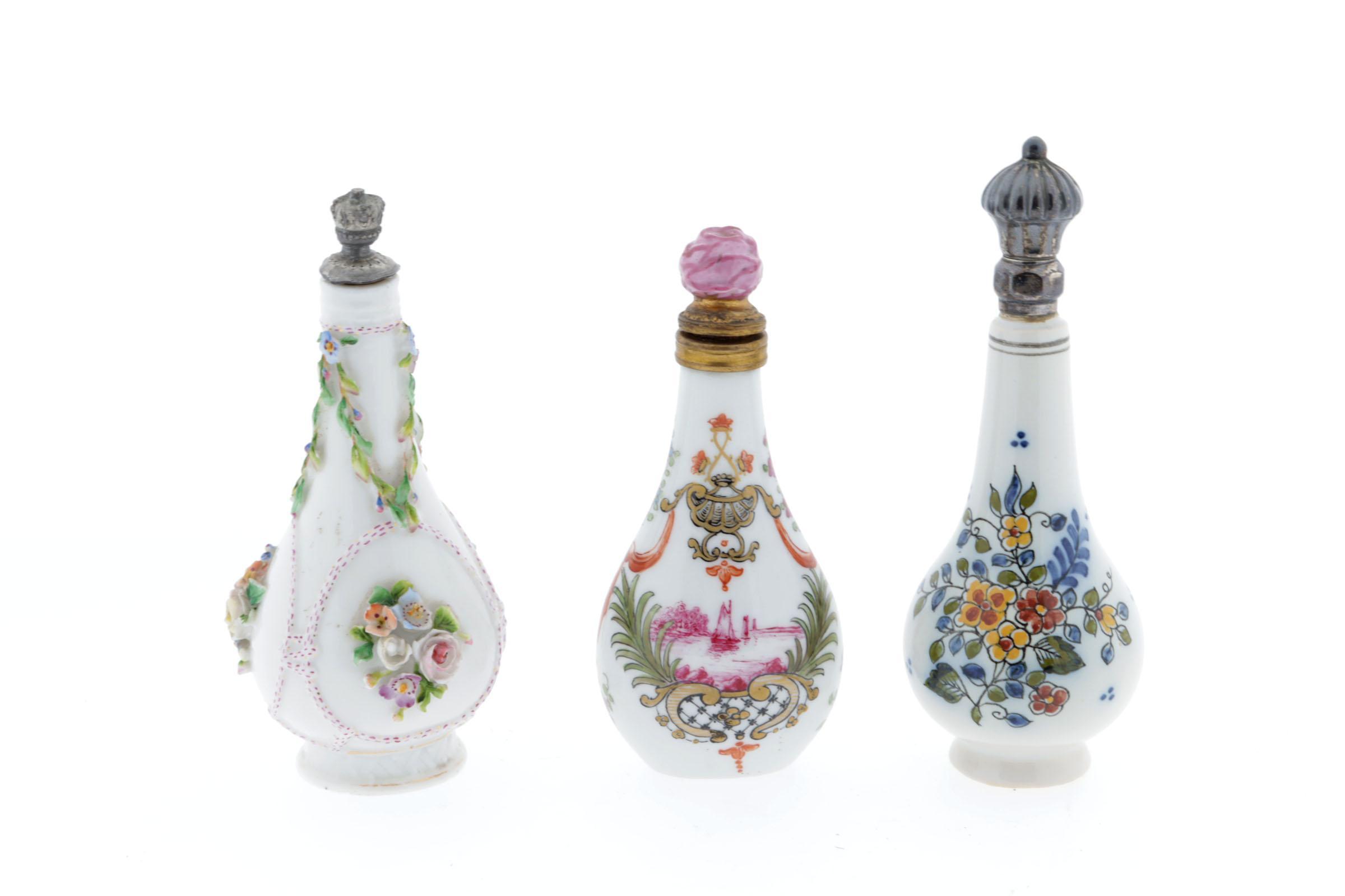 3 porceleinen parfumflessen, waaronder: 1 flesje beschilderd met bloemen en takjes, Makkum, zilveren scharnierende dop en kurkje, hoogte 13 cm, 1 flesje onderop gemerkt "Sceaux" (Frans) met decoratie in roze, oranje, groen, goud, aan 1 zijde een bootje en aan andere kant mannetje en riviergezicht, stopje in vorm van roosje, hoogte 11 cm, 1 porseleinen flesje met aangebrachte porseleinen bloemen en guirlandes, voorzien van kroonkurk, onderop gemerkt met Meissen zwaardje, Duitsland rond 1850, hoogte 12 cm