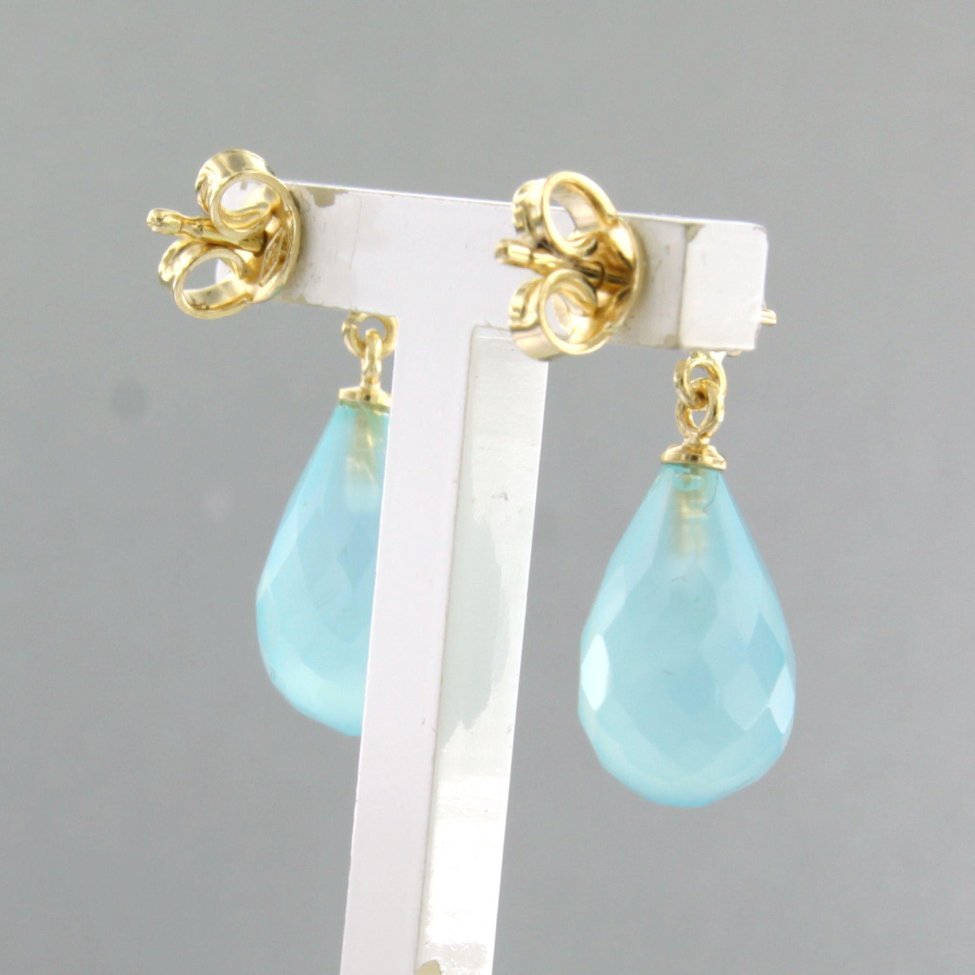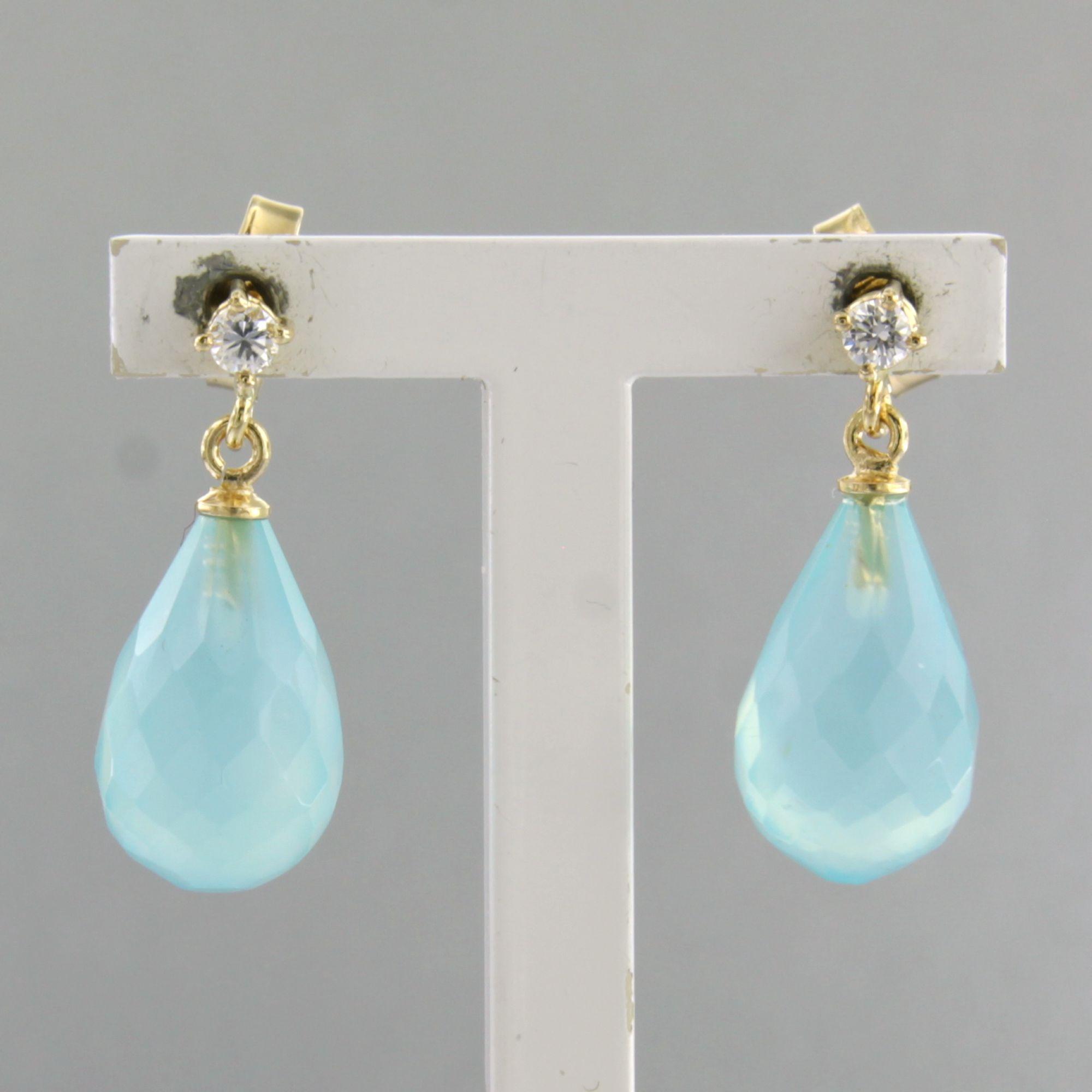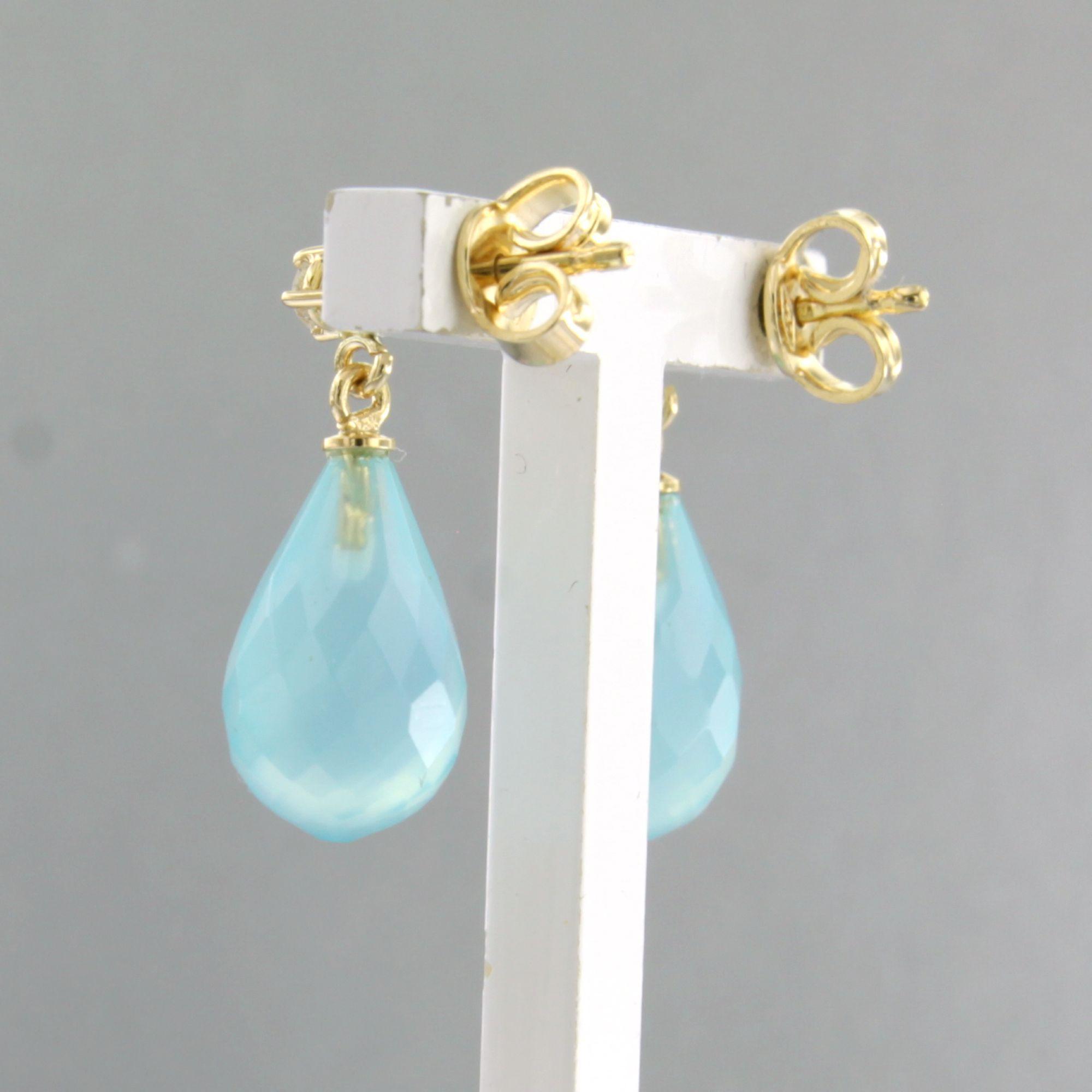 18 Kt.geelgouden oorhangers bezet met blauwe kwarts en briljant geslepen diamant 0.10ct