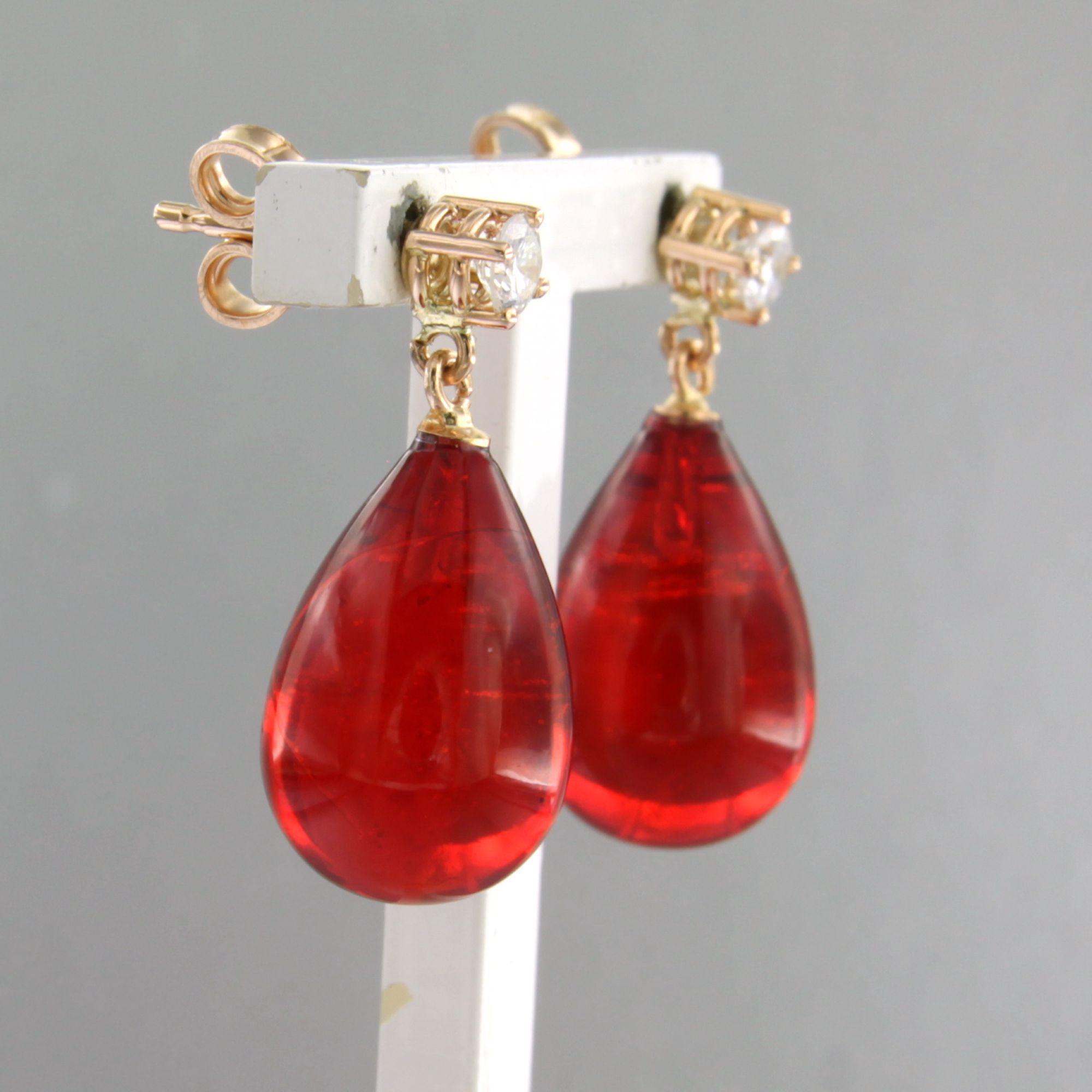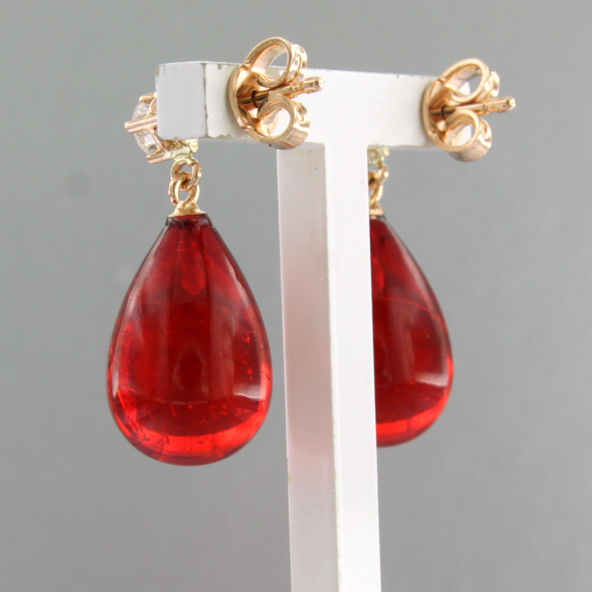 18 Kt. roodgouden oorhangers bezet met rode amber en briljant geslepen diamant 0.18ct