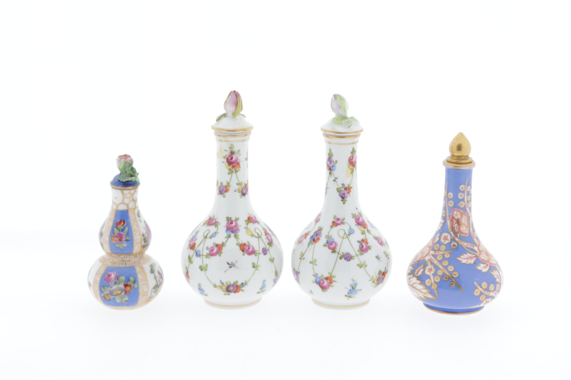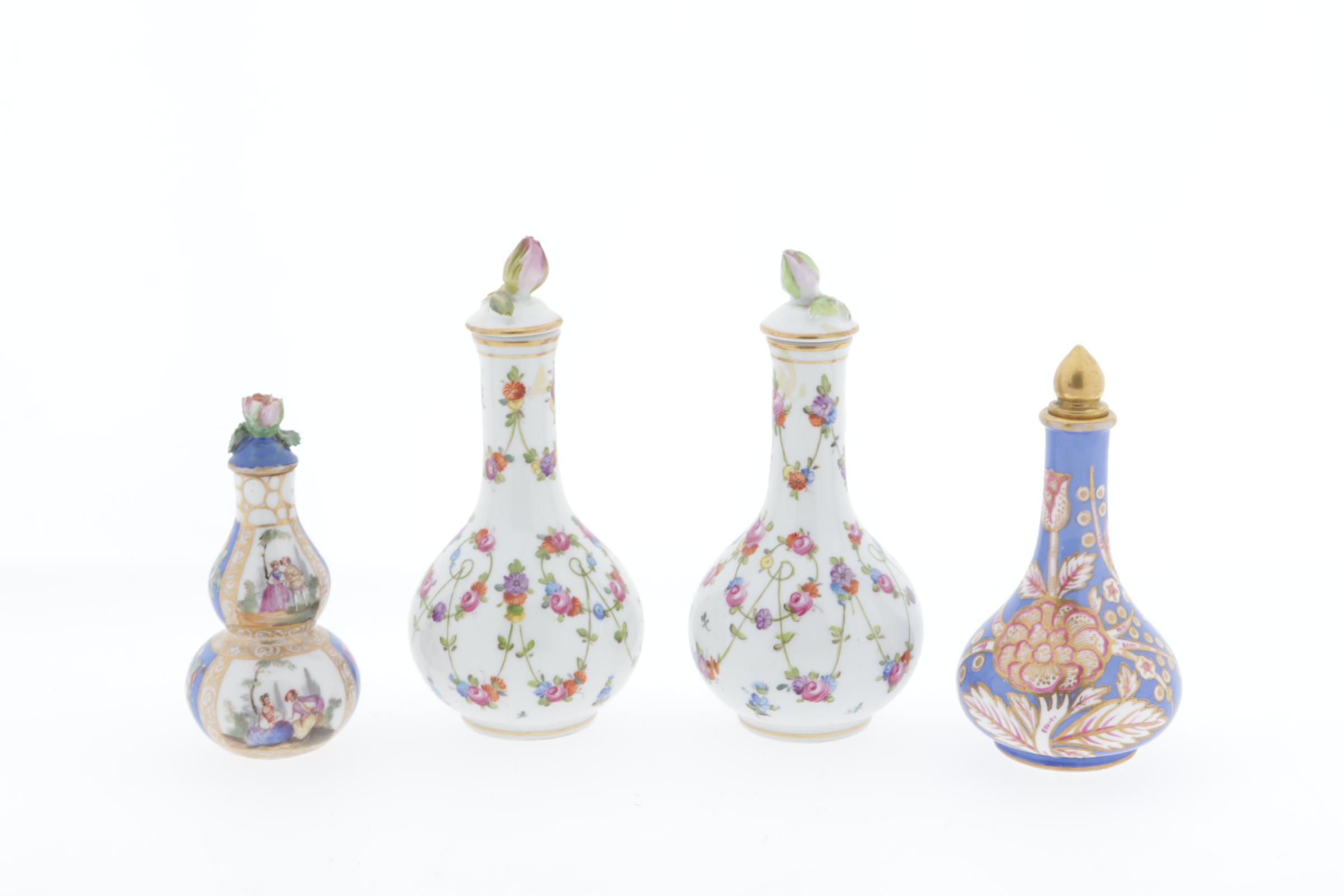 4 porceleinen parfumflesjes, waaronder flowers + folliage op lavendelblauwe achtergrond, porceleinen gouden dop, gesigneerd Spode R725, pattern 3975, rond 1825, Engeland, hoogte 10,5 cm, 1 porceleinen flesje, rondom met paartjes, roosje op stopje, Dresden, eind 1800, hoogte 9 cm, 1 stel porceleinen vaasjes, bollebuiken, wit gedecoreerd veelkleurig met rozenguirlandes, porceleinen stopjes met rozen in de knop, gemerkt "Dresden" en blauwe lettertekens PS, rond 1870, hoogte 12,5 cm