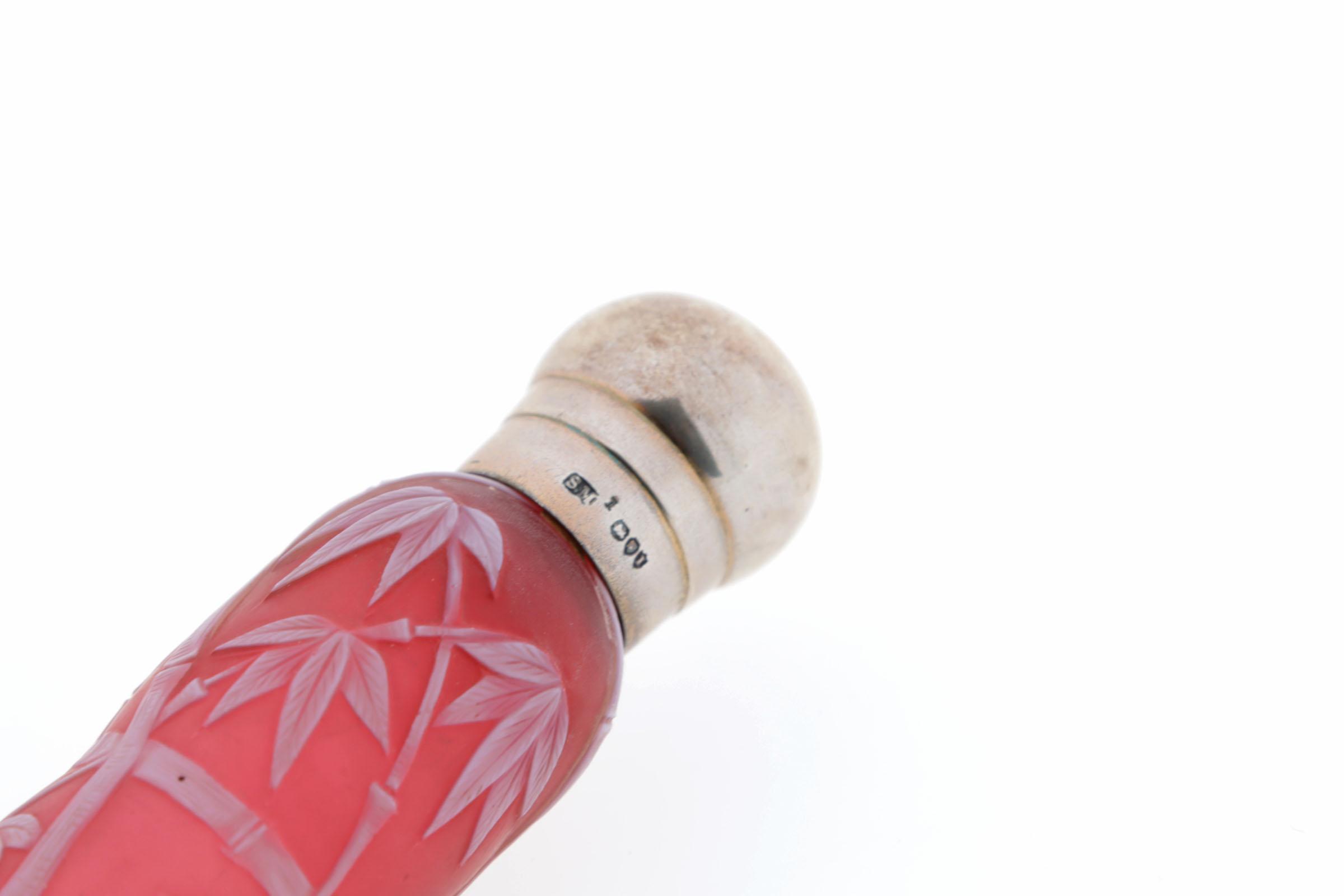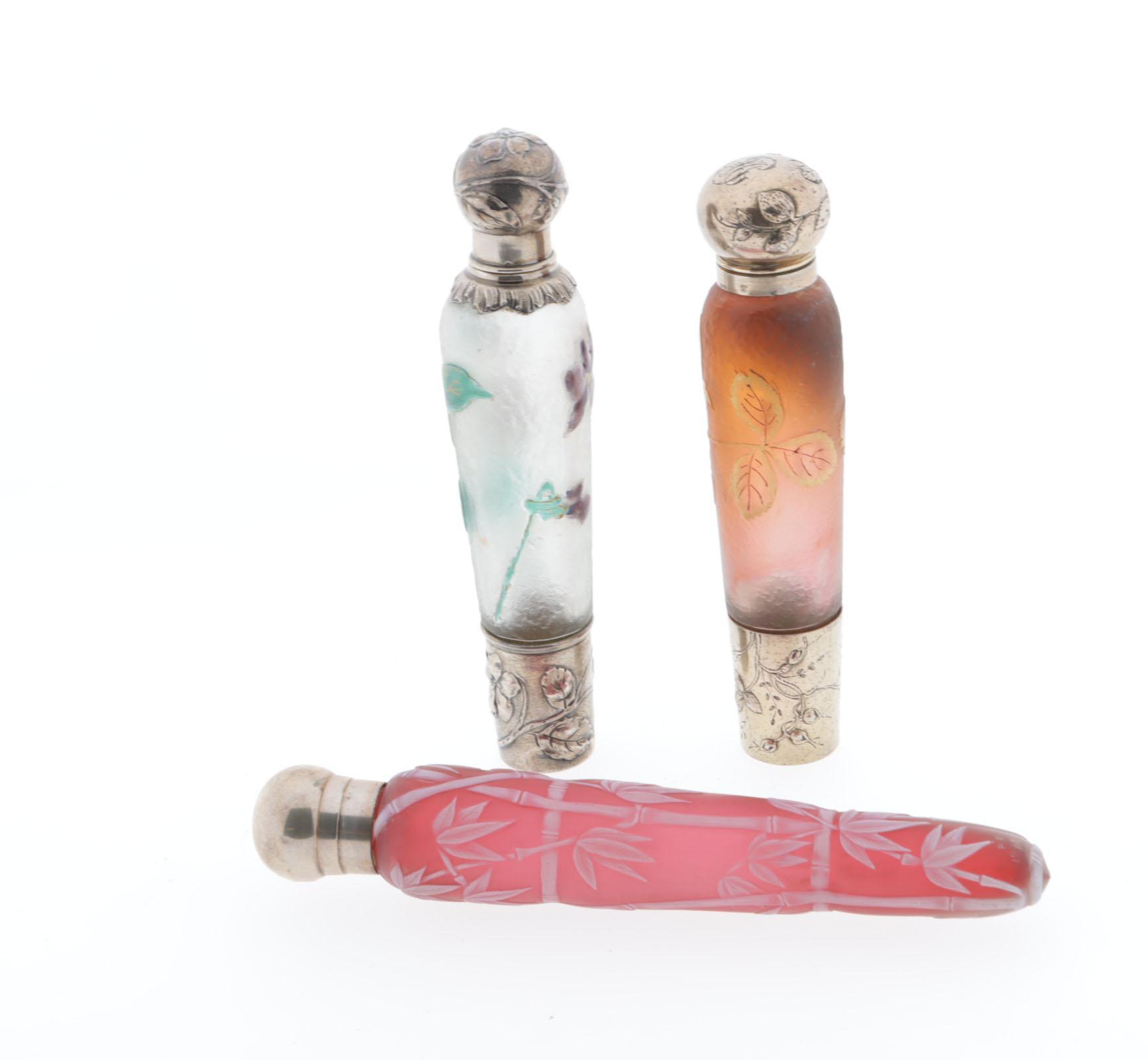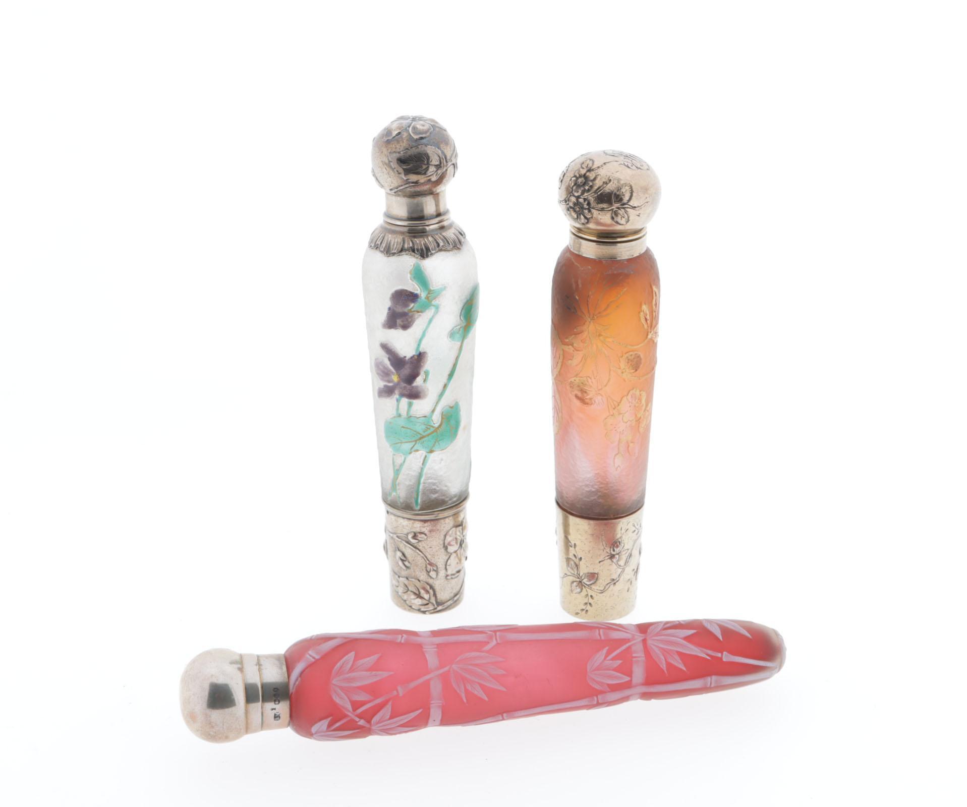 3 puntvormige parfum flacons, waaronder: 1 rode cameo glas met witte bamboo motieven, zilveren schroefdop, 1886, hoogte 17 cm, 1 glazen fles met jugendstill geëmailleerde bloemen, viooltjes, in groen/paars, zilveren montuur, viooltje op dop, glazen binnenstopje, rond 1890, hoogte 15,5 cm, 1 oudroze glazen fles met gouden aardbeien en -bloesem, verzilverd montuur, initialen op dop, hoogte 14,5 cm, eind 1800