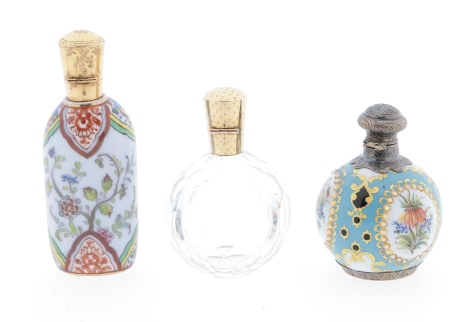 3 parfumflacons, waaronder: 1 ronde Sèvres fles, geëmailleerd, 3 medaillons met bloemvoorstellingen, zilveren montuur en scharnierende dop, binnenstopje, hoogte 6,5 cm, 1 gefacetteerd kristallen bol rond flesje met gouden scharnierende dop, binnendopje, hoogte7 cm, 1 staand porseleinen met emaille handbeschilderd flesje voorzien van gedetailleerde florale patronen, gouden scharnierende dop, onderop een blauw teken 'D', hoogte 9 cm