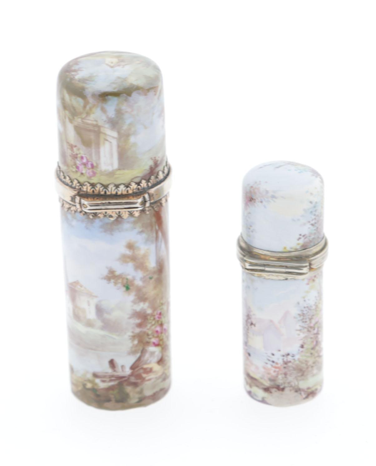 2 emaille parfumflacons: 1 kokervormig met romantisch paartje in landschap, scharnierend verguld zilveren montuur, binnenstopje, Frans keur, half 19e eeuw, hoogte 8,2 cm, 1 emaille op zilver flacon, kokervormig, voorstelling romantisch paar in landschap met 2 witte duiven, glazen binnenstopje, 1850, hoogte 5,7 cm