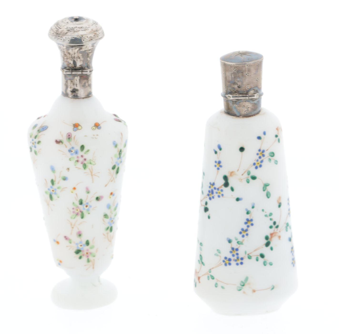 2 witte opaline parfumflacons met emaille beschildering, Porcelain de Paris, beiden met scharnierende doppen en kristallen binnendopje, 19e eeuws, hoogtes: 9,3-10,5 cm