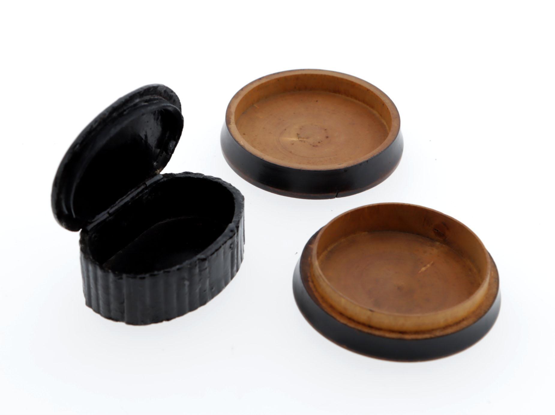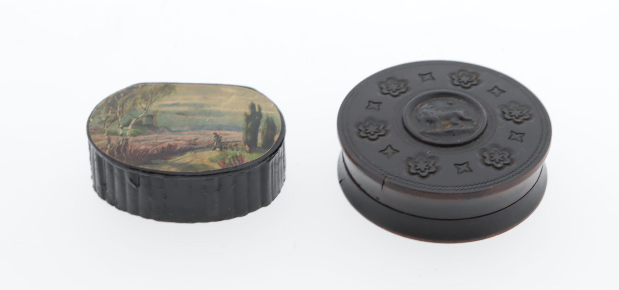 1 ovale platte papiermaché doos, zwarte zijkanten, scharnierend deksel, waarop heide landschap met molen en figuurtje, Engels? 19e eeuw, lengte 5,8 cm, hoogte 2,2 cm, 1 ronde platte houten snuifdoos, donkerbruin, op deksel een leeuw in verhoogd reliëf en bloemmotieven daaromheen, begin 20e eeuw, doorsnee 6,5 cm, hoogte 2 cm