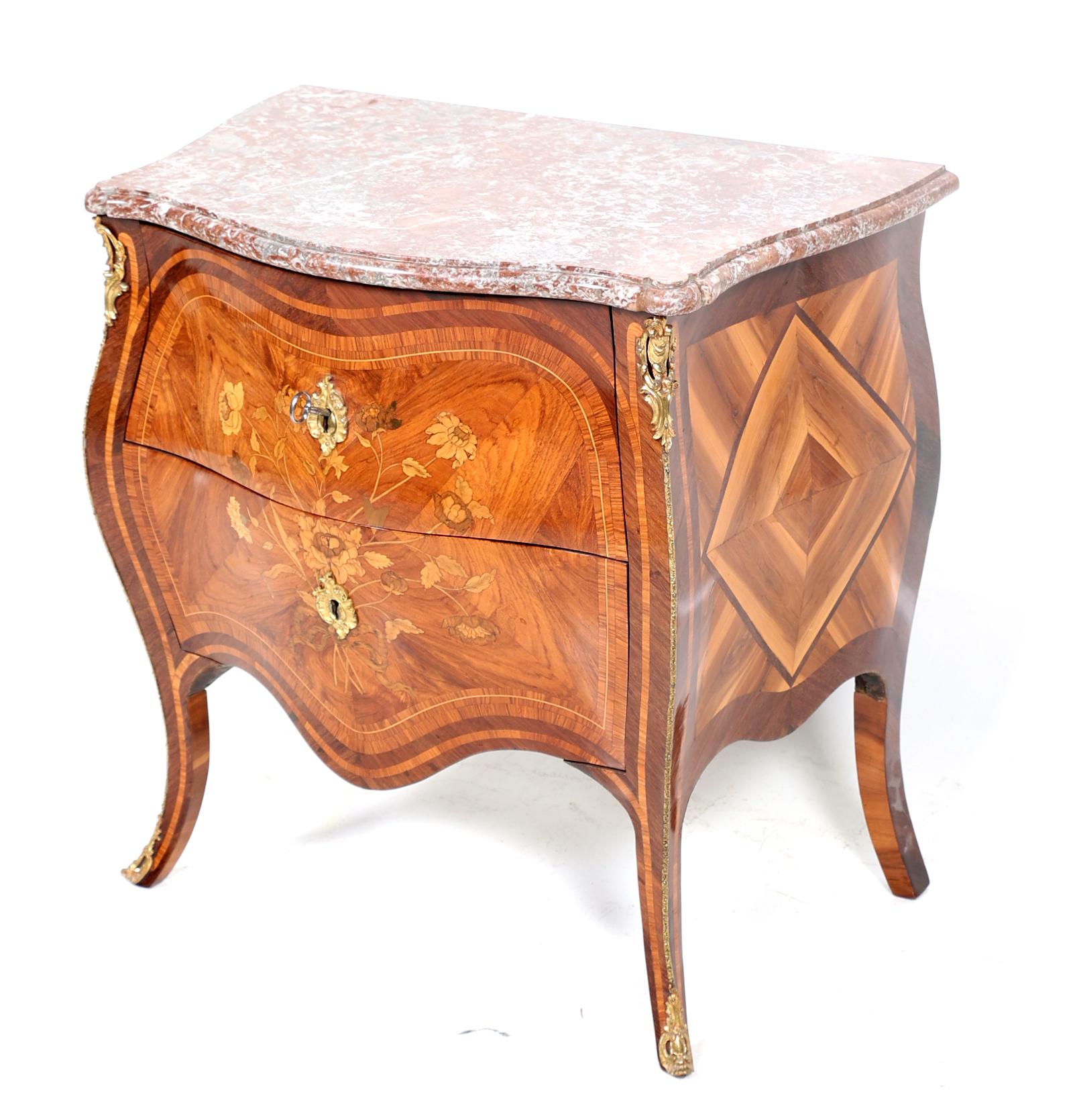 Louis Quinze Marqueterie commode, periode ca\.1770, eiken belijmd met amarant, rozenhout, pruimenhout, violethout en sycamore met een Rance marmeren blad, h\.81 x b\.83 x d\.46 cm\., gesigneerd 'JG'voor het Amsterdamse St\-Josephsgilde, literatuur : Th\. H\. Lunsigh Scheurleer, 'Het Amsterdamsche St\. Josefsgilde in het bijzonder met betrekking tot de meubelmakers', Historia Vol\.8 \(1942\), pp\.33\-45, provenance : Auction Mark van Waay, Amsterdam 1972, lot no\.3400 Staal Antiquairs Amsterdam 1972 Private collection The Netherlands 1972\-2006, Theo Daatselaar antiquairs 2006\- 2014, Private collection The Netherlands 2014\-2024\.