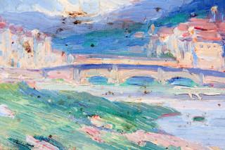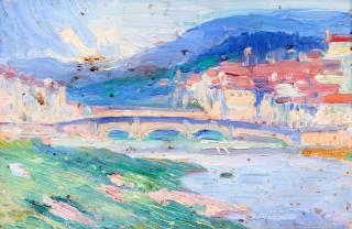 N.N., Riviergezicht met brug, maroefle, 21 x 15 cm.