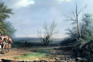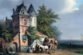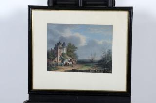 Ond. gesign., Landschap met paard, wagen en personen, gouache, 37 x 27 cm.