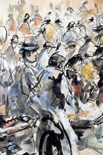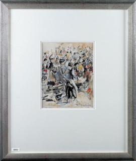 Marie Henri Mackenzie, Rotterdam 1878-1961 Hilversum, Bedrijvigheid op een markt in de Jodenhoek Amsterdam, aquarel, 27 x 21,5 cm.