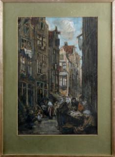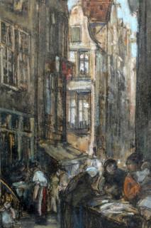 Dirk Schäfer, Markt met personen, krijttekening, 47 x 31 cm.