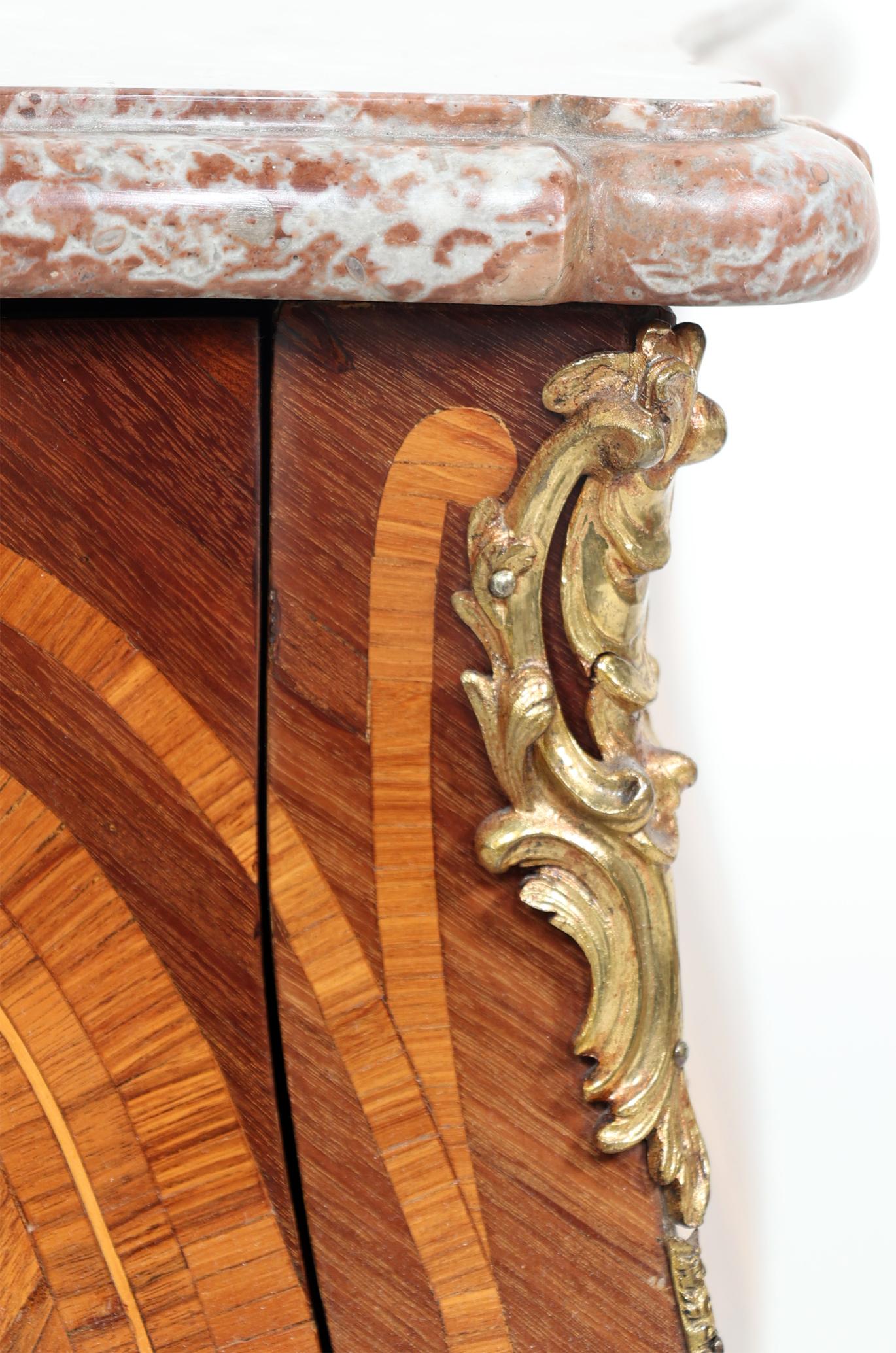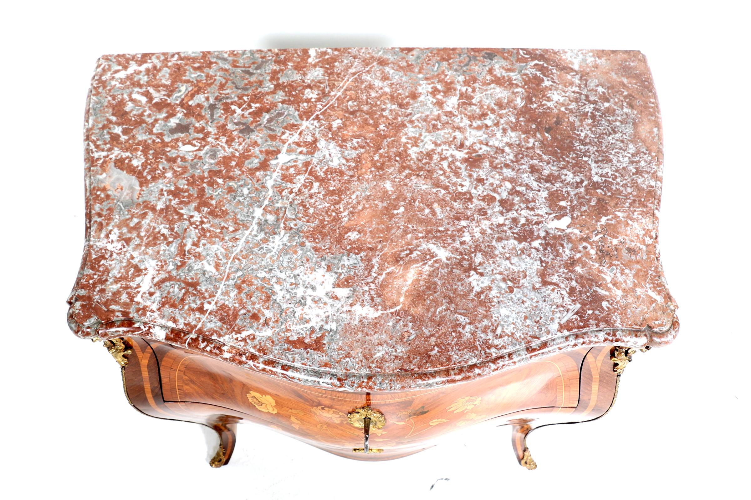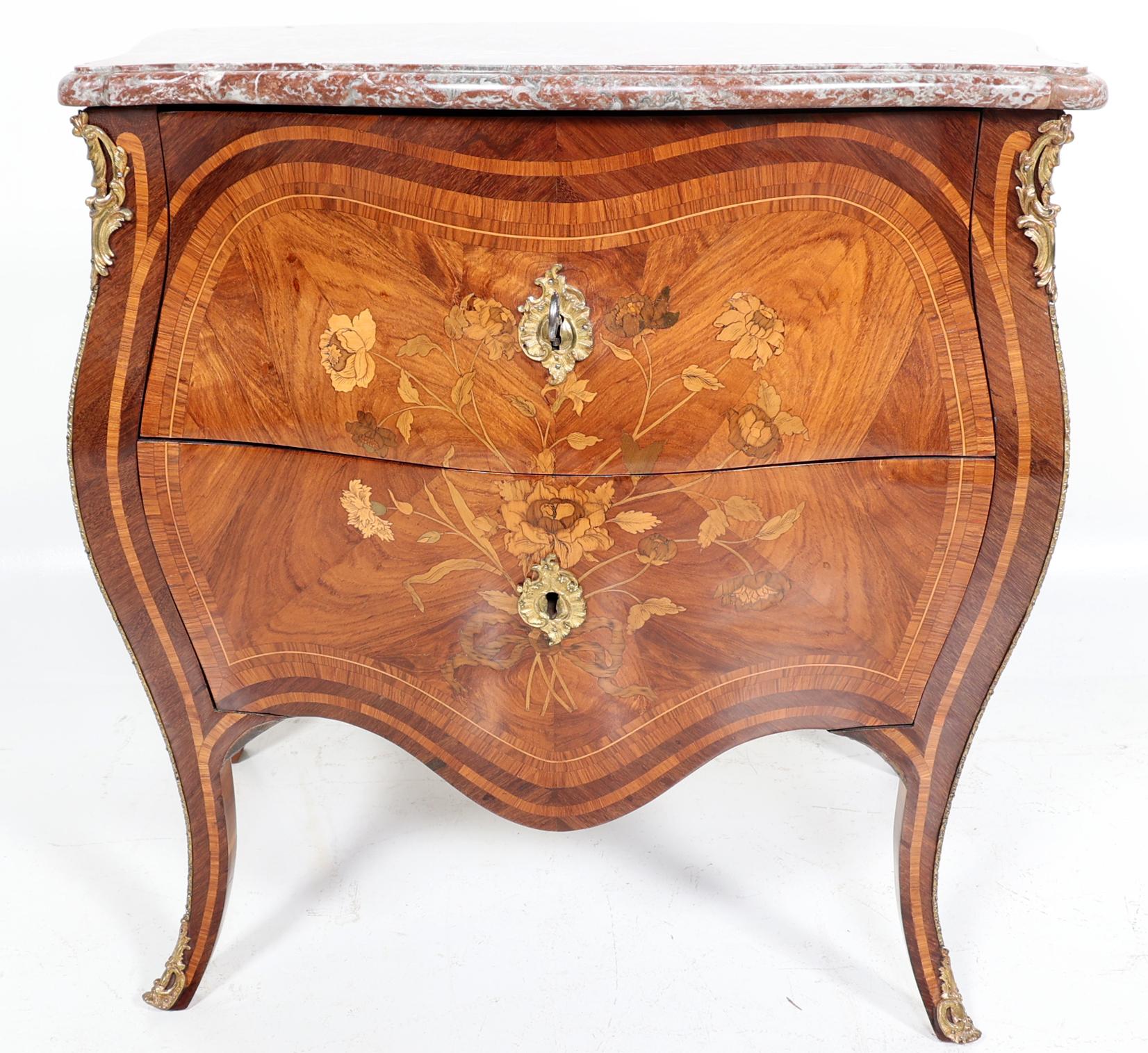 Louis Quinze Marqueterie commode, periode ca.1770, eiken belijmd met amarant, rozenhout, pruimenhout, violethout en sycamore met een Rance marmeren blad, h.81 x b.83 x d.46 cm., gesigneerd 'JG'voor het Amsterdamse St-Josephsgilde, literatuur : Th. H. Lunsigh Scheurleer, 'Het Amsterdamsche St. Josefsgilde in het bijzonder met betrekking tot de meubelmakers', Historia Vol.8 (1942), pp.33-45, provenance : Auction Mark van Waay, Amsterdam 1972, lot no.3400 Staal Antiquairs Amsterdam 1972 Private collection The Netherlands 1972-2006, Theo Daatselaar antiquairs 2006- 2014, Private collection The Netherlands 2014-2024.