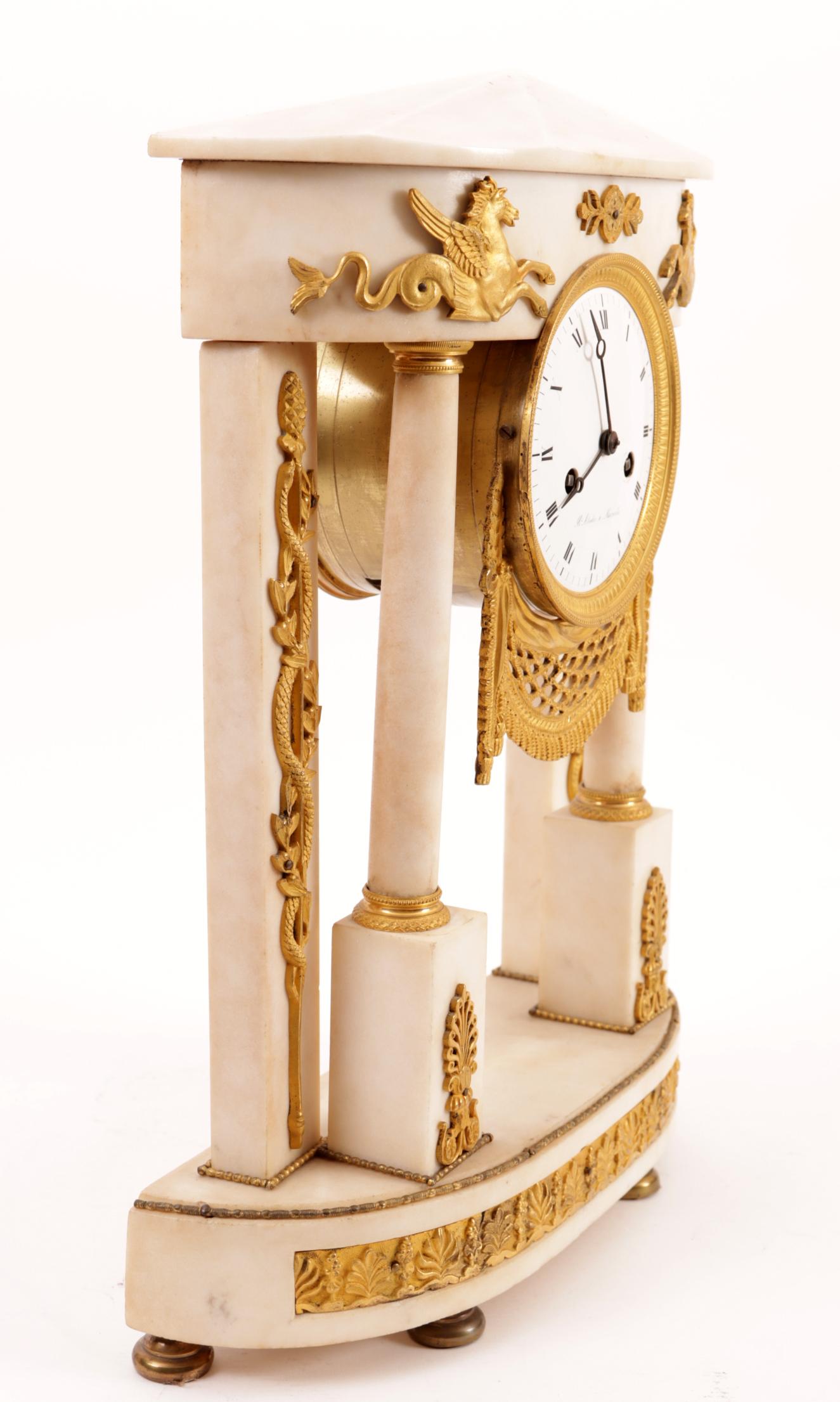 B. Abadie á Marseille, wit marmeren met vuurverguld bronzen beslag gedecoreerde Louis Seize zuilen pendule, h.44 cm.