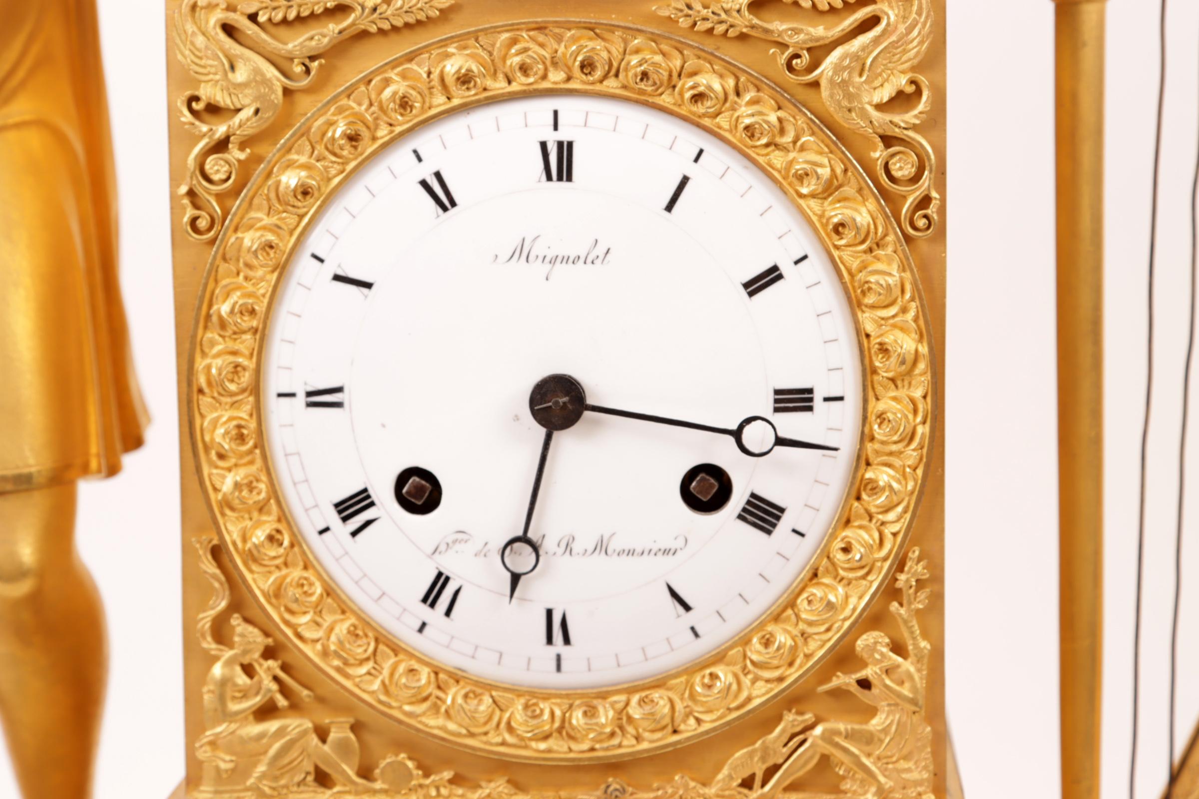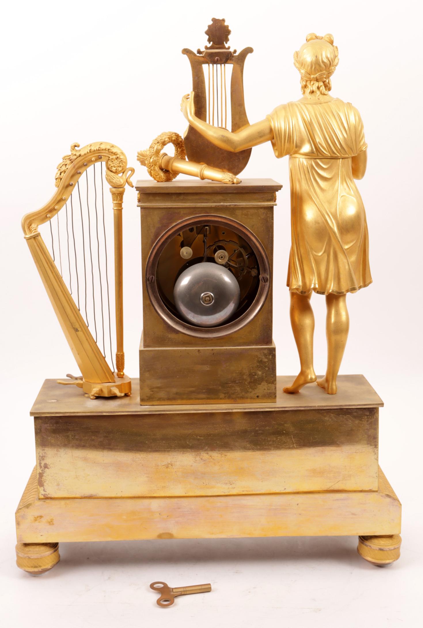 Miqnolet, vuurvergulde Frans bronzen Empire pendule met naast het uurwerk een harpiste, h.52 x b.36 x d.12 cm.