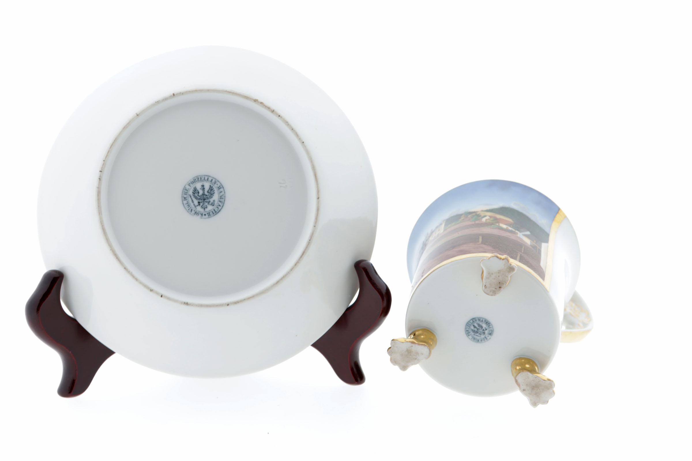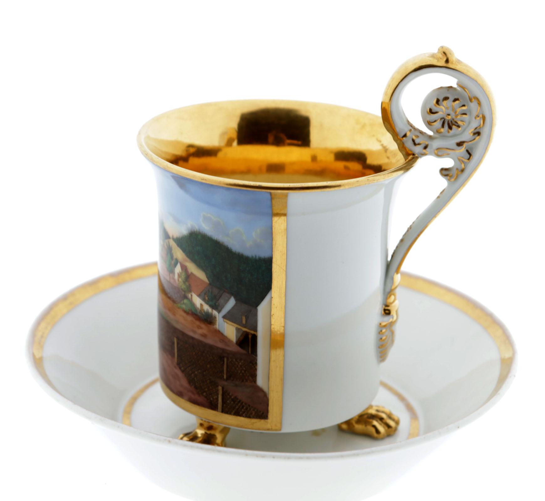 KPM Duitsland, met landhuis in landschap gedecoreerde Biedermeier kop en schotel rustend op klauwpootjes