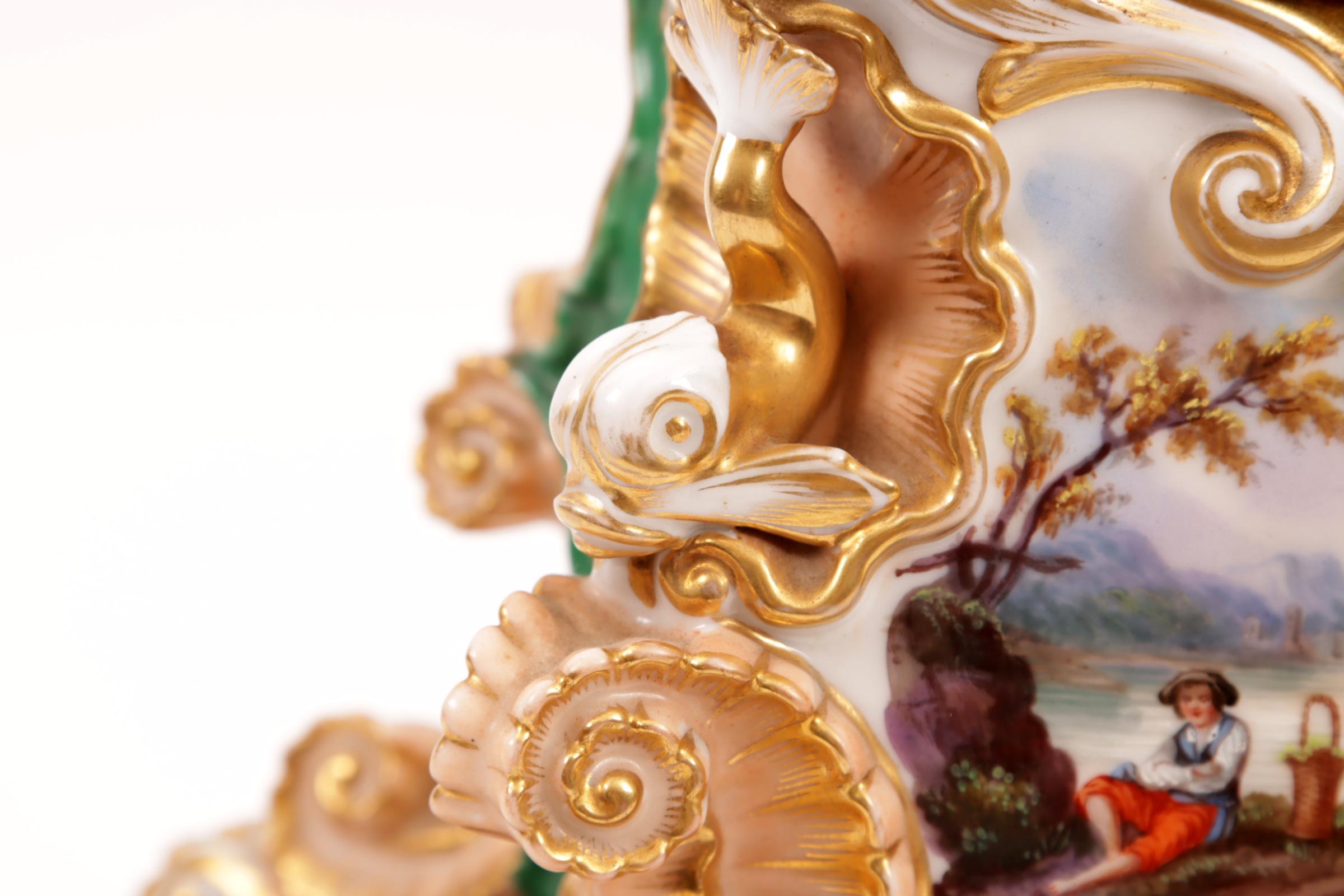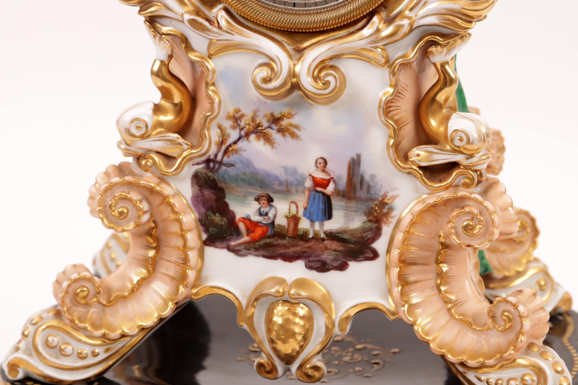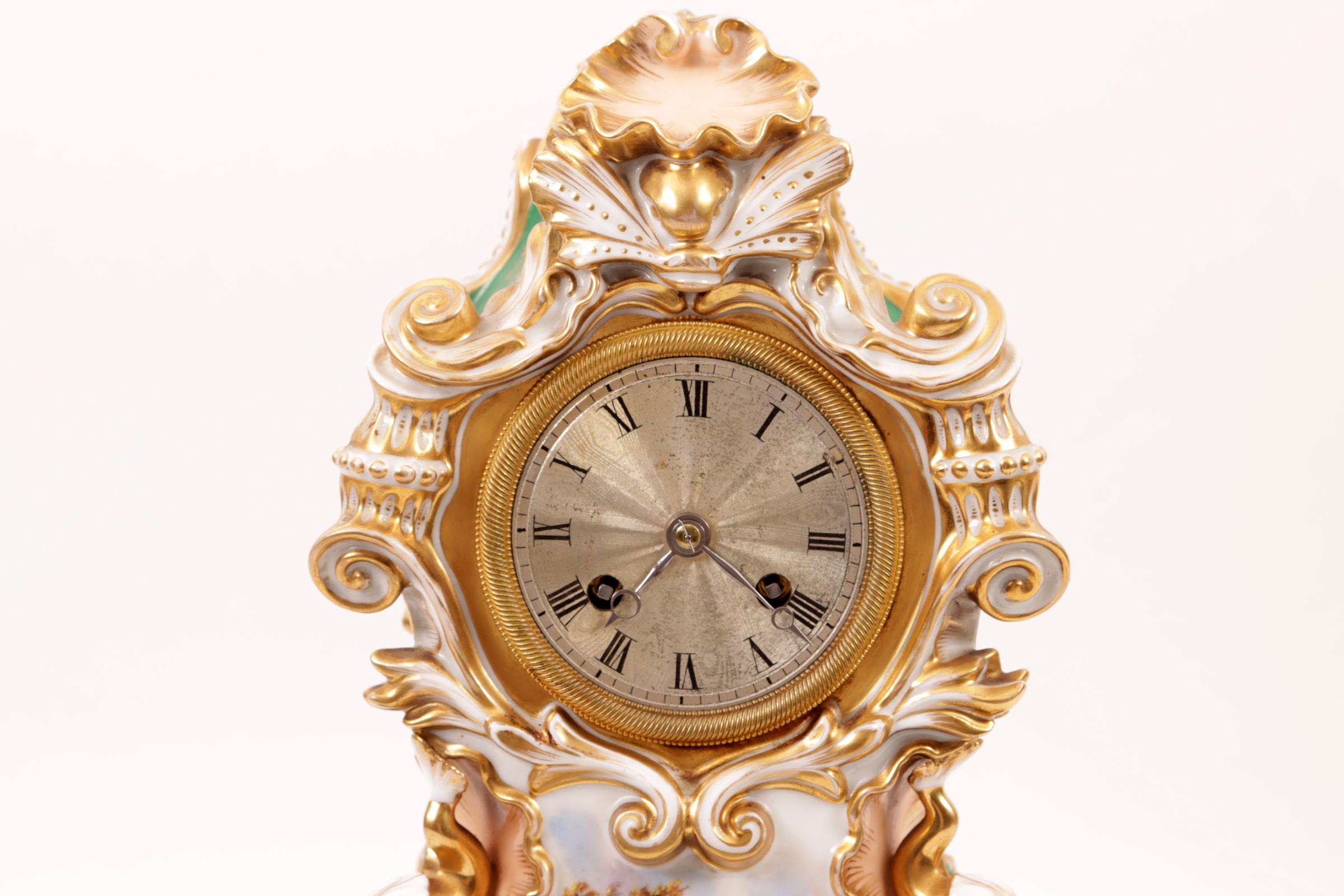 Met bloemen en personen in landschap gedecoreerde porseleinen klok rustend op porseleinen onderstel, h.39 cm.