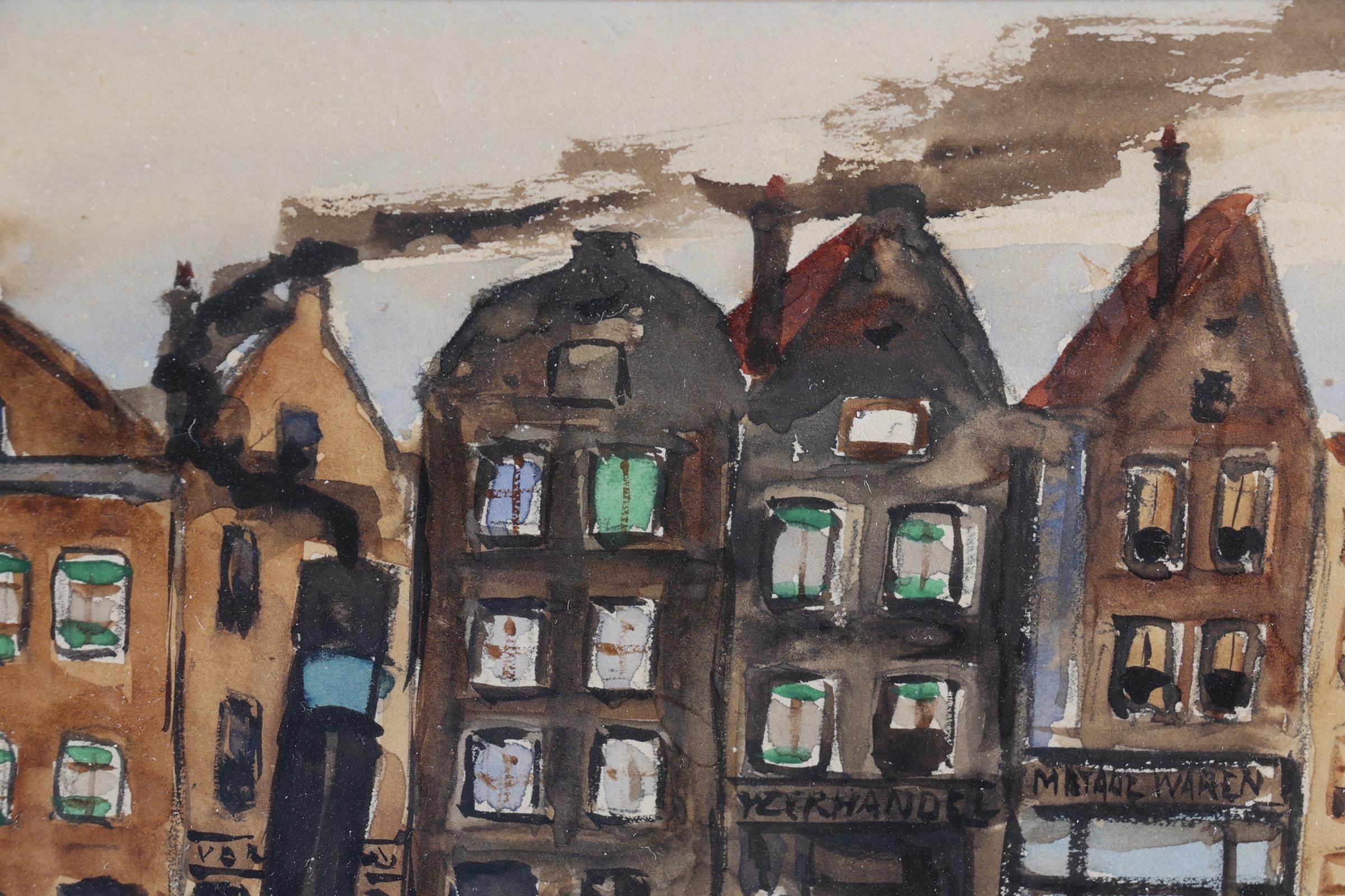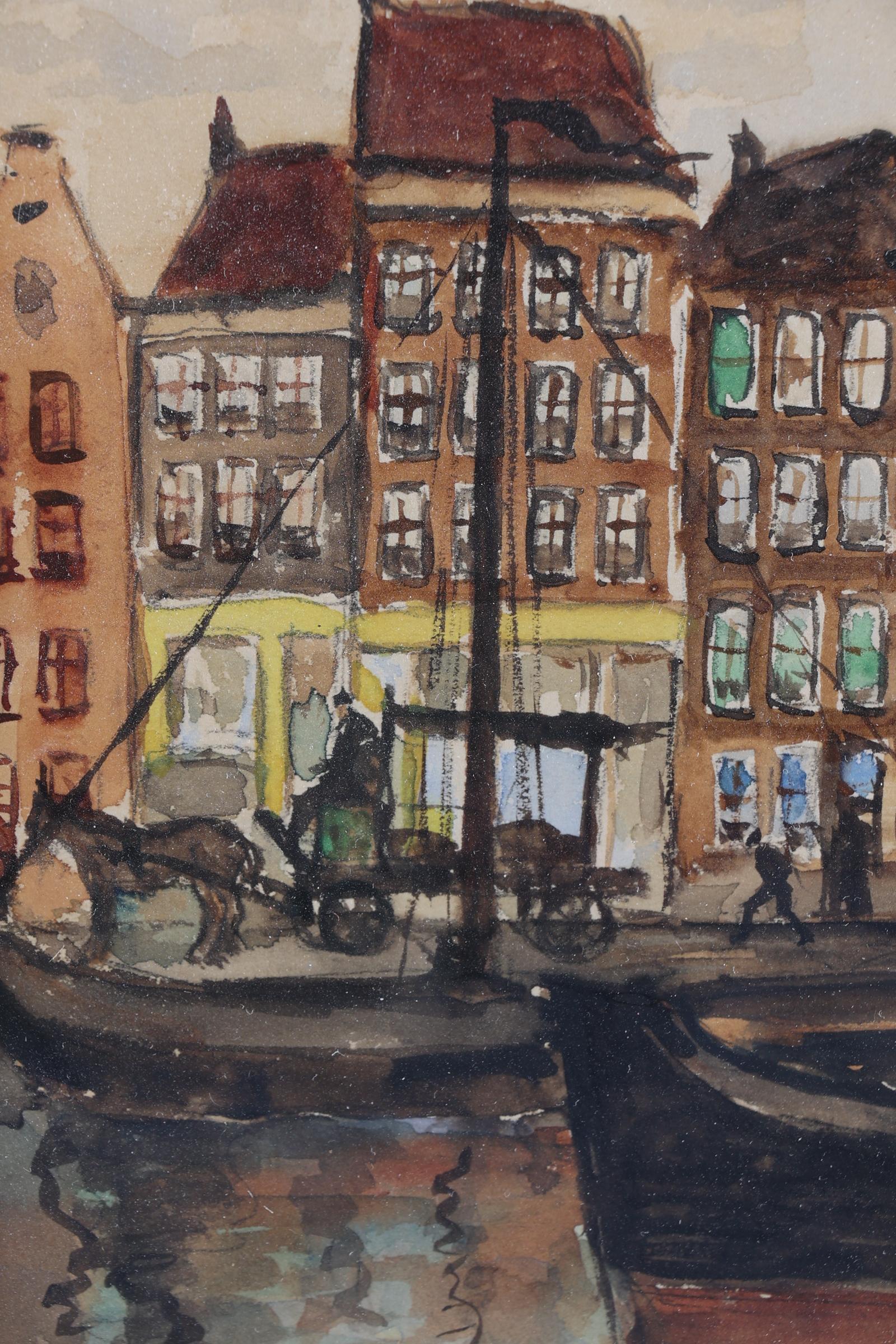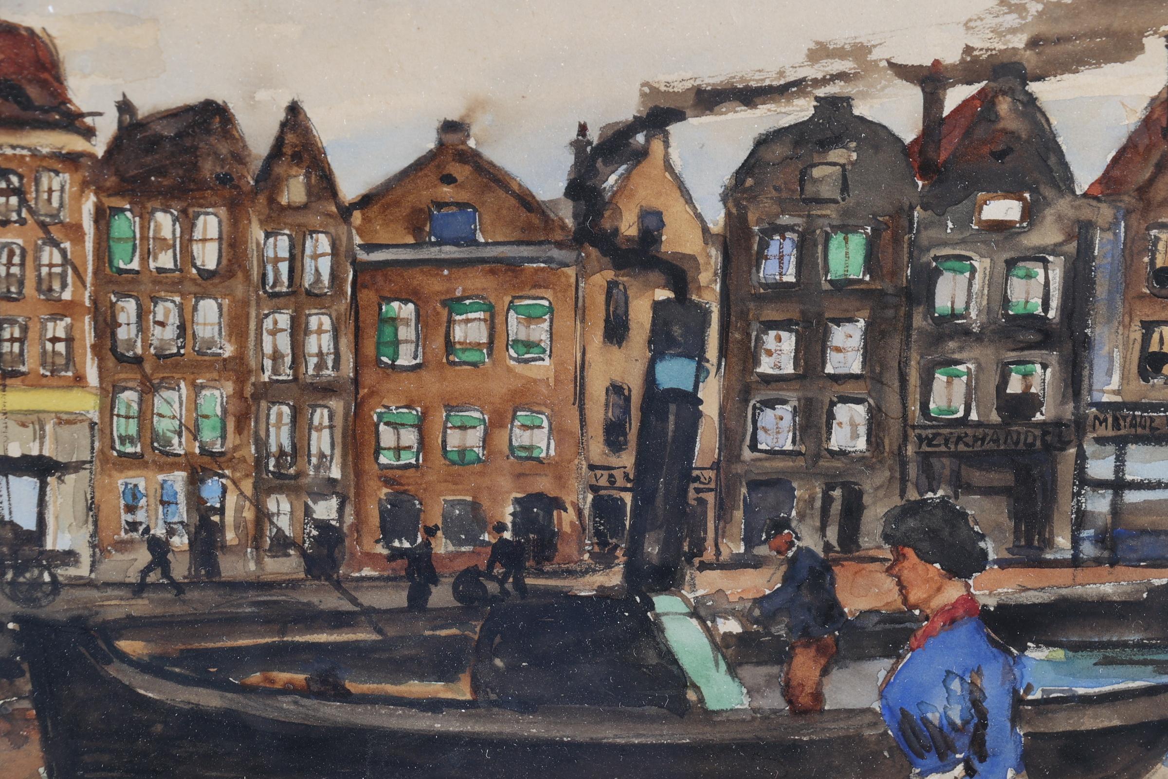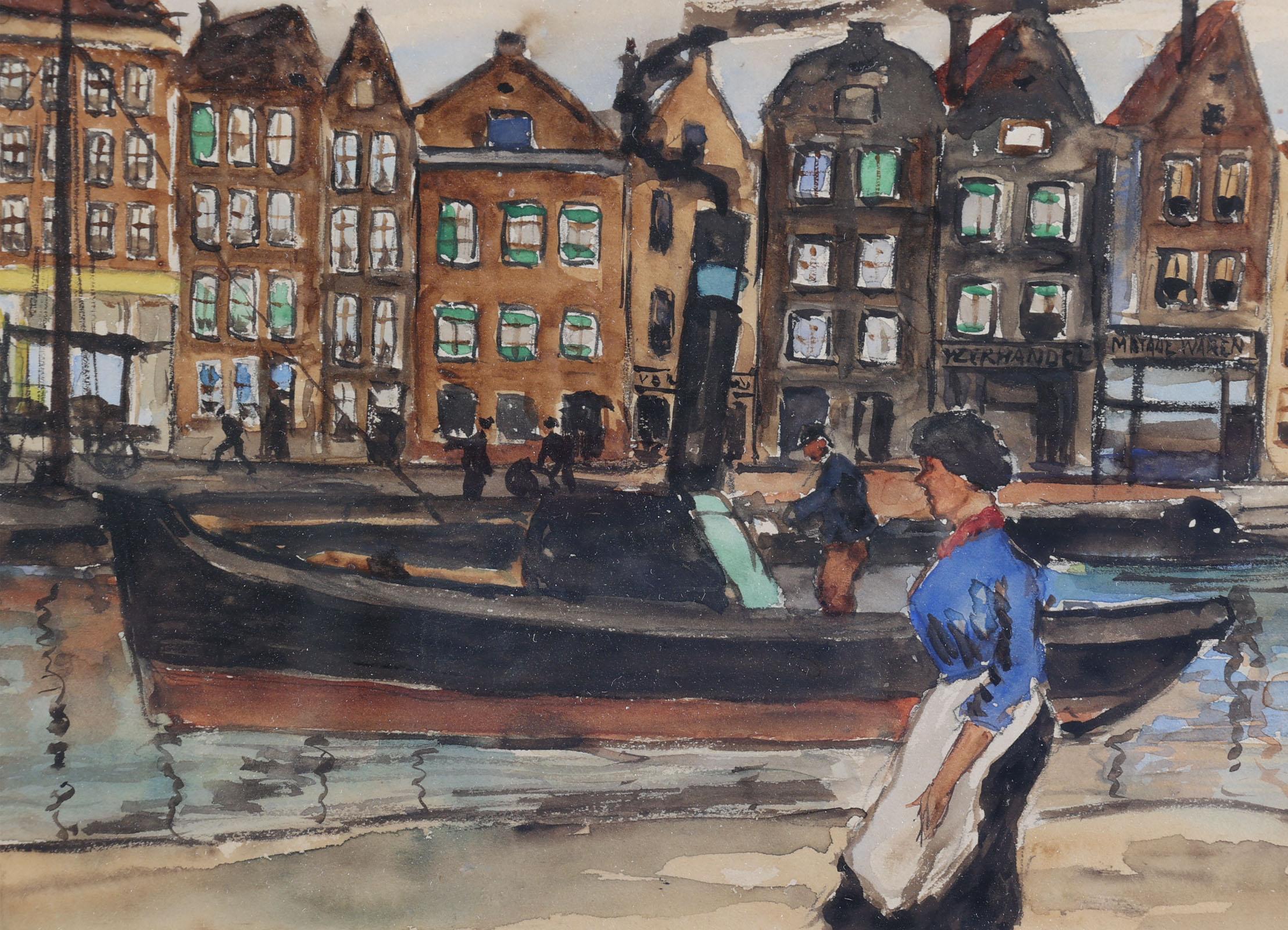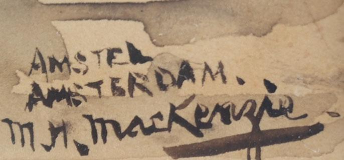 Marie Henri Mackenzie (1878-1961), Stoomboot op de Amstel van Amsterdam met diverse personen op de kade, gouache op papier, 30 x 18 cm., provenance particuliere collectie, note : geschonken in Hilversum, 17 april 1943 als dank
