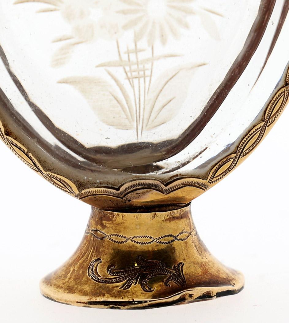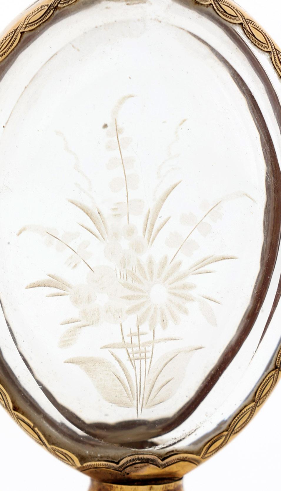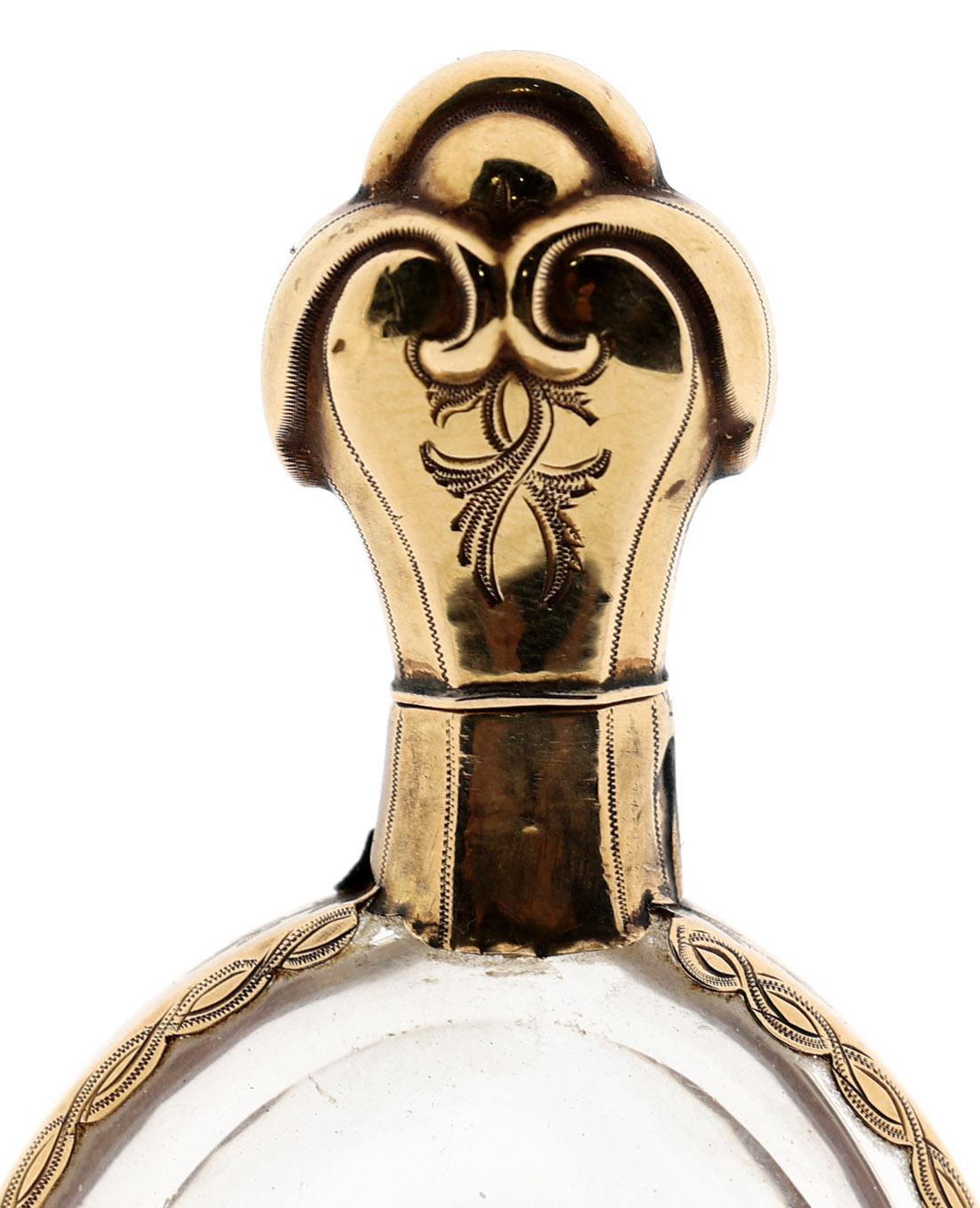 Antieke ovale met bloemen gegraveerde odeurflacon met gouden monturen en dop, Holland gekeurd, 2e helft 19e eeuw, h.10,2 cm.