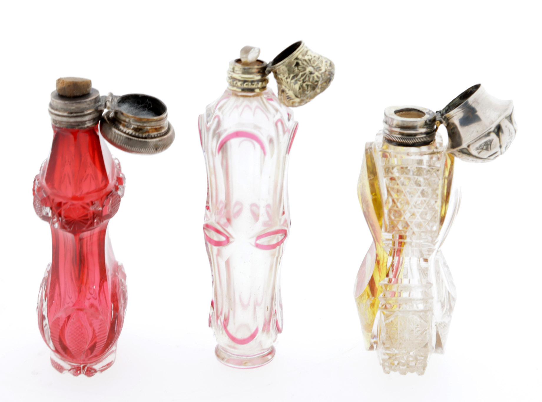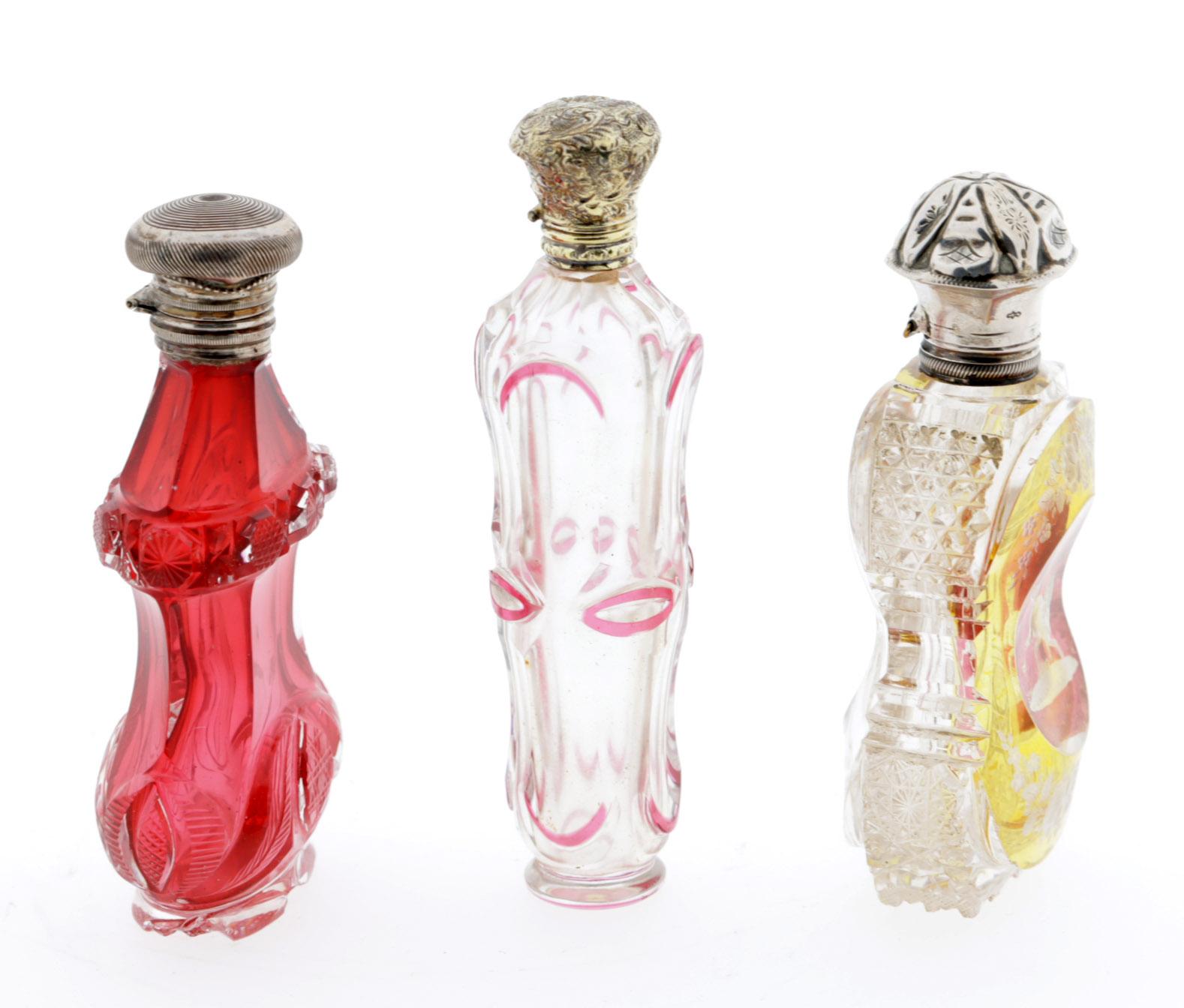 Antieke rood met roze overlay kristallen odeurflacons, Frankrijk 19e eeuw, h.10,7 cm., rode deurflacon met zilveren dop, Nederlands, 19e eeuw en een gele met paard gegraveerde odeurflacon met zilveren dop, Nederland, 19e eeuw