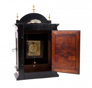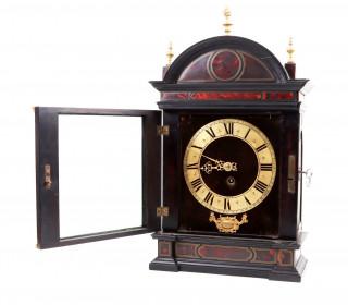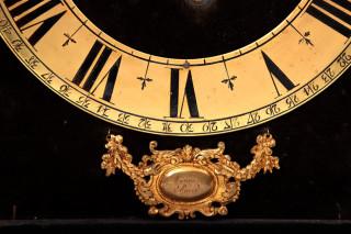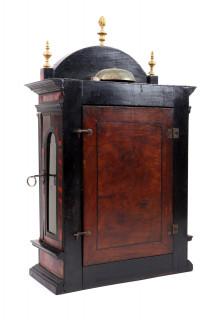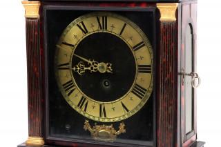 Franse Louis XIV pendule religieuse, Marguerite à Paris, circa 1675, gesigneerd op de wijzerplaat en op het uurwerk, met een schildpad en ebbenhouten kast, koperen cijferring en naamplaatje met fluwelen bekleding op de wijzerplaat en vergulde bronzen kapitelen en basementen, met een eveneens met schildpad en koper ingelegde toog, weekklok op een veerton, voorgaand en slagwerk, h.54 cm. Literatuur: Tardy, Dictionnaire des Horlogers Français, Paris, 1971, p.433 / R. Plomp, Early French Pendulum Clocks, 1658-1700, known as Pendules Religieuses, 2009