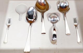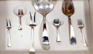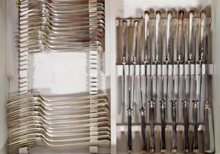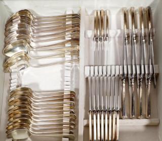 2 Bestekcassettes met 2e gehalte zilveren 105-delig bestek, Haags Lofje, totaalgewicht messen 2257 gram, totaalgewicht massief zilveren bestek 3341 gram