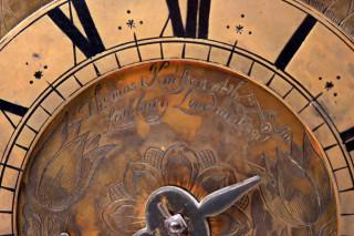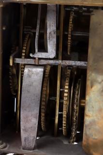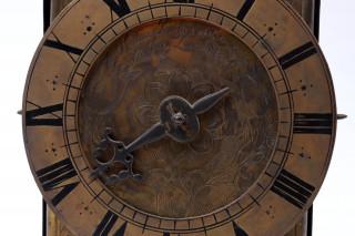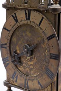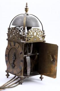 Engelse lantaarnklok met balans, Thomas Knifton at the Cross Keys in Lothbury fecit ca.1645 (balansgang gereconstrueerd), signatuur op de met tulpen en Tudor rozen gegraveerde grondplaat, waarop een verzilverde cijverring, h.38 cm.