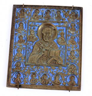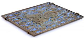 Antieke deels geëmailleerde Russische reisikoon, 14,5 x 12,5 cm.