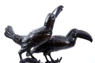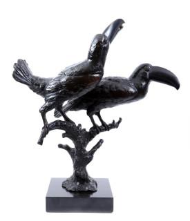 Anton Büschelberger (1869-1934), bronzen sculptuur van twee Natterers pepervreter (Selenidera nattereri) op boomstronk en rustend op een zwart marmeren voetstuk, h.64 cm.