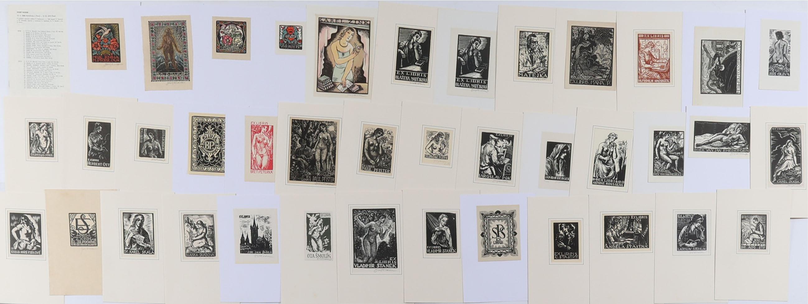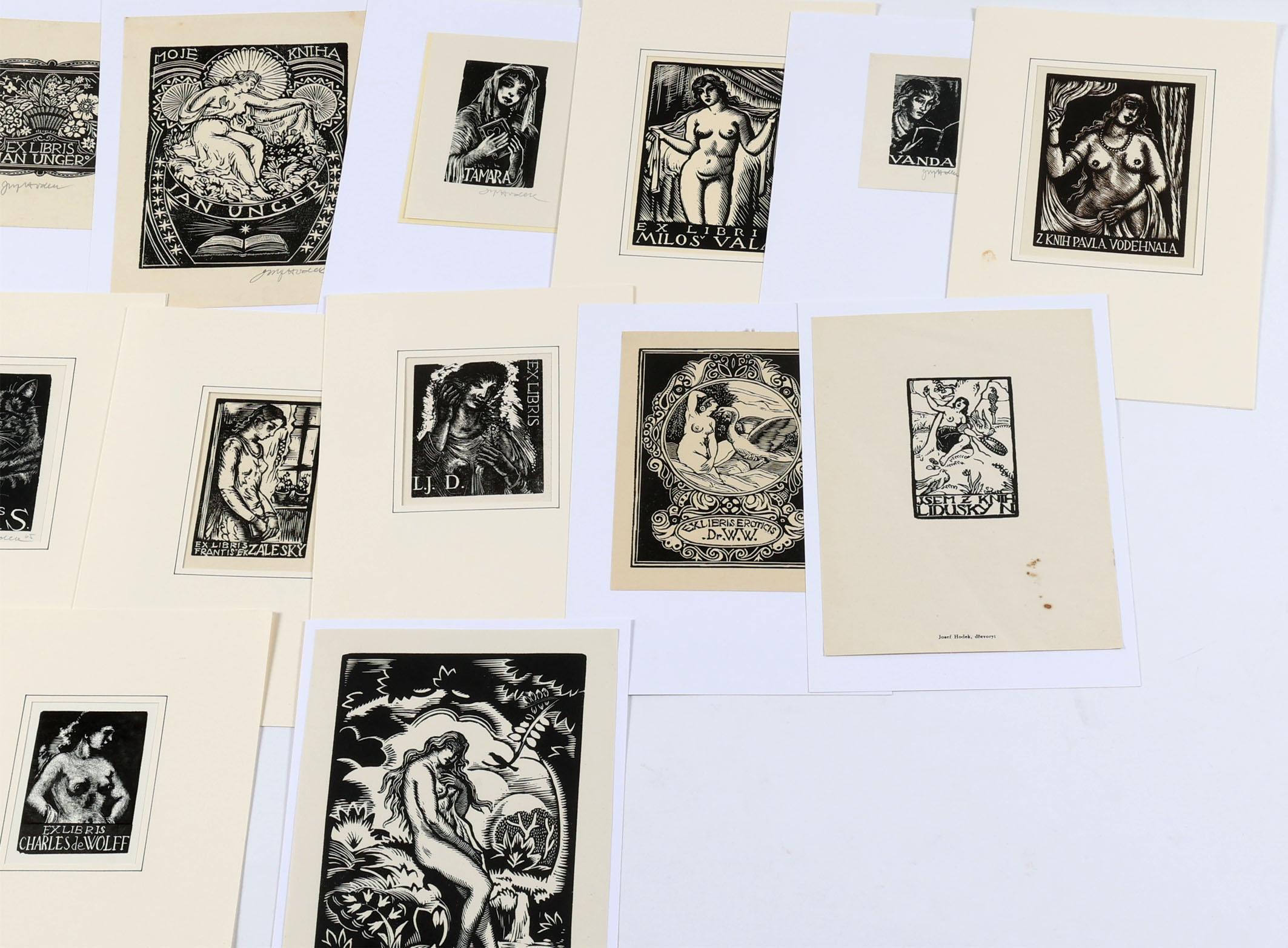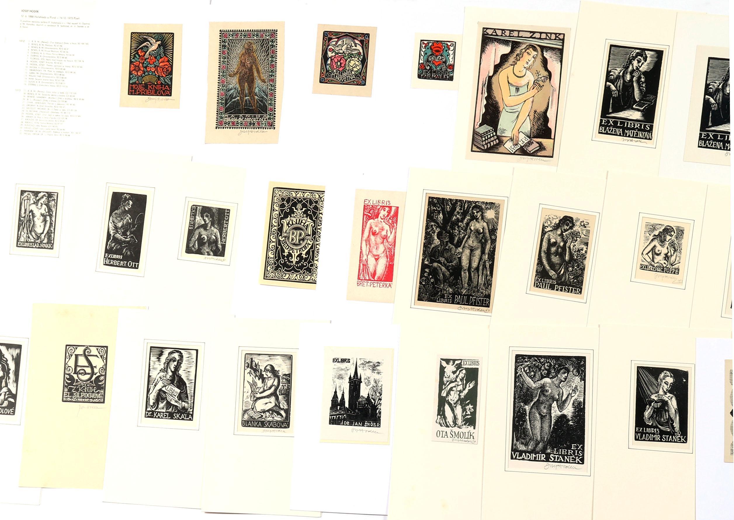 Hodek, J., plm 60 exlibris, X1/X2, enkele meerkleuren, deels gesigneerd, deels opgeplakt