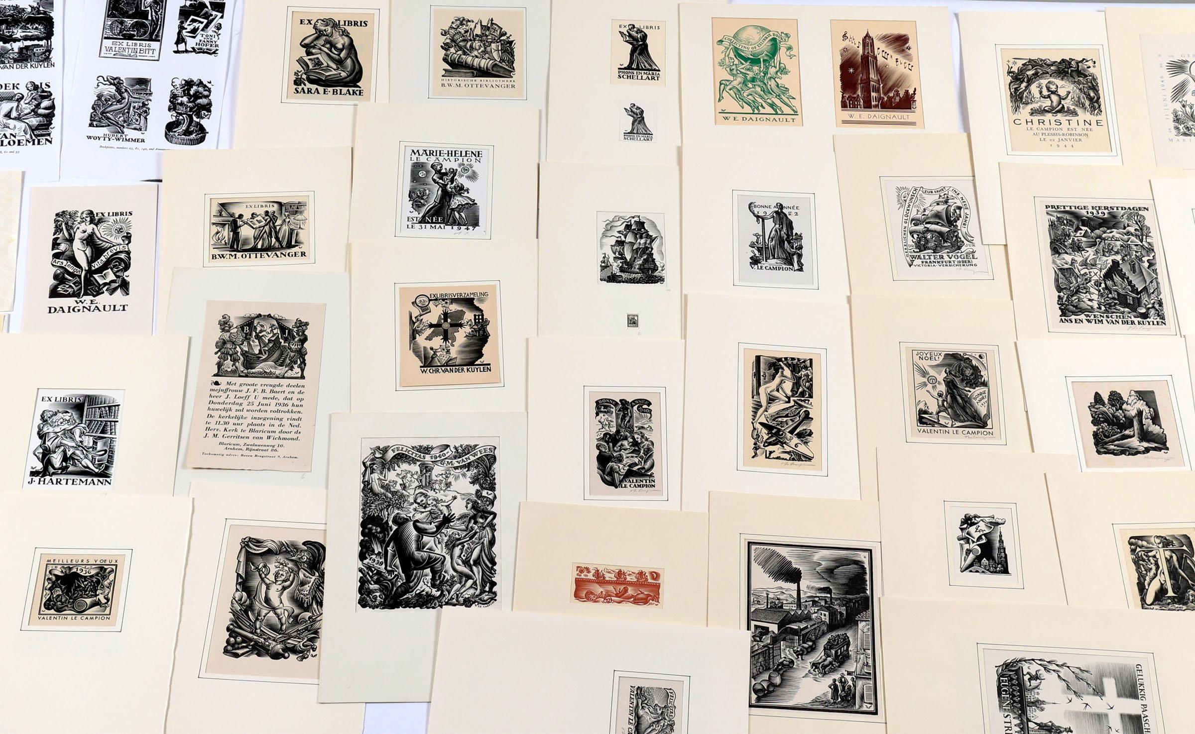 Campion, V. le, plm. 45 exlibris en kleingrafiek (vooral kleingrafiek), X2, in pass-partout, met werklijst etc., enkele gesigneerd